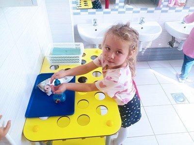 Dnia 03.09.2021r. przedszkolaki z grupy "Tęczowe Nutki" i "Biedronki" realizując ogólnoposki program edukacyjny "Skąd się biorą produkty ekologiczne" przypomnialy sobie zasady dbania o higienę rąk i całego ciała. Dzieci wiedzą jak ważne jest mycie rąk i potrafią wymienić sytuacje...