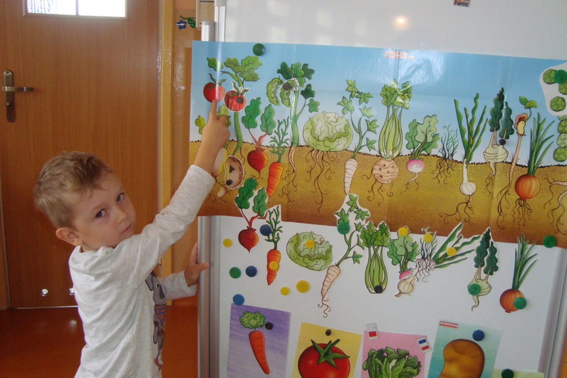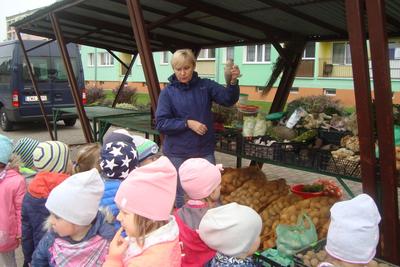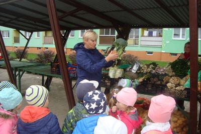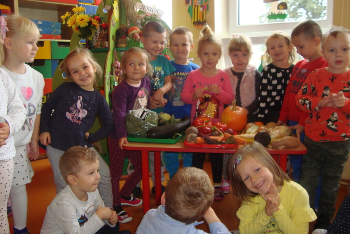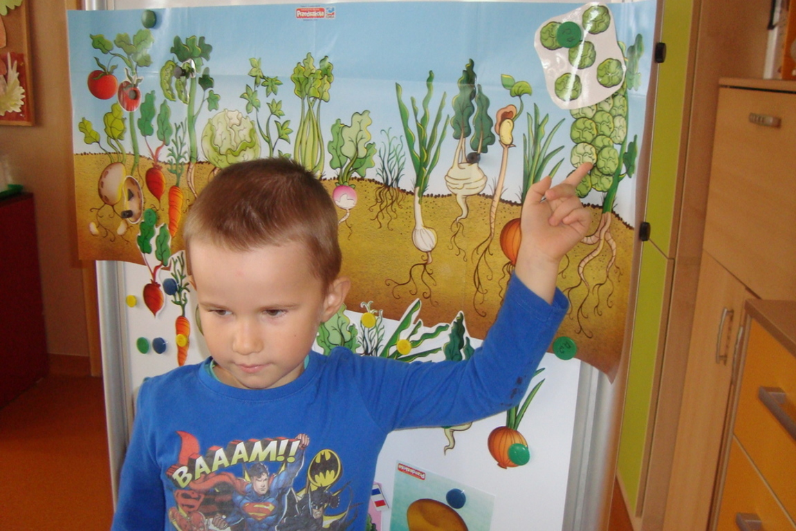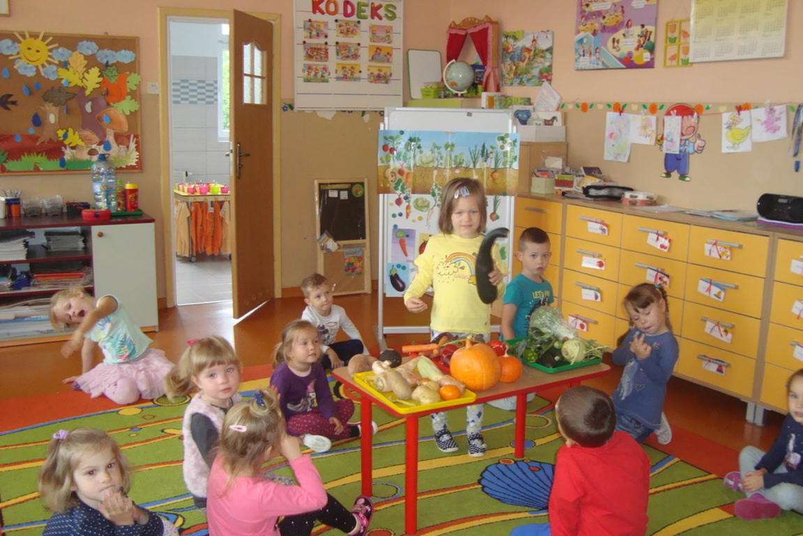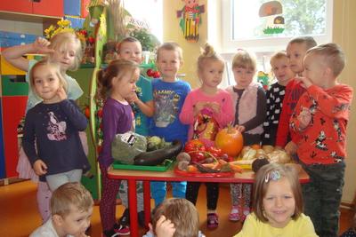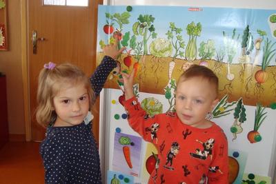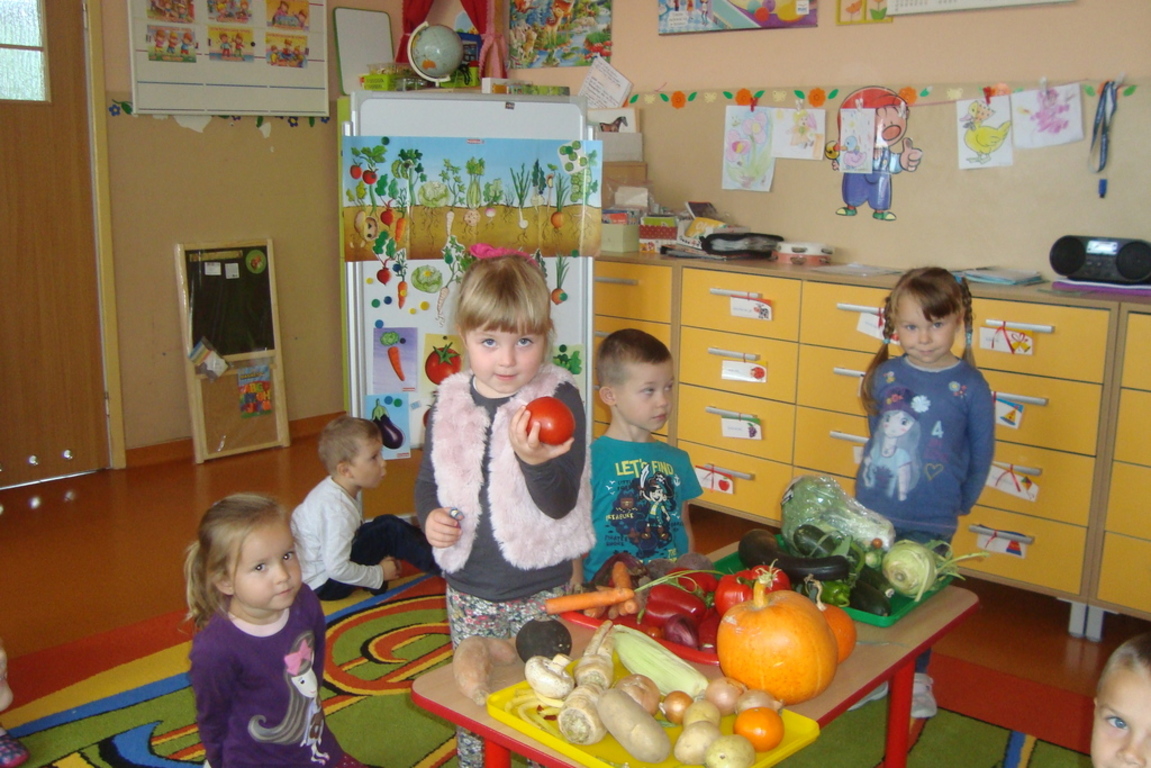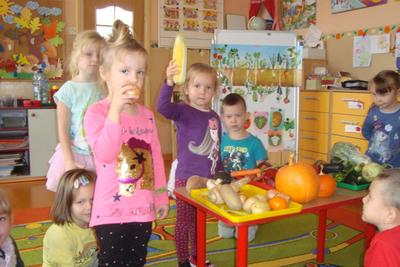 Wszyscy wiemy, że warzywa i owoce są zdrowe i powinniśmy spożywać ich jak najwięcej. Jesienią i zimą są szczególnie ważne – słońca jest jak na lekarstwo, a o przeziębienie nietrudno. A to właśnie z owoców i warzyw nasz organizm czerpie najwięcej witamin i składników mineralnych, odpowiedzialnych za naszą odporność. Biedronki poznawały nazwy warzyw i owoców poprzez wzbogacenie kącika przyrody w dary jesieni z sadów i ogrodów. Dzieci dowiedziały się, skąd się biorą warzywa, które części poszczególnych warzyw są jadalne. Byliśmy również na straganie z owocami i warzywami, gdzie poznały kształty i kolory poszczególnych warzyw i owoców. Dzieci miały również okazję do poznania smaków różnych warzyw i owoców, często nowych i nieznanych. Dowiedziały się, że warzywa w postaci surowej są najzdrowsze, mają najwięcej witamin. Witaminy są niezbędne do ich prawidłowego rozwoju, zachowania zdrowia i energii do zabawy, odpowiadają za ich odporność, która jesienią, gdy jest chłodno, a pogoda zmienna, jest najbardziej zagrożona. Przyniesione warzywa posłużyły nam również do przeliczania, tworzenia zbiorów, utrwalenia kolorów.