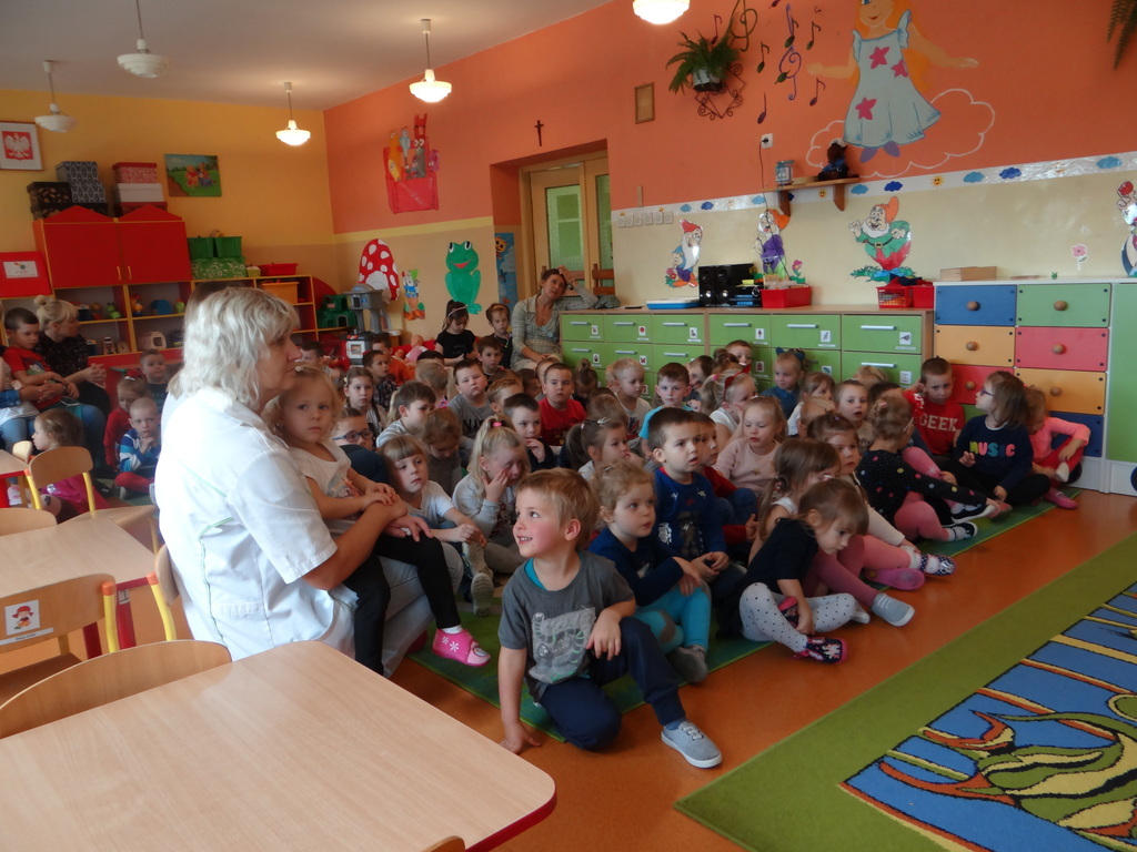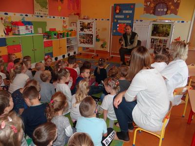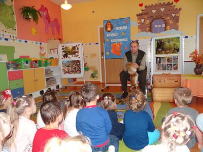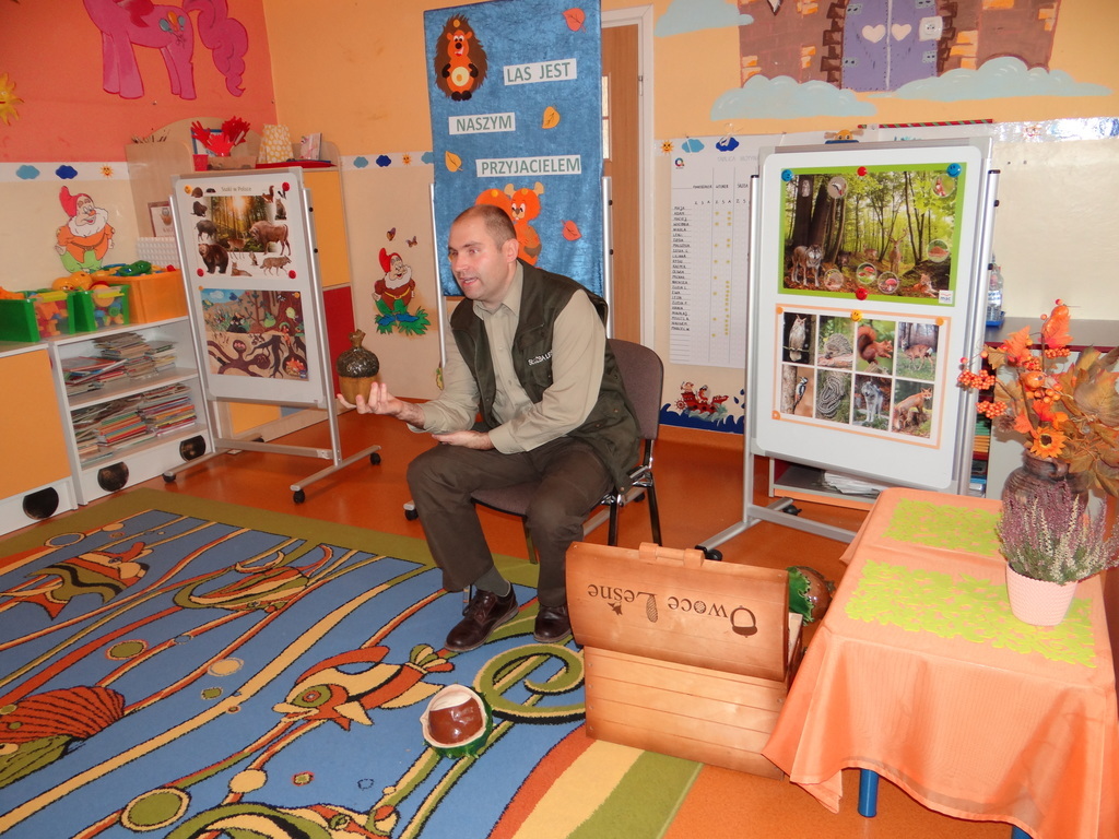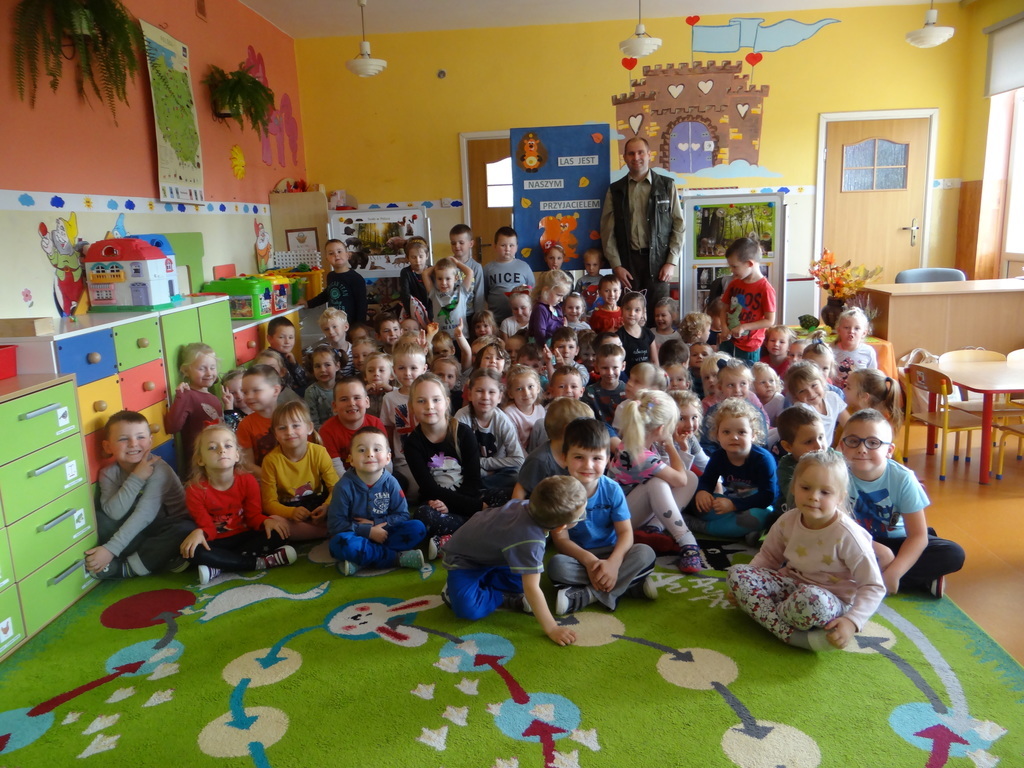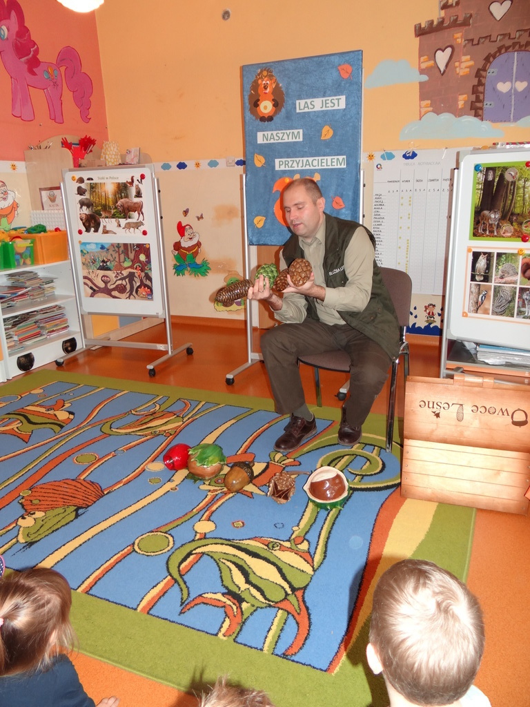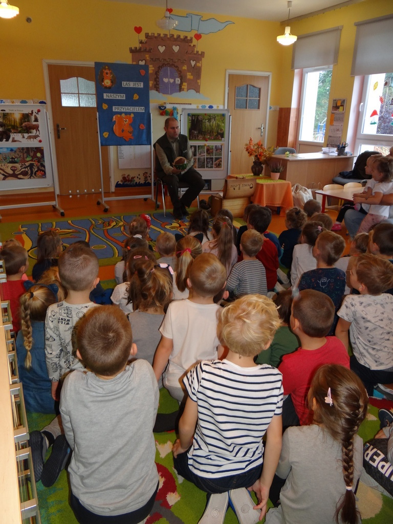 W dniu 18 października 2019 r. z inicjatywy pani Izabeli do naszego przedszkola przybył pan Michał - pracownik  Nadleśnictwa w Mirosławcu. Podczas spotkania mieliśmy okazję dokładnie obejrzeć poszczególne rodzaje drzew, ich nasiona, dotknąć je  i poczuć zapach. Zgłębiliśmy naszą wiedzę dotyczącą leśnych zwierząt. Wiemy, że człowiek jest gościem w lesie i musi szanować zwyczaje gospodarzy, czyli zwierząt w nim mieszkających. Uczestnicy spotkania dowiedzieli się także, w jaki sposób pomóc dzikim istotom przetrwać zimę i dlaczego niektóre z nich  gromadzą zapasy, a inne zapadają w sen zimowy. Na koniec spotkania dzieci miały możliwość zadawania pytań i ochoczo z tej możliwości skorzystały. Pytania były przeróżne. Dzięki tym zajęciom dzieci poszerzyły wiadomości o lesie i jego mieszkańcach. Lepiej poznały zasady ochrony przyrody i opieki nad zwierzętami i ptakami w okresie zimowym. Bardzo serdecznie podziękowaliśmy gościowi  za tak ciekawe spotkanie.