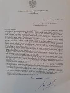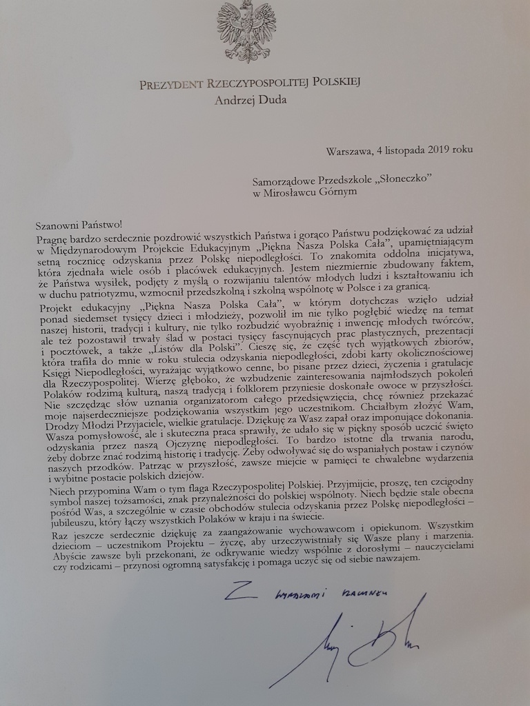 Nasze przedszkole otrzymało przesyłkę z Kancelarii Prezydenta Rzeczypospolitej Polskiej za udział w międzynarodowym projekcie edukacyjnym " Piękna Nasza Polska Cała". Słowa Prezydenta są dla nas dużym motywatorem do prowadzenia kolejnych innowacji w naszym przedszkolu. Flaga, którą otrzymaliśmy znajdzie honorowe miejsce podczas obchodów świąt narodowych. Dziękujemy za okazaną życzliwość i docenienie naszych działań.