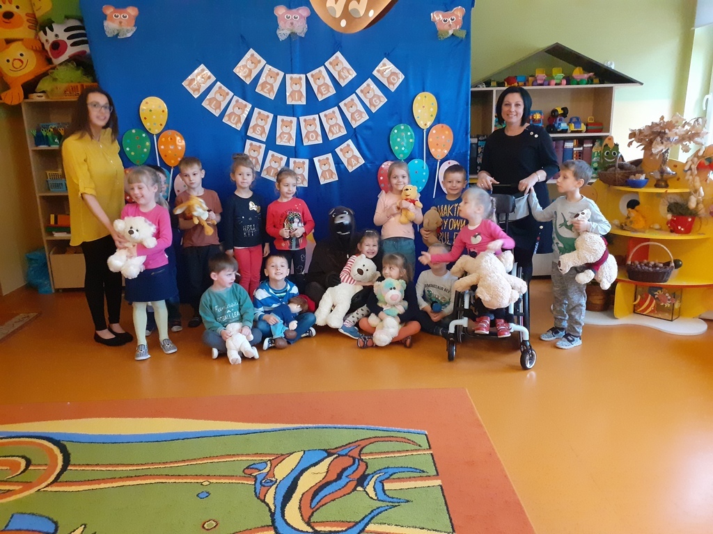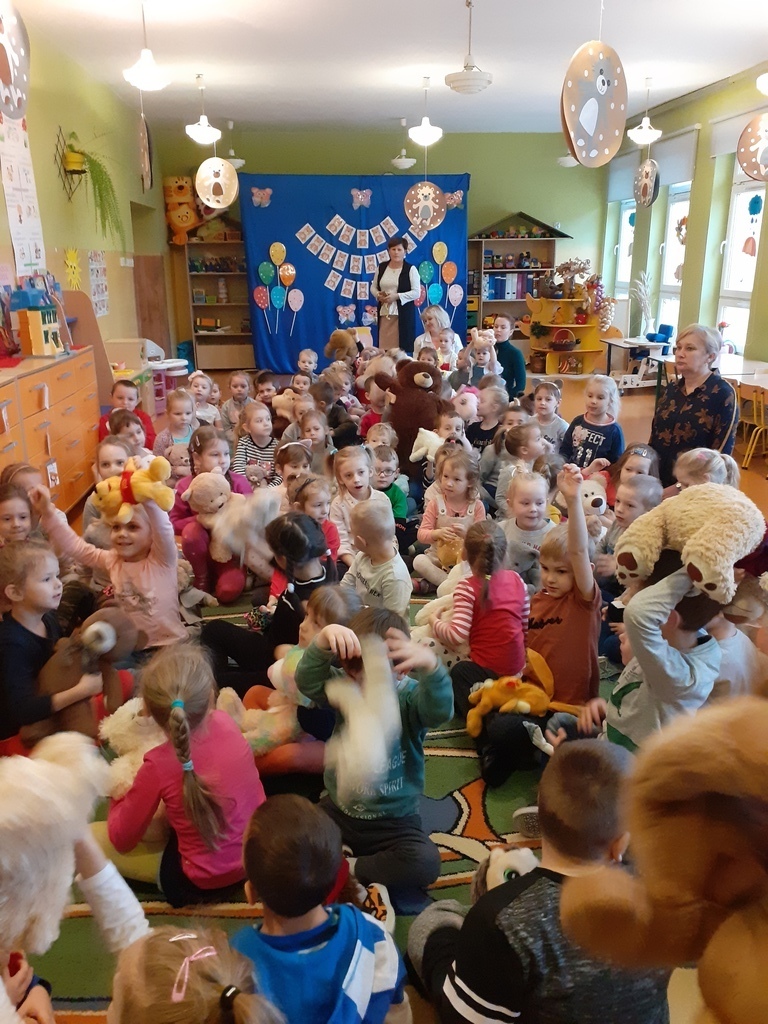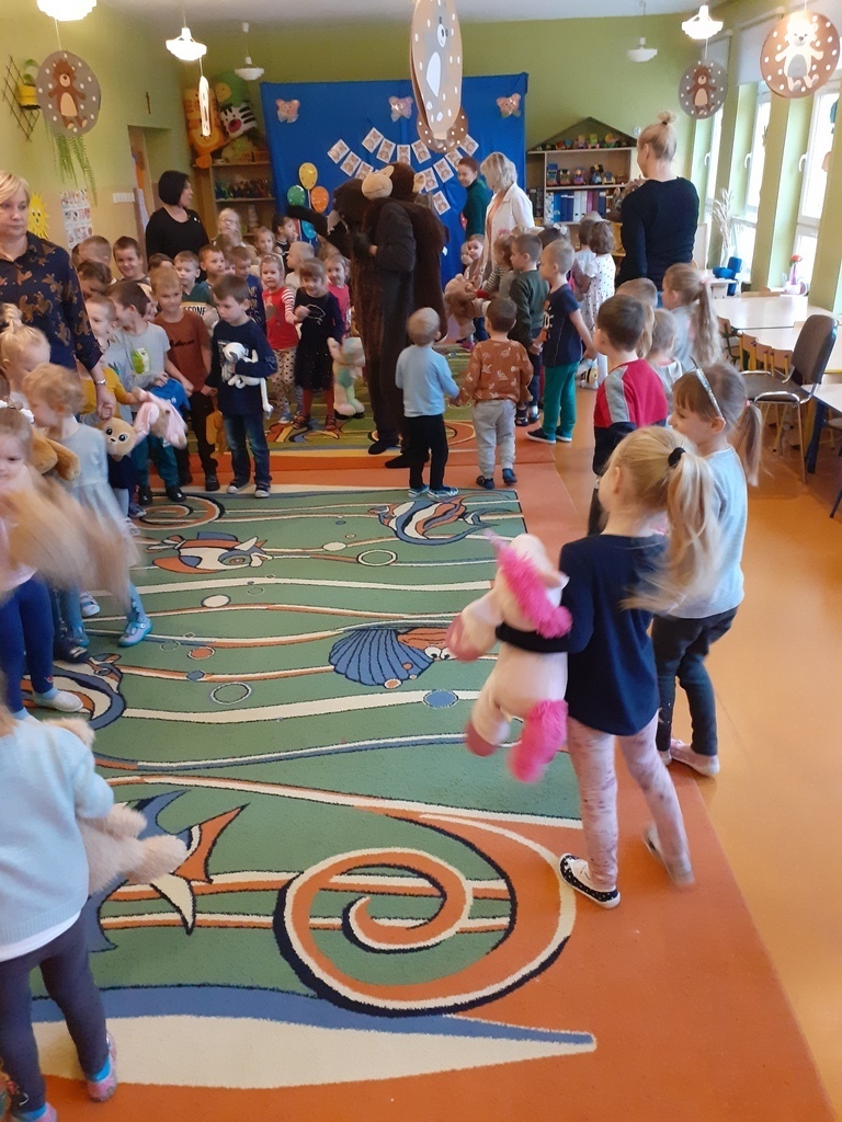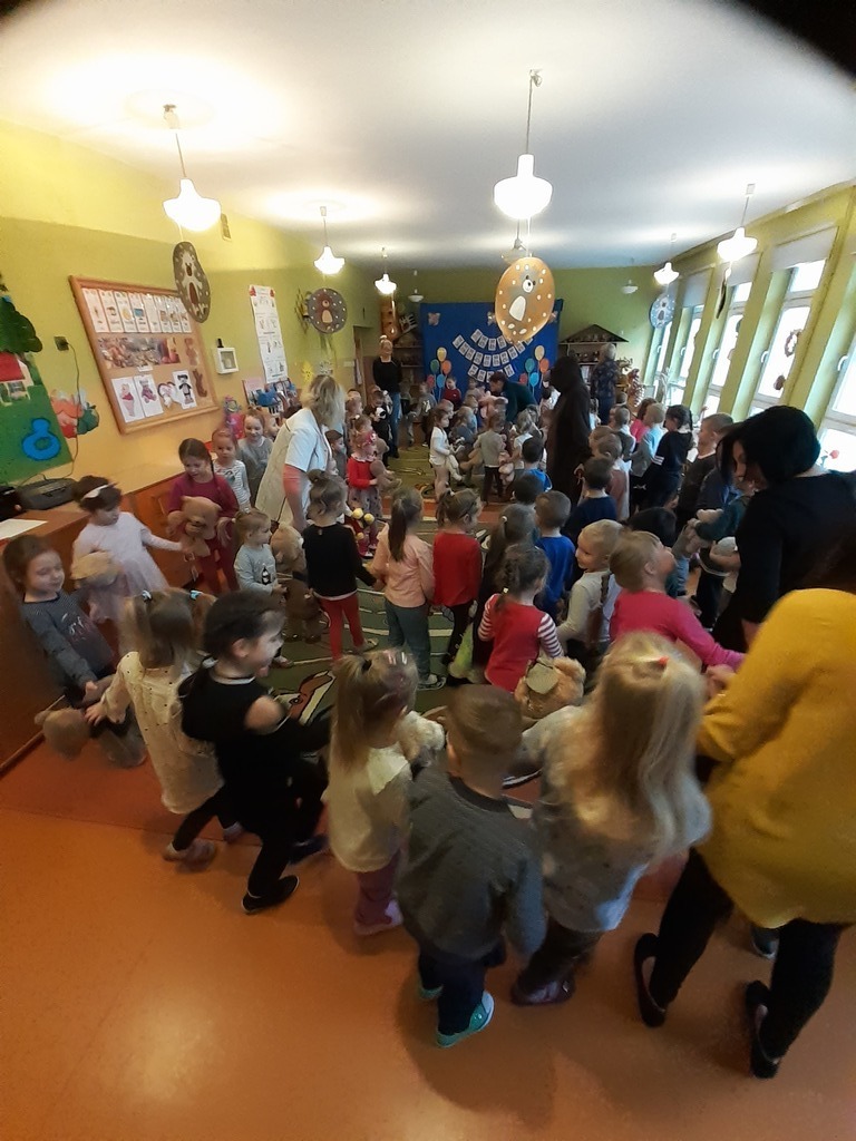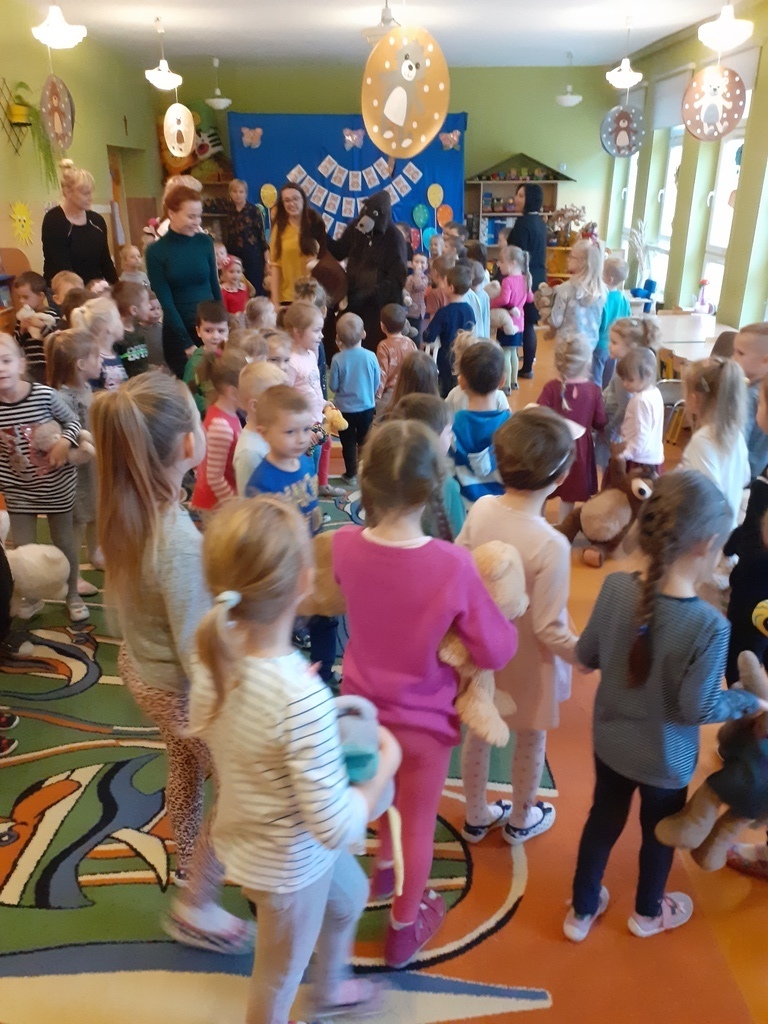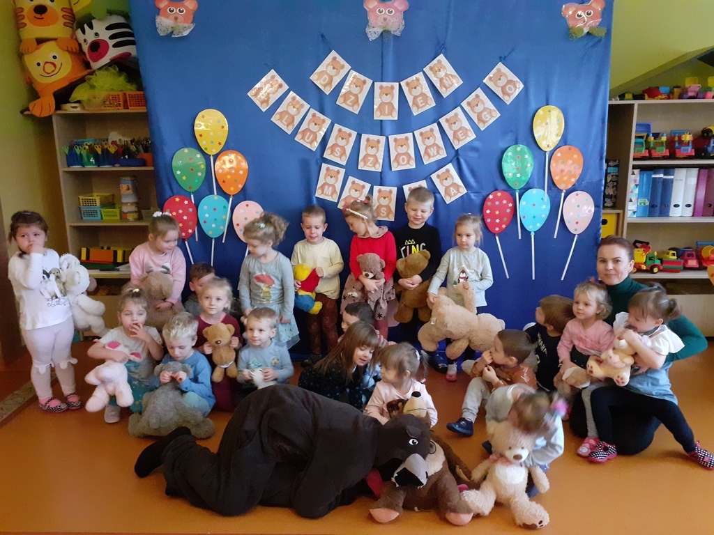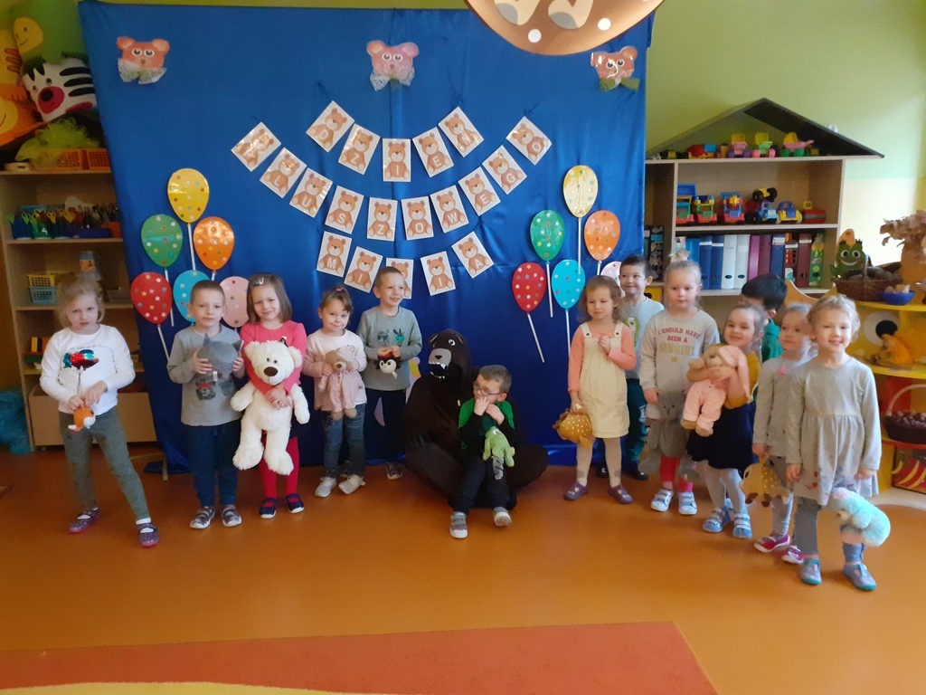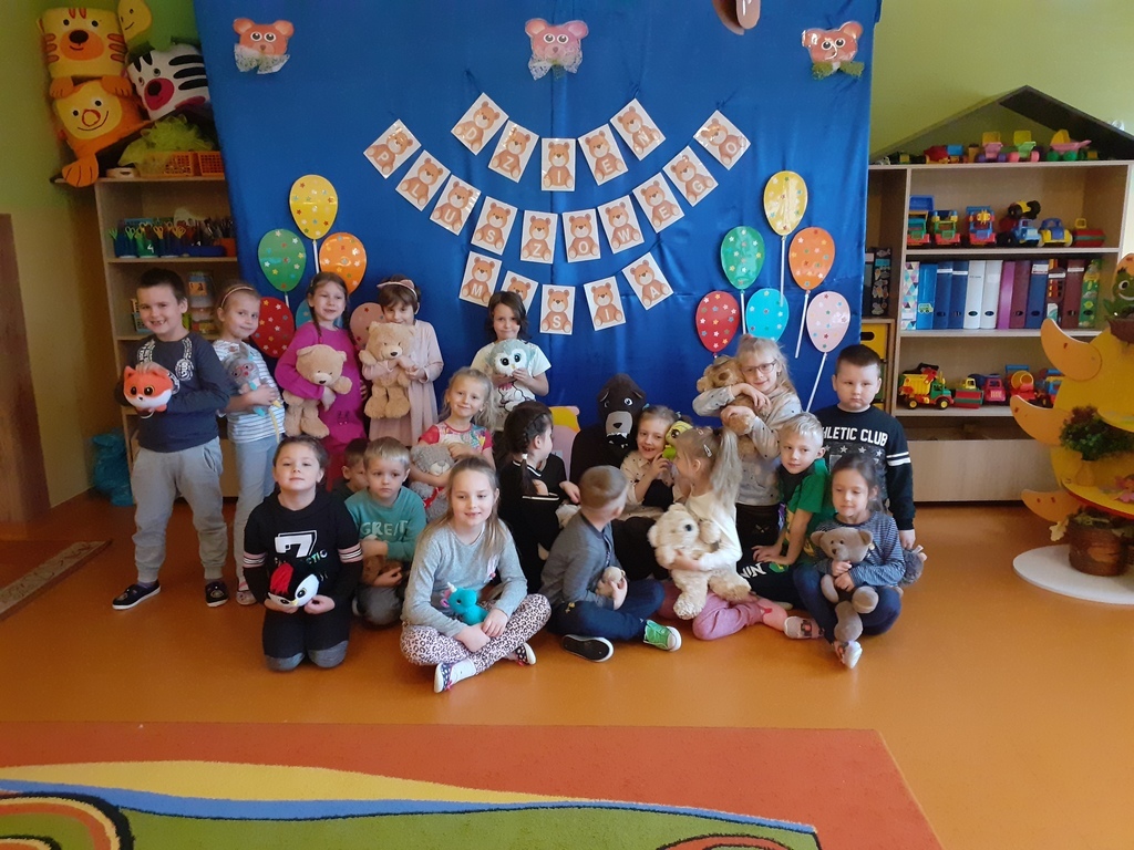 25 listopada to dzień, kiedy na świecie obchodzi się urodziny pluszowego misia. Miś jest przyjacielem dzieci, czy wypada zapomnieć o urodzinach przyjaciela? Oczywiście, że nie!! Z tej właśnie okazji w naszym przedszkolu odbyły się obchody Światowego Dnia Pluszowego Misia. Każde dziecko przyniosło swojego misia-pluszaka. Zabawka ta towarzyszy dzieciom wiele lat, to nie tylko pluszowa przytulanka, to "ktoś" bardzo bliski, czuły, cierpliwy i często niezastąpiony. Na początku dzieci zaprosiły do sali Misia, by następnie mógł z nimi świętować ten ważny dzień. Dzieci dowiedziały się, że oprócz Misiów- przytulanek oraz tych, które występują w bajkach, są na świecie prawdziwe Misie. Następnie przedszkolaki przystąpiły do zabawy ruchowo – naśladowczej pt.: „Misiowe Figle” oraz zatańczyły z misiem do następujących piosenkek „Gumi Miś”, „Misie Szare” oraz „Mały misio robi bach”. Na koniec dzieci zaśpiewały dla Misia „Sto lat”. Misiowi bardzo podobała się wspólna zabawa oraz na pamiątkę chciał sobie zrobić zdjęcie z każdą grupą dzieci. Oprócz słodkich niespodzianek na dzieci czekała jeszcze jedna niespodzianka na przedszkolnym holu. Była to „Foto-budka Miś”, którą przygotowała Pani Anna Kasperska-Czech. Bardzo dziękujemy.