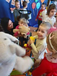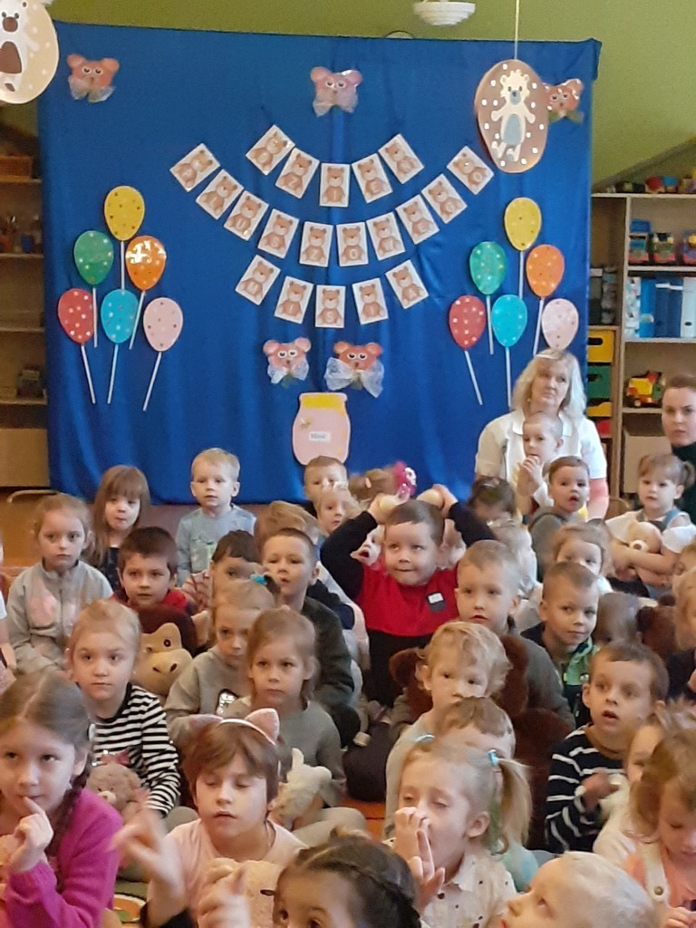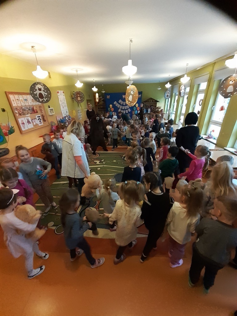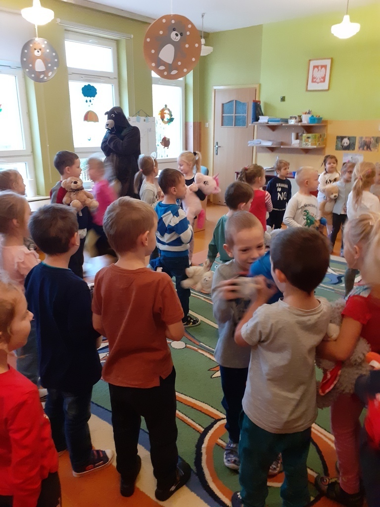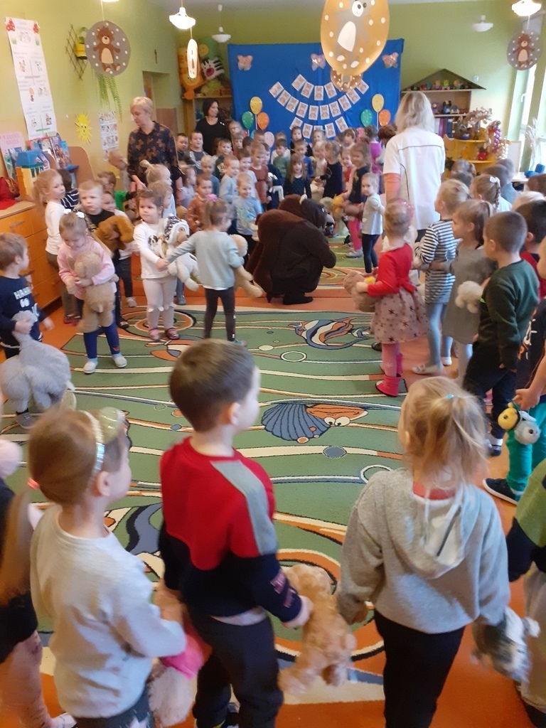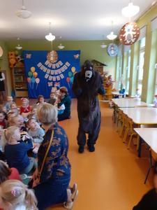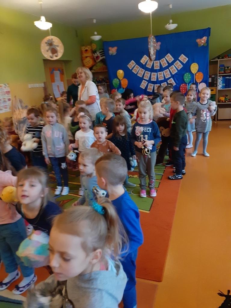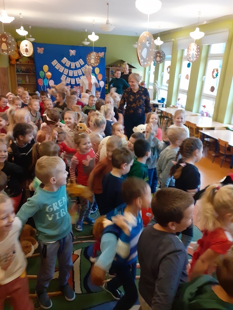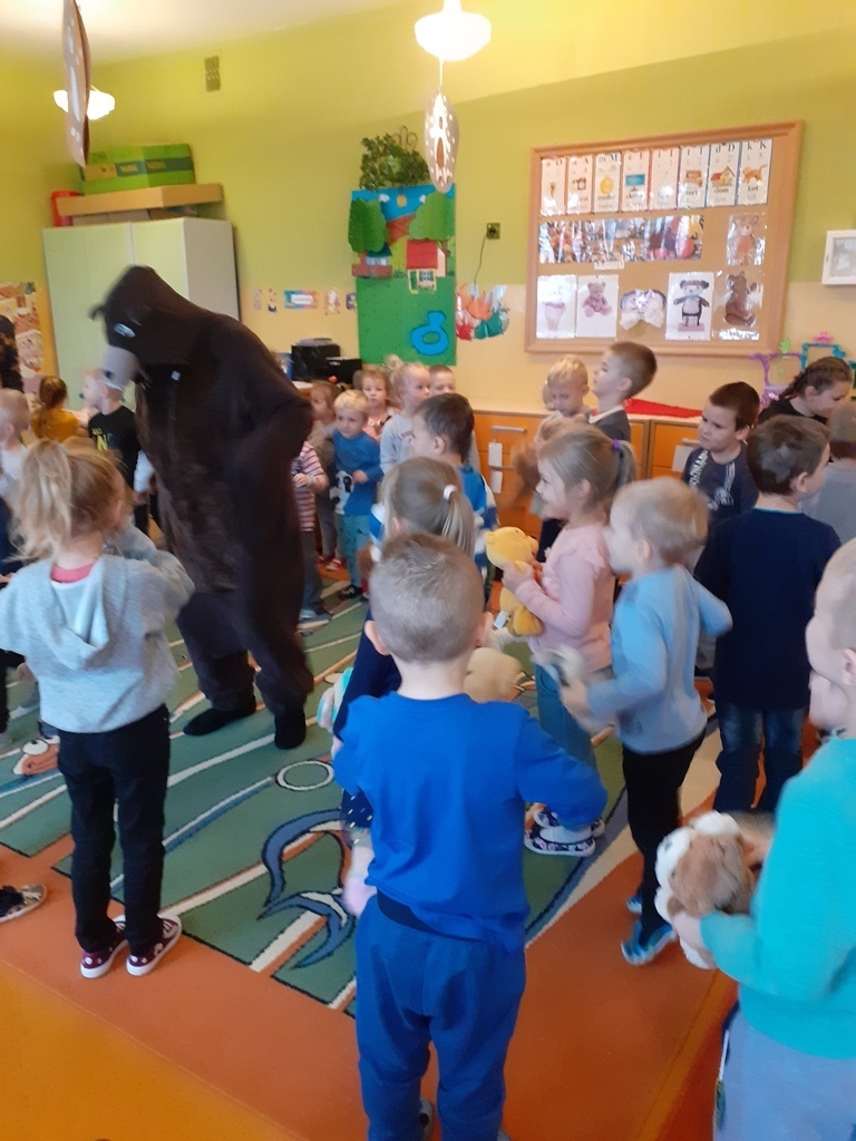 25 listopada to dzień, kiedy na świecie obchodzi się urodziny pluszowego misia. Miś jest przyjacielem dzieci, czy wypada zapomnieć o urodzinach przyjaciela? Oczywiście, że nie!! Z tej właśnie okazji w naszym przedszkolu odbyły się obchody Światowego Dnia Pluszowego Misia. Każde dziecko przyniosło swojego misia-pluszaka. Zabawka ta towarzyszy dzieciom wiele lat, to nie tylko pluszowa przytulanka, to "ktoś" bardzo bliski, czuły, cierpliwy i często niezastąpiony. Na początku dzieci zaprosiły do sali Misia, by następnie mógł z nimi świętować ten ważny dzień. Dzieci dowiedziały się, że oprócz Misiów- przytulanek oraz tych, które występują w bajkach, są na świecie prawdziwe Misie. Następnie przedszkolaki przystąpiły do zabawy ruchowo – naśladowczej pt.: „Misiowe Figle” oraz zatańczyły z misiem do następujących piosenkek „Gumi Miś”, „Misie Szare” oraz „Mały misio robi bach”. Na koniec dzieci zaśpiewały dla Misia „Sto lat”. Misiowi bardzo podobała się wspólna zabawa oraz na pamiątkę chciał sobie zrobić zdjęcie z każdą grupą dzieci. Oprócz słodkich niespodzianek na dzieci czekała jeszcze jedna niespodzianka na przedszkolnym holu. Była to „Foto-budka Miś”, którą przygotowała Pani Anna Kasperska-Czech. Bardzo dziękujemy.