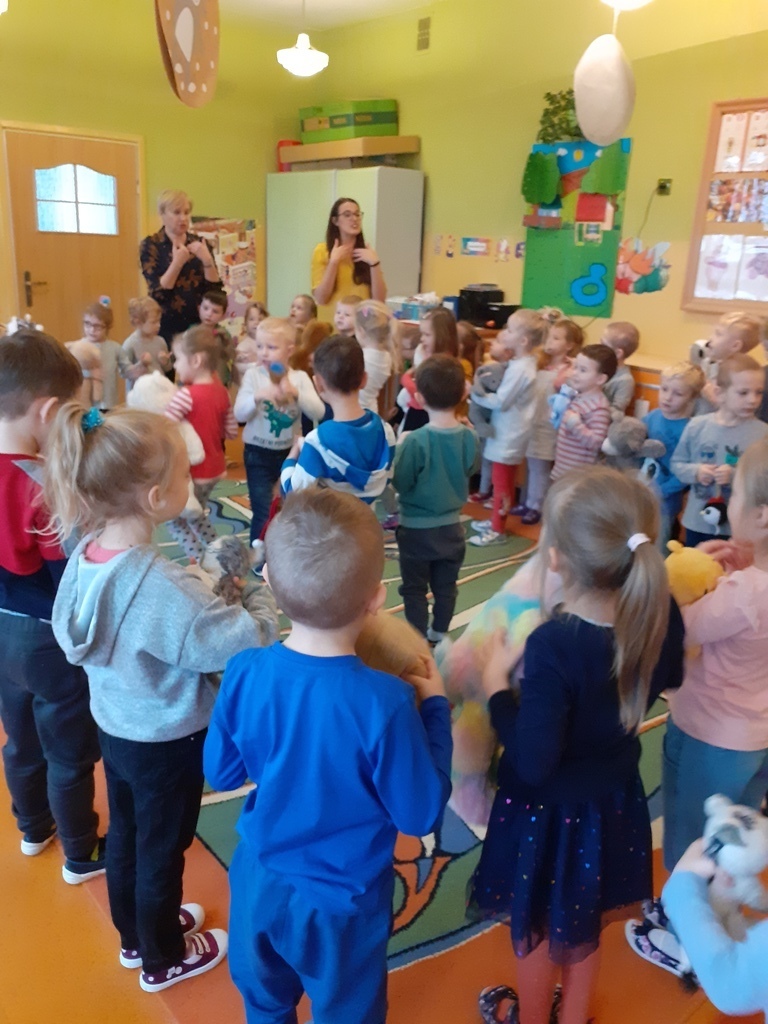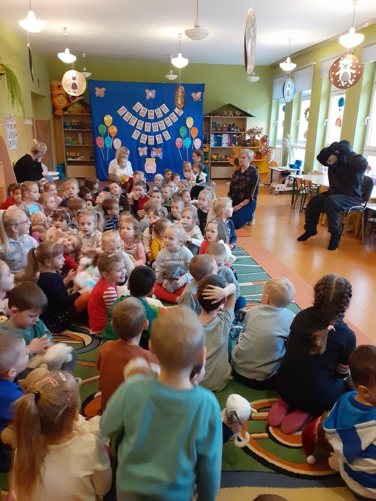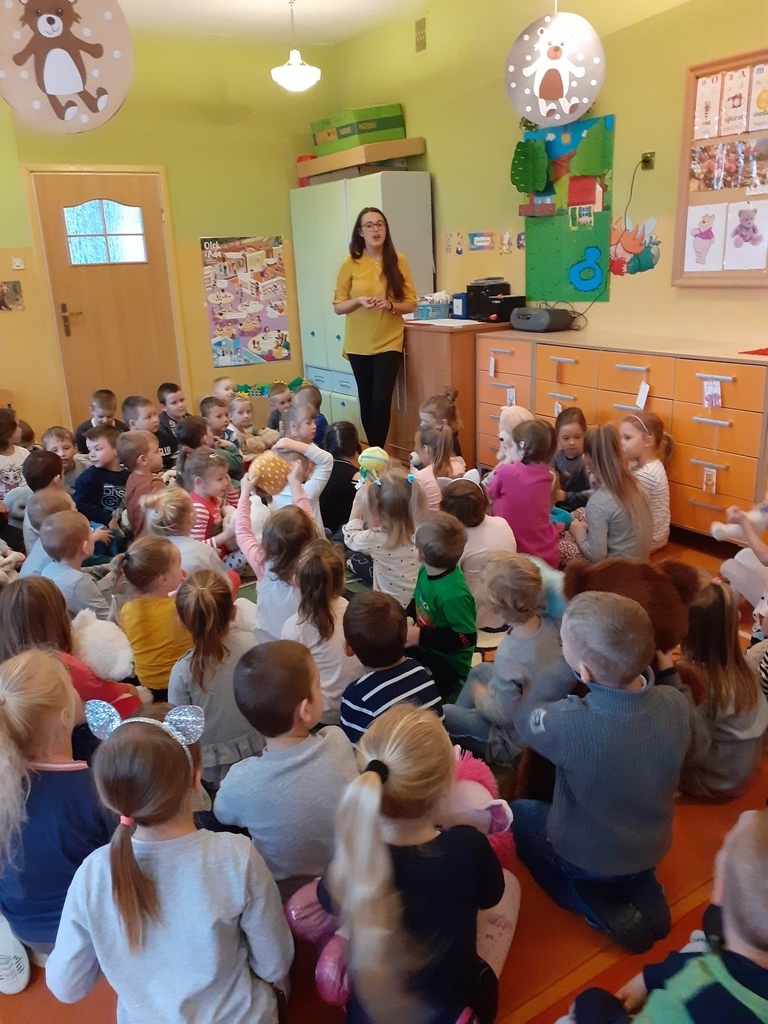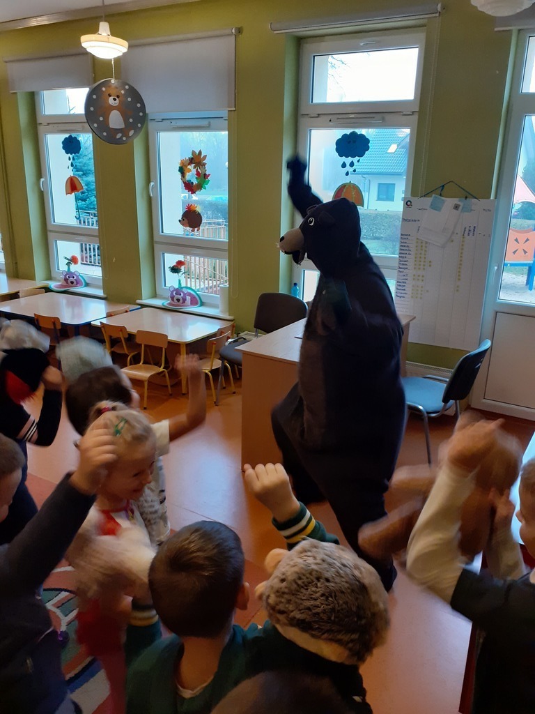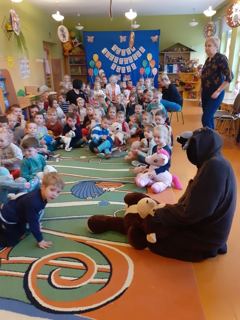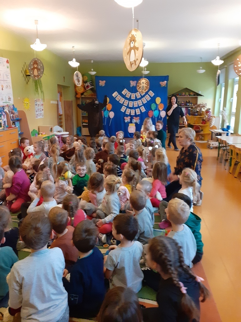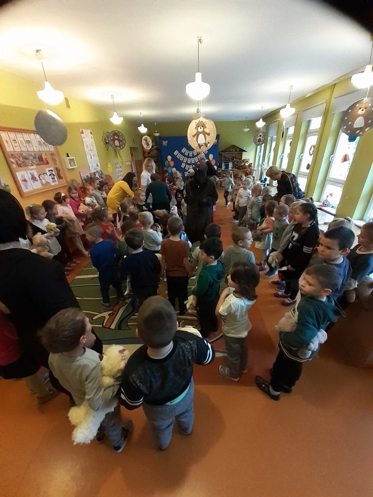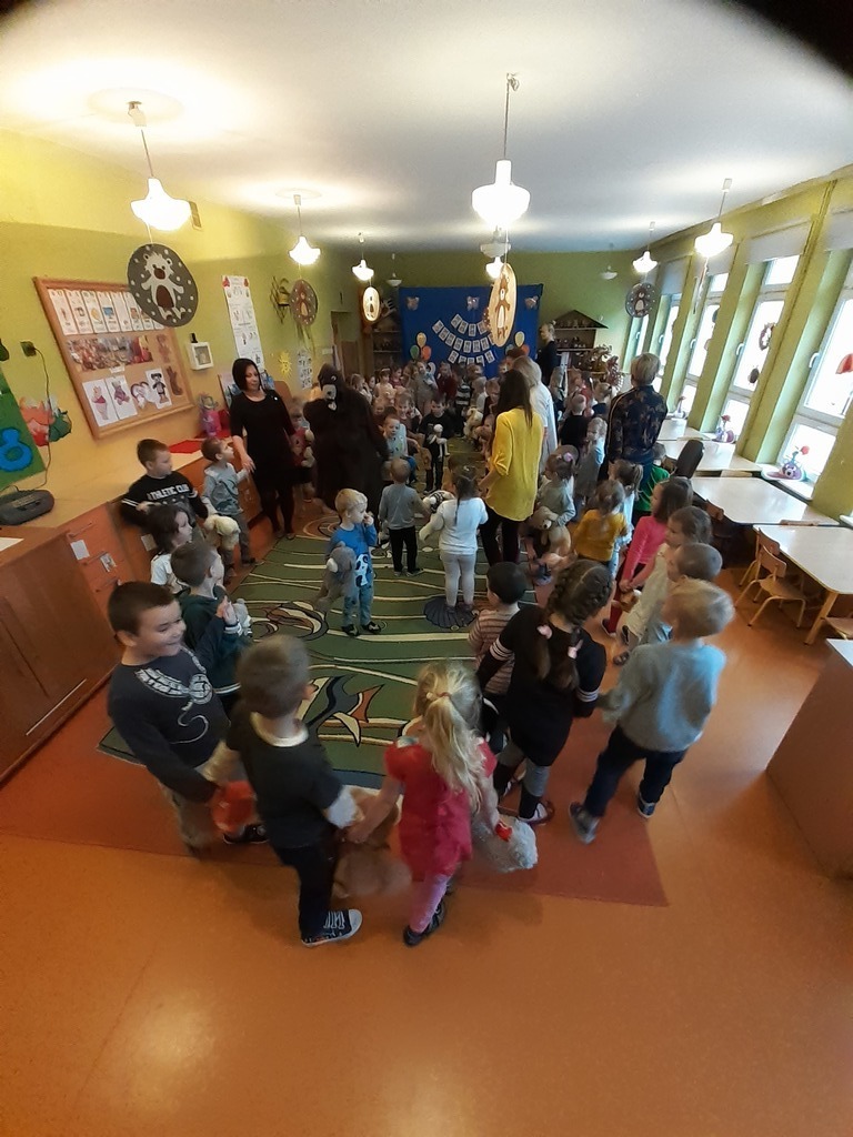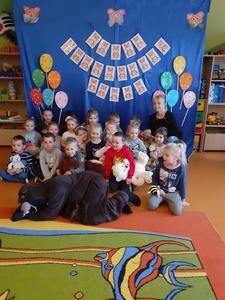25 listopada to dzień, kiedy na świecie obchodzi się urodziny pluszowego misia. Miś jest przyjacielem dzieci, czy wypada zapomnieć o urodzinach przyjaciela? Oczywiście, że nie!! Z tej właśnie okazji w naszym przedszkolu odbyły się obchody Światowego Dnia Pluszowego Misia. Każde dziecko przyniosło swojego misia-pluszaka. Zabawka ta towarzyszy dzieciom wiele lat, to nie tylko pluszowa przytulanka, to "ktoś" bardzo bliski, czuły, cierpliwy i często niezastąpiony. Na początku dzieci zaprosiły do sali Misia, by następnie mógł z nimi świętować ten ważny dzień. Dzieci dowiedziały się, że oprócz Misiów- przytulanek oraz tych, które występują w bajkach, są na świecie prawdziwe Misie. Następnie przedszkolaki przystąpiły do zabawy ruchowo – naśladowczej pt.: „Misiowe Figle” oraz zatańczyły z misiem do następujących piosenkek „Gumi Miś”, „Misie Szare” oraz „Mały misio robi bach”. Na koniec dzieci zaśpiewały dla Misia „Sto lat”. Misiowi bardzo podobała się wspólna zabawa oraz na pamiątkę chciał sobie zrobić zdjęcie z każdą grupą dzieci. Oprócz słodkich niespodzianek na dzieci czekała jeszcze jedna niespodzianka na przedszkolnym holu. Była to „Foto-budka Miś”, którą przygotowała Pani Anna Kasperska-Czech. Bardzo dziękujemy.