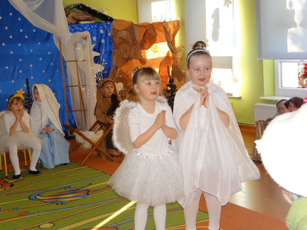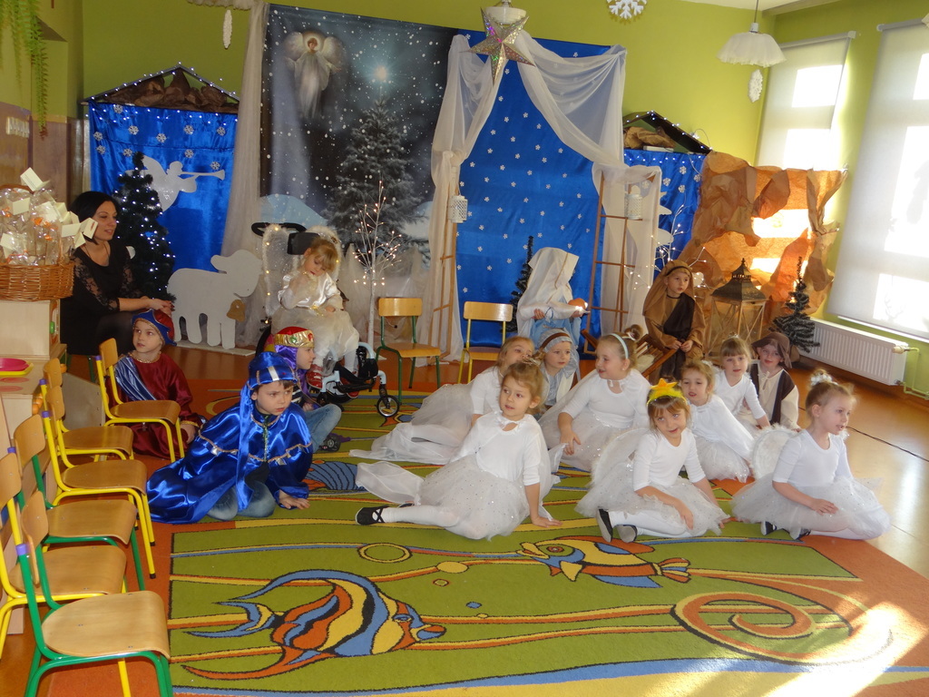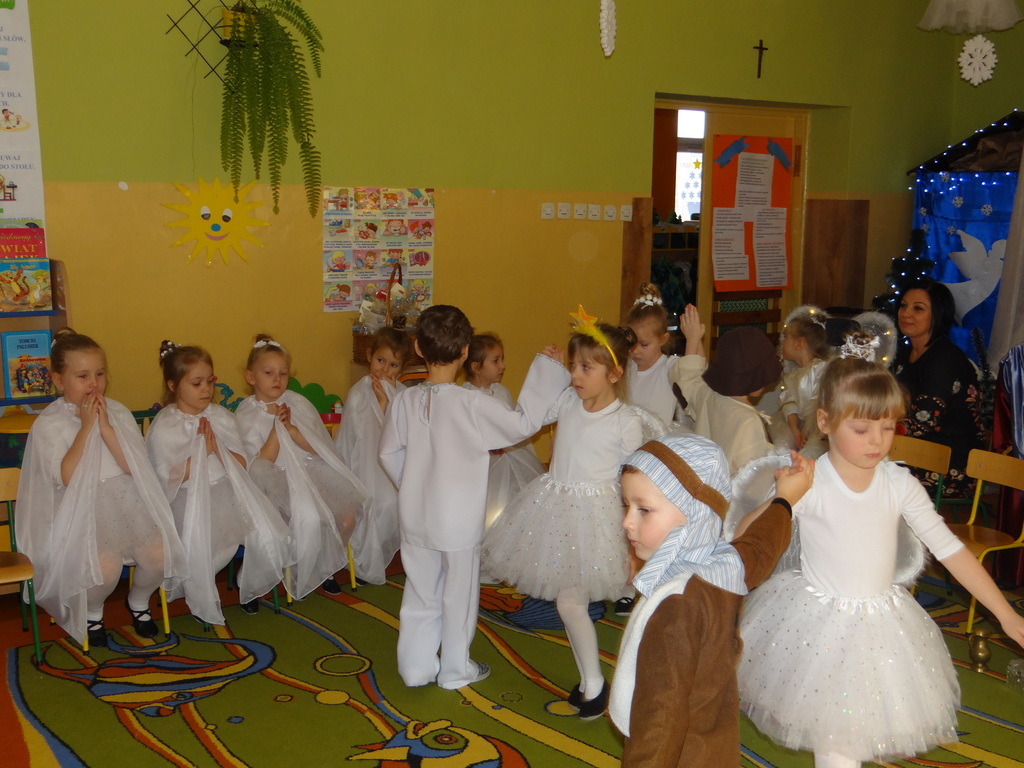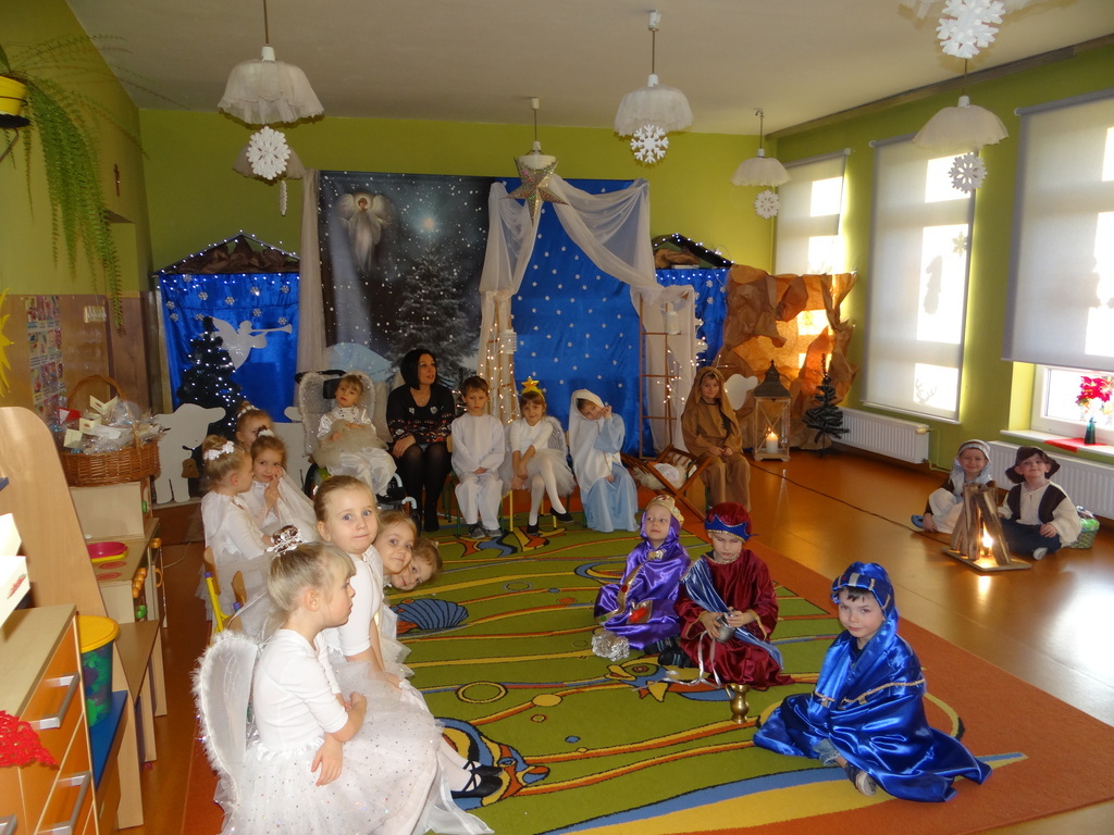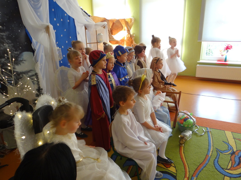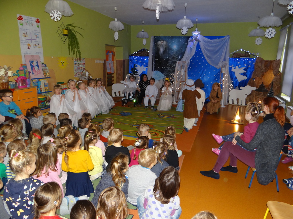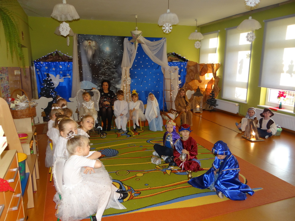 Aby Święta Bożego Narodzenia były bliskością i spokojem, dzieci z grupy „Muchomorków” dnia 16 grudnia zaprosiły personel  przedszkola i wszystkie pozostałe grupy na przygotowane przez siebie Jasełka. W atmosferze magii i narodzin Jezusa  zaproszeni goście mieli możliwość wysłuchania szeregu kolęd i pastorałek a wypowiadane teksty wprowadziły  zebranych w odległe czasy Narodzenia Pańskiego. Na zakończenie pani Dyrektor życzyła wszystkim, aby Święta Bożego Narodzenia były pełnego ciepła spojrzeniem na innych ludzi i otaczający świat oraz wytchnieniem  w gronie rodziny i przyjaciół.