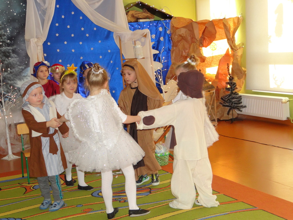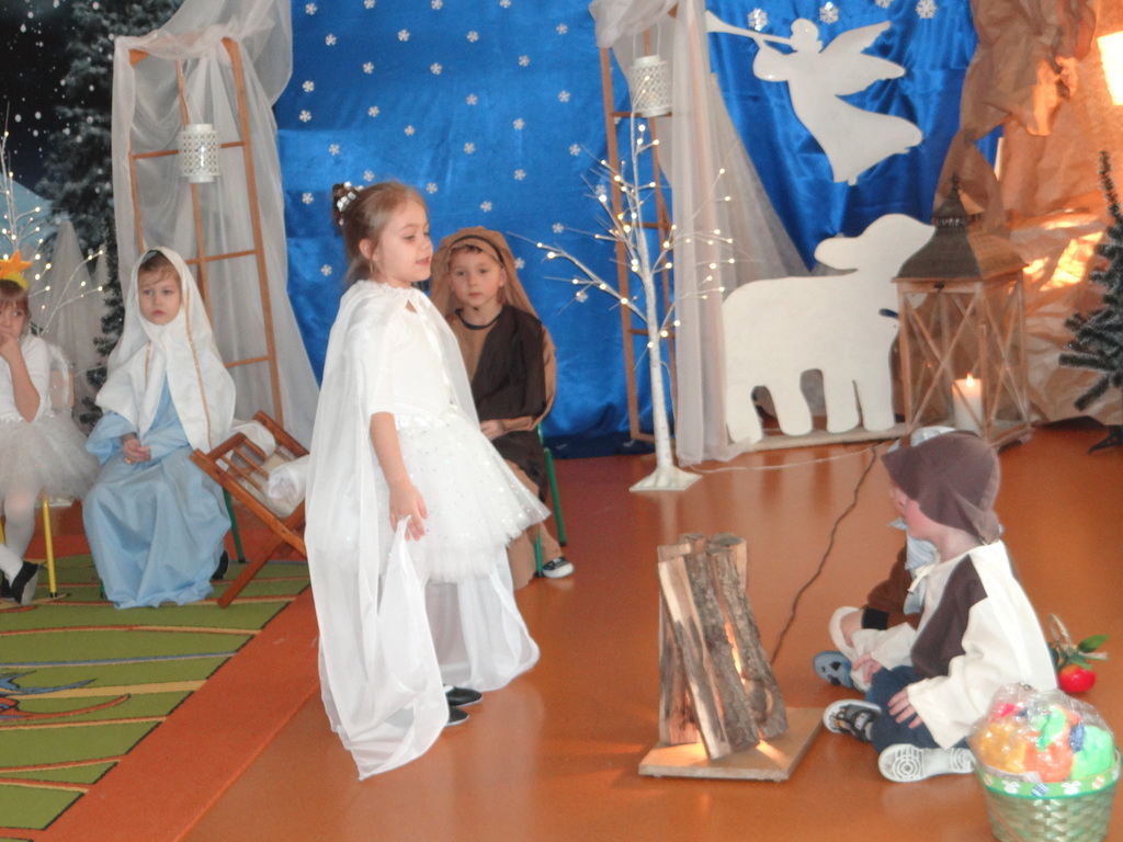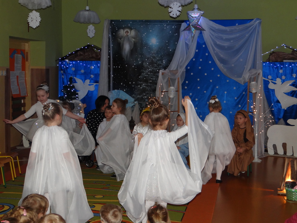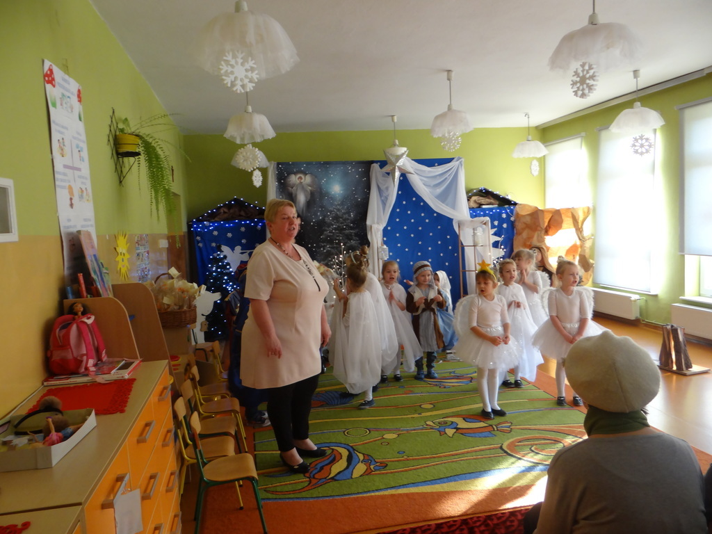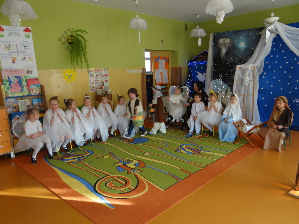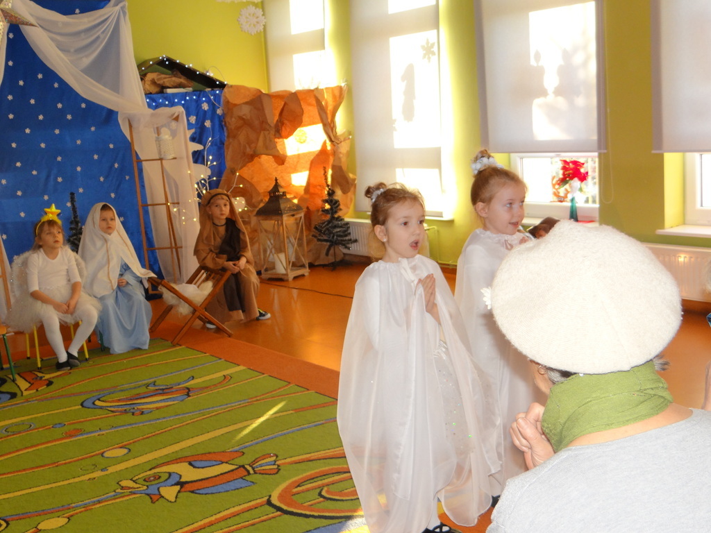 Aby Święta Bożego Narodzenia były bliskością i spokojem, dzieci z grupy „Muchomorków” dnia 16 grudnia zaprosiły personel  przedszkola i wszystkie pozostałe grupy na przygotowane przez siebie Jasełka. W atmosferze magii i narodzin Jezusa  zaproszeni goście mieli możliwość wysłuchania szeregu kolęd i pastorałek a wypowiadane teksty wprowadziły  zebranych w odległe czasy Narodzenia Pańskiego. Na zakończenie pani Dyrektor życzyła wszystkim, aby Święta Bożego Narodzenia były pełnego ciepła spojrzeniem na innych ludzi i otaczający świat oraz wytchnieniem  w gronie rodziny i przyjaciół.