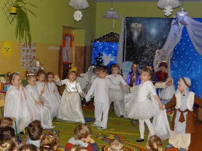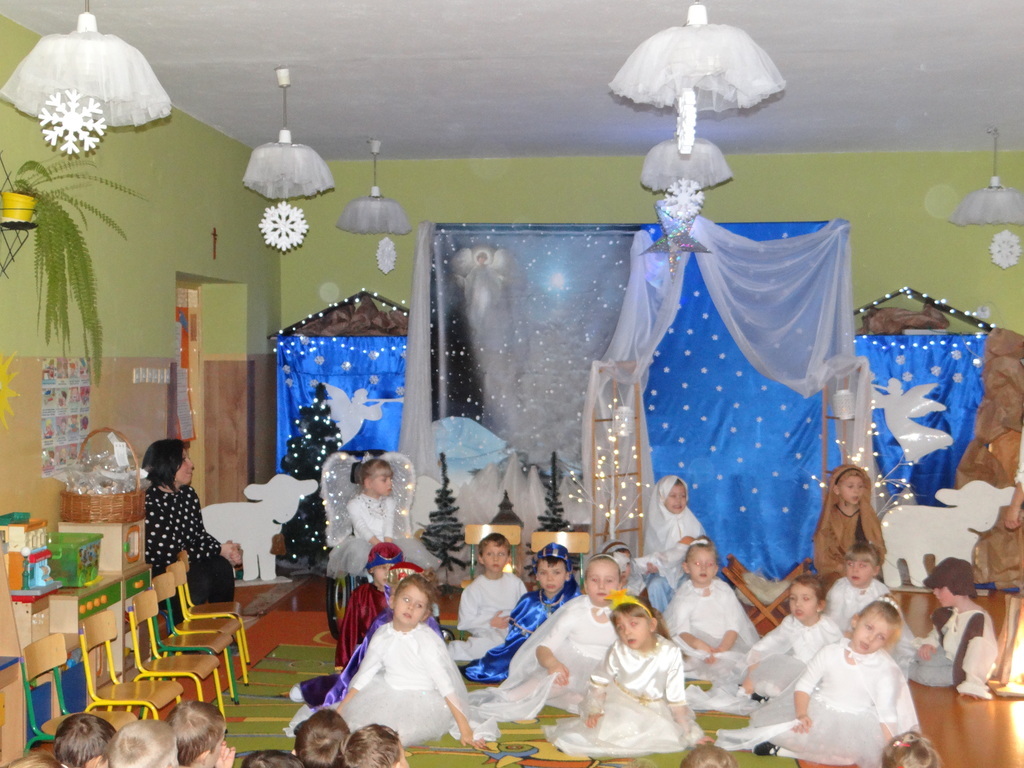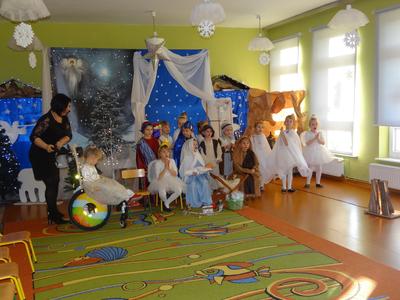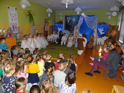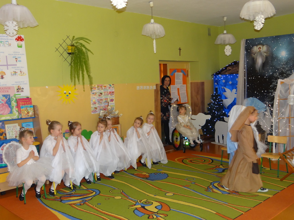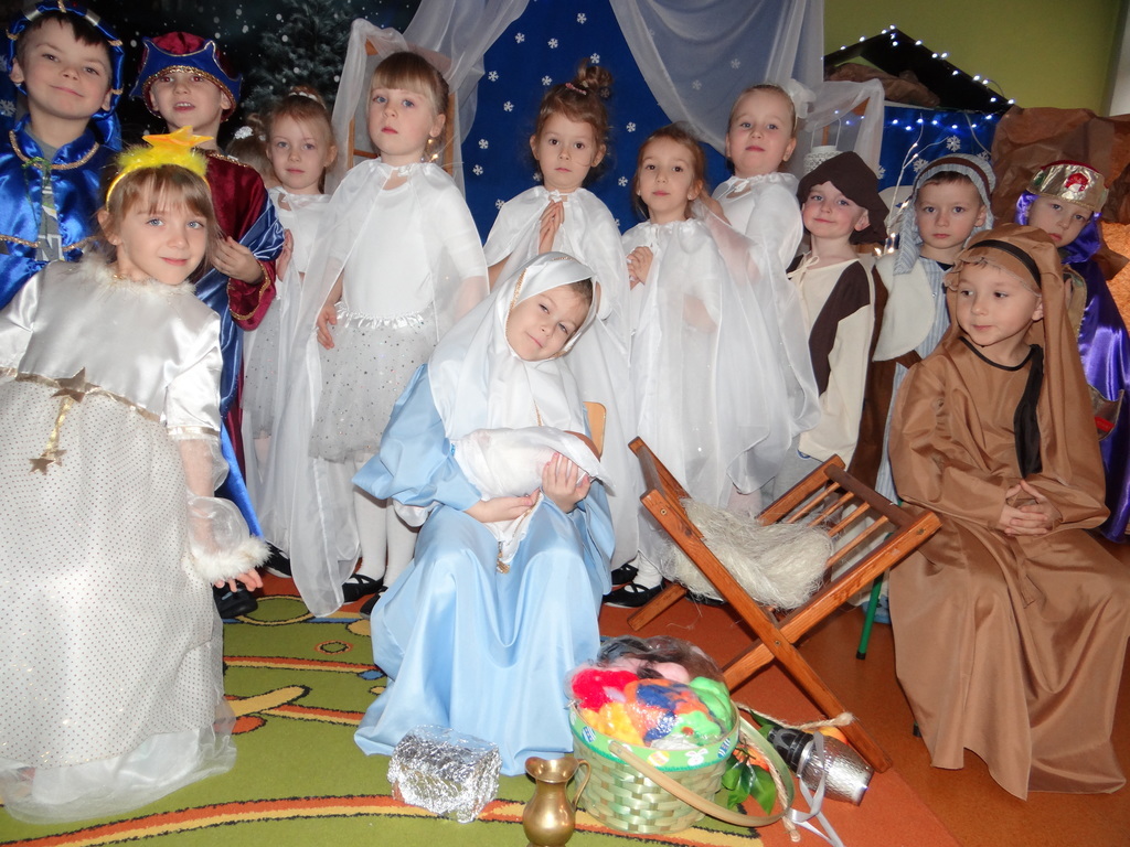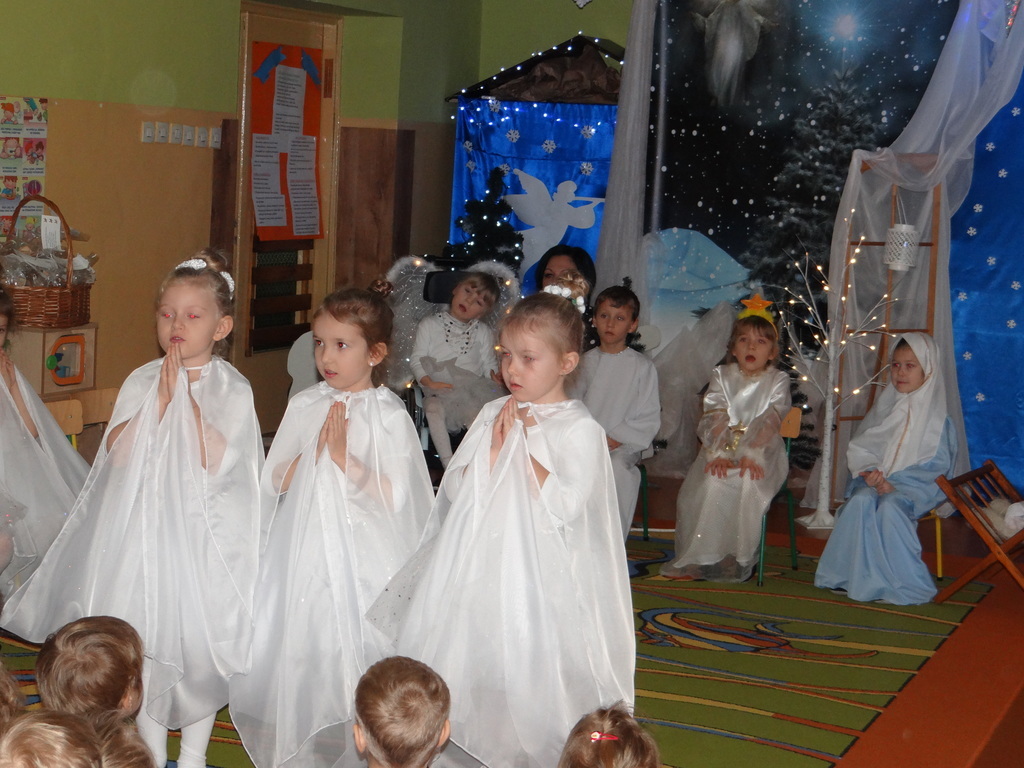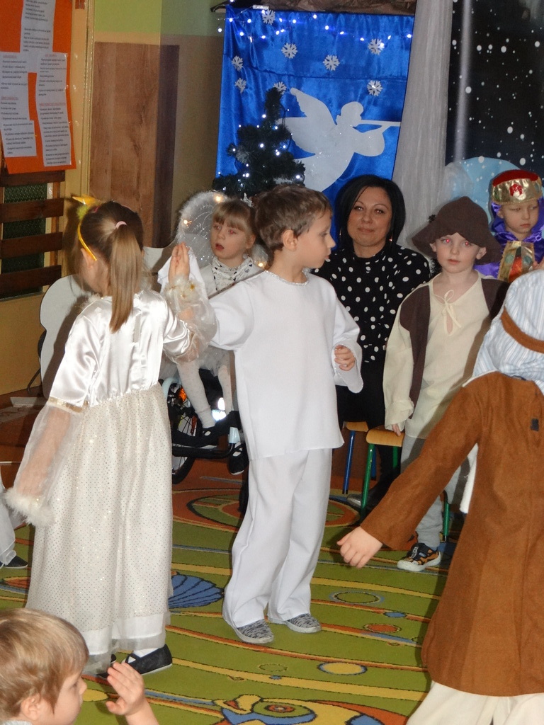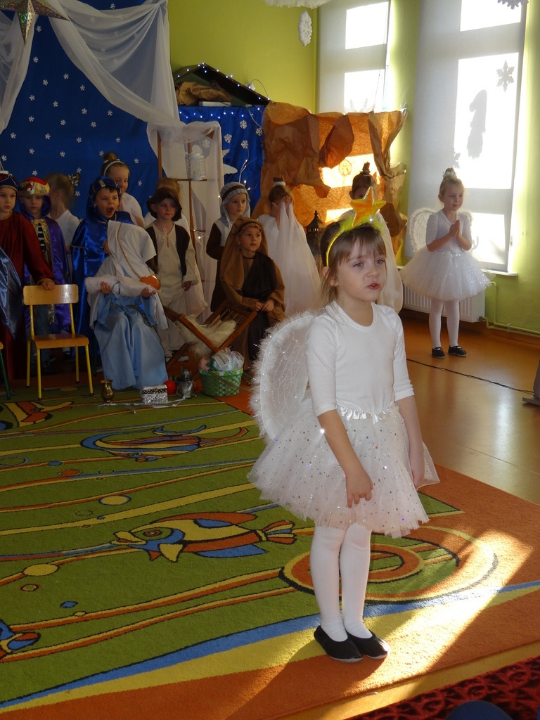 Aby Święta Bożego Narodzenia były bliskością i spokojem, dzieci z grupy „Muchomorków” dnia 16 grudnia zaprosiły personel  przedszkola i wszystkie pozostałe grupy na przygotowane przez siebie Jasełka. W atmosferze magii i narodzin Jezusa  zaproszeni goście mieli możliwość wysłuchania szeregu kolęd i pastorałek a wypowiadane teksty wprowadziły  zebranych w odległe czasy Narodzenia Pańskiego. Na zakończenie pani Dyrektor życzyła wszystkim, aby Święta Bożego Narodzenia były pełnego ciepła spojrzeniem na innych ludzi i otaczający świat oraz wytchnieniem  w gronie rodziny i przyjaciół.