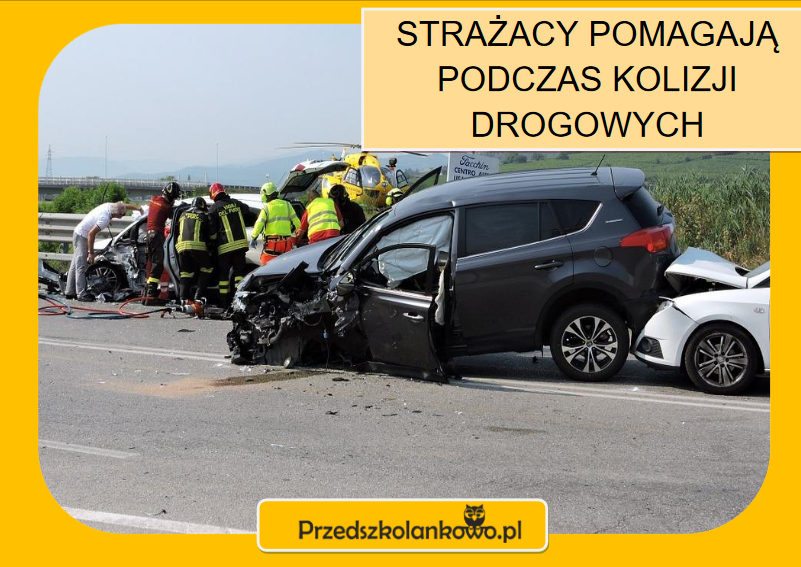 Opowiedz, co znajduje się na ilustracjach, a dowiesz się czym jeszcze, prócz gaszenia pożarów, zajmują się strażacy. (ilustracje w załączniku)