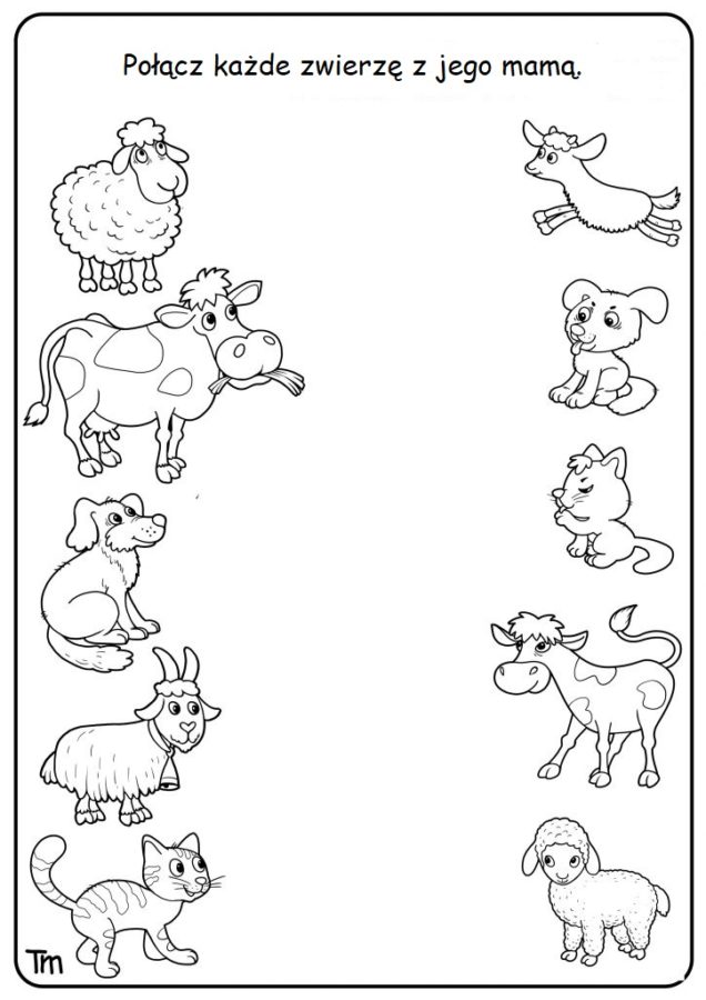 Zadaniem dzieci jest połączenie obrazków dorosłych zwierząt z ich dziećmi. Następnie przedszkolaki kolorują obrazki. Karta pracy w załączniku.
