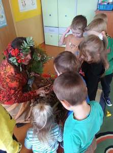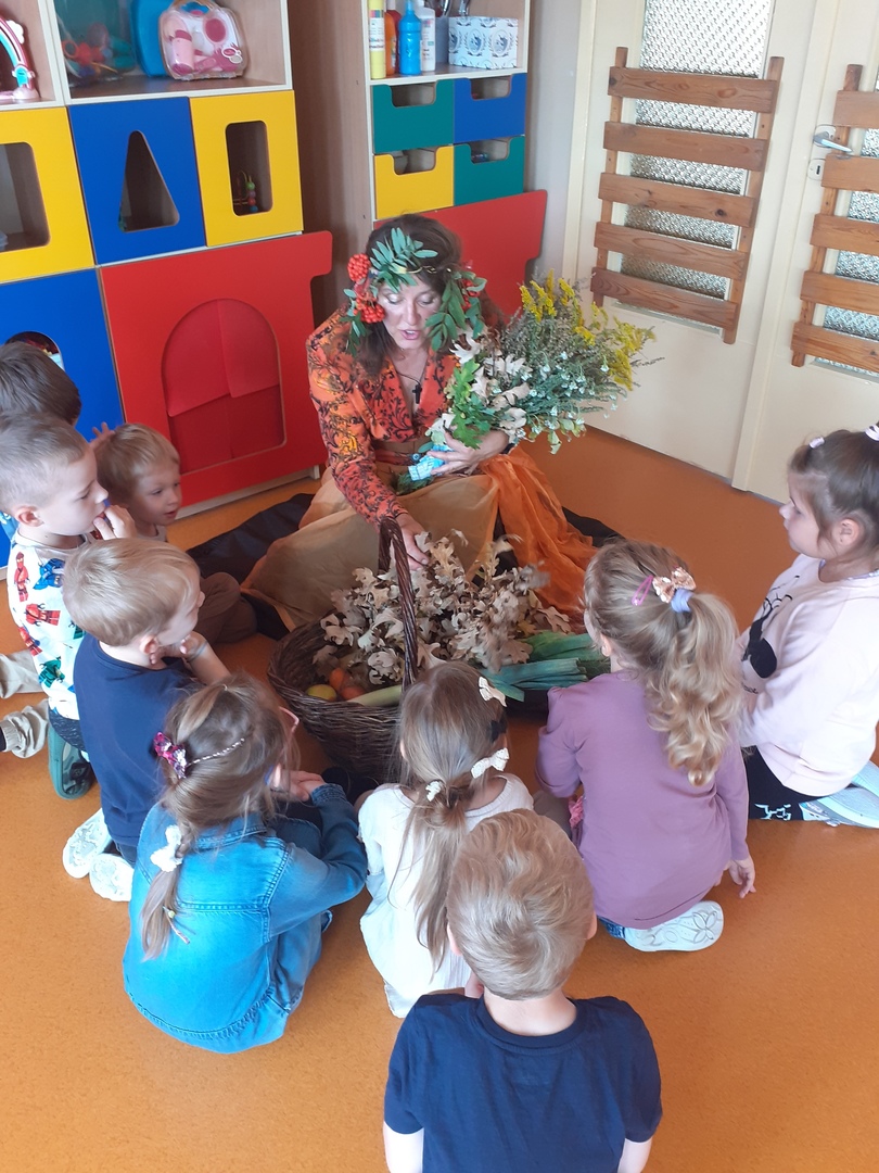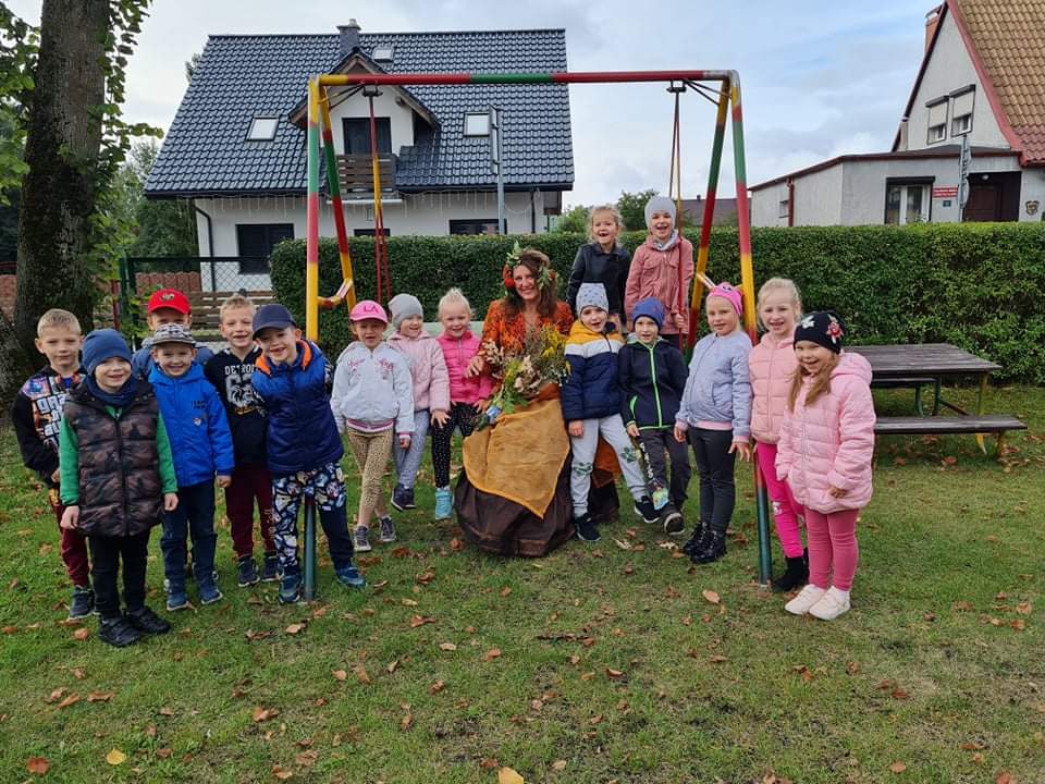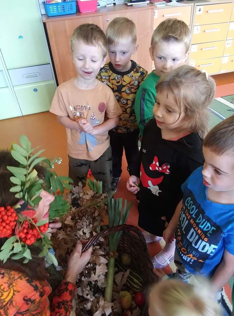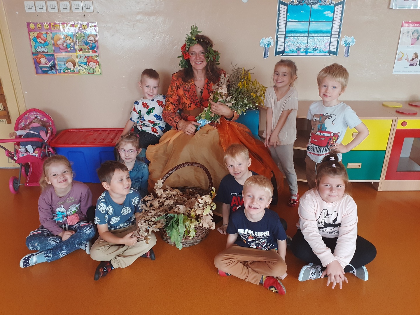 Pięknie przystrojona w jarzębinę, z bukietem i koszem pełnym owoców, warzyw i liści, dzieci z naszego przedszkola odwiedziła Pani Jesień. Pojawienie się w przedszkolu niecodziennego gościa wzbudziło w dzieciach wiele entuzjazmu. Przedszkolaki z wielkim zainteresowaniem słuchały o zmianach jakie zachodzą w przyrodzie jesienią, opisywały wygląd Pani Jesieni i wykazywały się wiedzą o właściwym zachowaniu się w lesie. Odwiedziny tak niezwykłego gościa sprawiło przedszkolakom wiele radości.