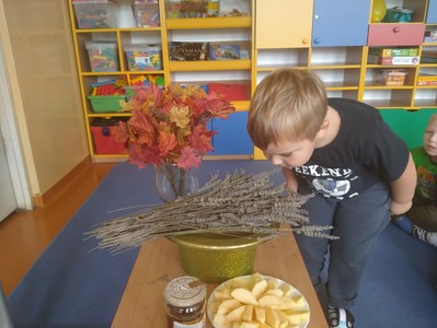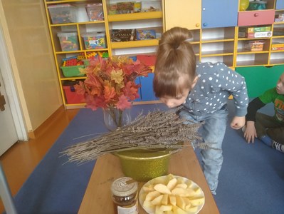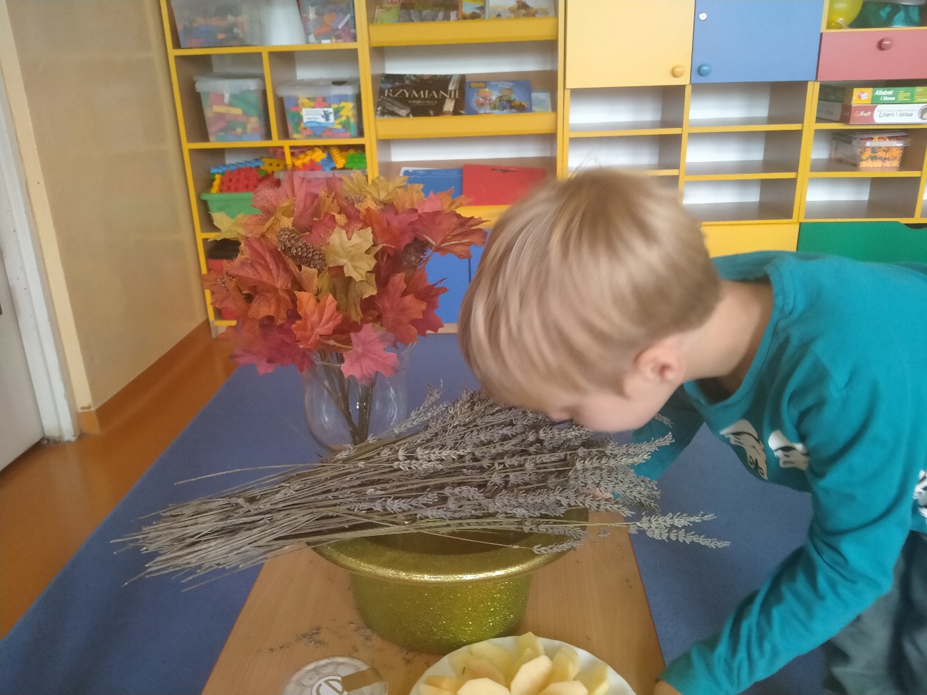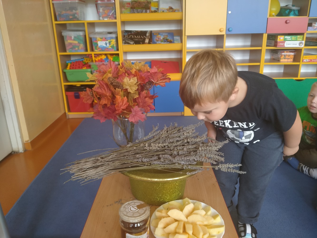 Dzieci z grupy ,,Deszczowe Kropelki” przywitały jesień wykonując cztery zadania sensoryczne. Poprzez zmysły poznały zapach, smak, kolory i dary jesieni. Pokonały ścieżkę sensoryczną z kasztanów i liści, zatańczyły taniec jesienny z kolorowymi chustami do muzyki Vivaldiego ,,Jesień”, poznały zapach lawendy i wrzosu oraz smak miodu i soczystych jabłek z jesiennego sadu.