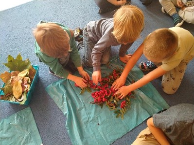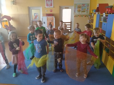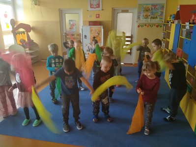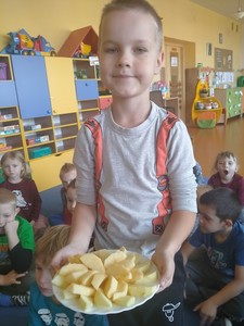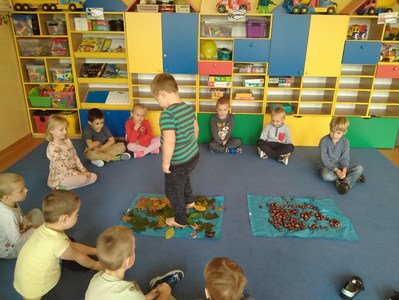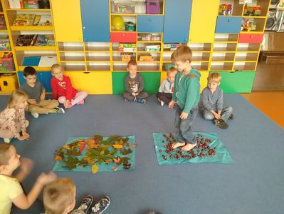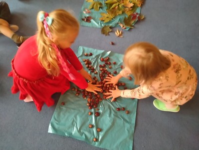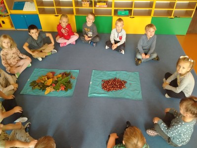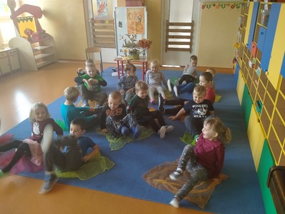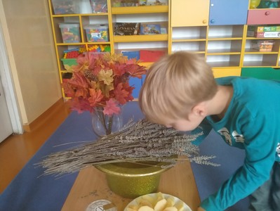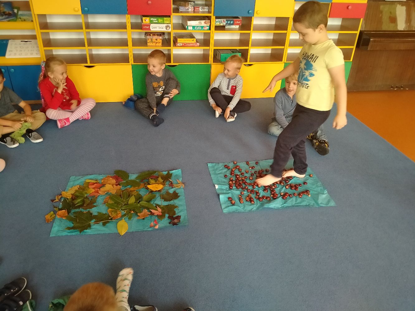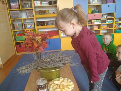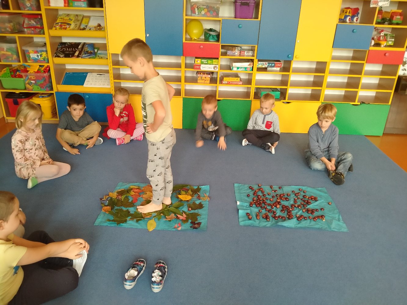 Dzieci z grupy ,,Deszczowe Kropelki” przywitały jesień wykonując cztery zadania sensoryczne. Poprzez zmysły poznały zapach, smak, kolory i dary jesieni. Pokonały ścieżkę sensoryczną z kasztanów i liści, zatańczyły taniec jesienny z kolorowymi chustami do muzyki Vivaldiego ,,Jesień”, poznały zapach lawendy i wrzosu oraz smak miodu i soczystych jabłek z jesiennego sadu.