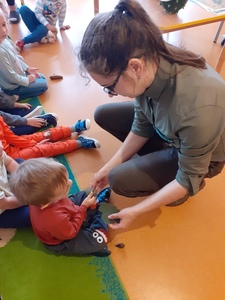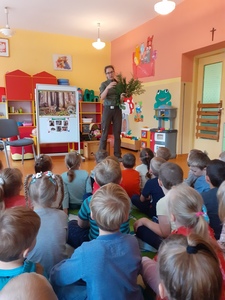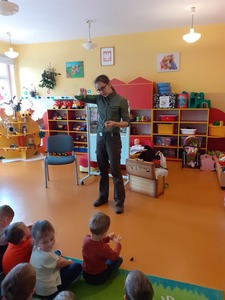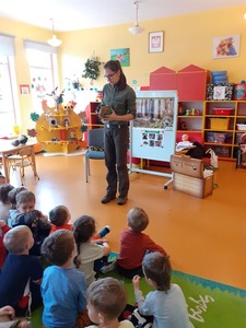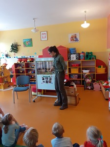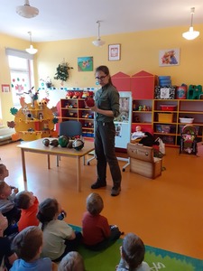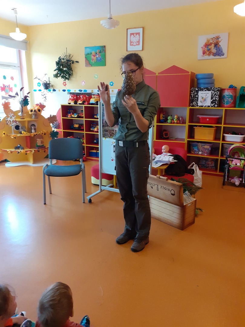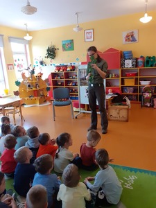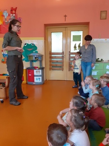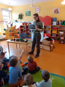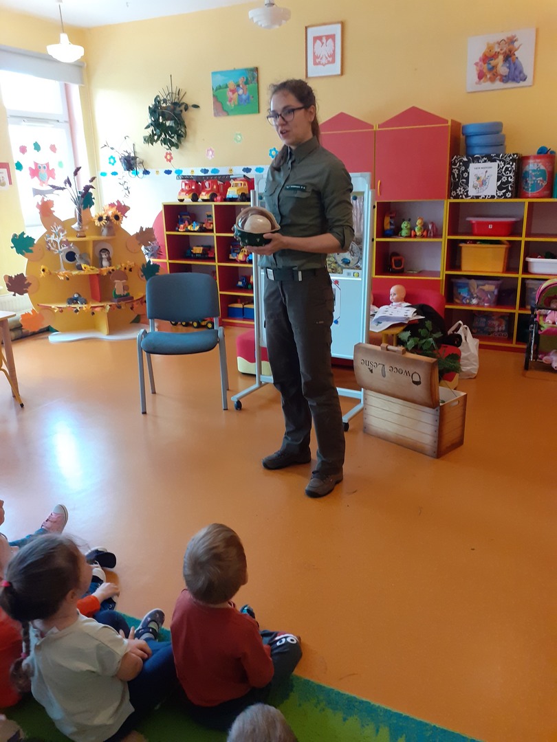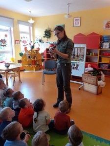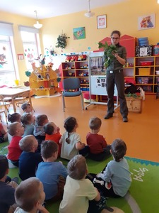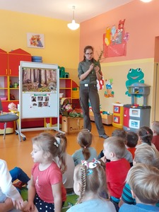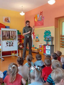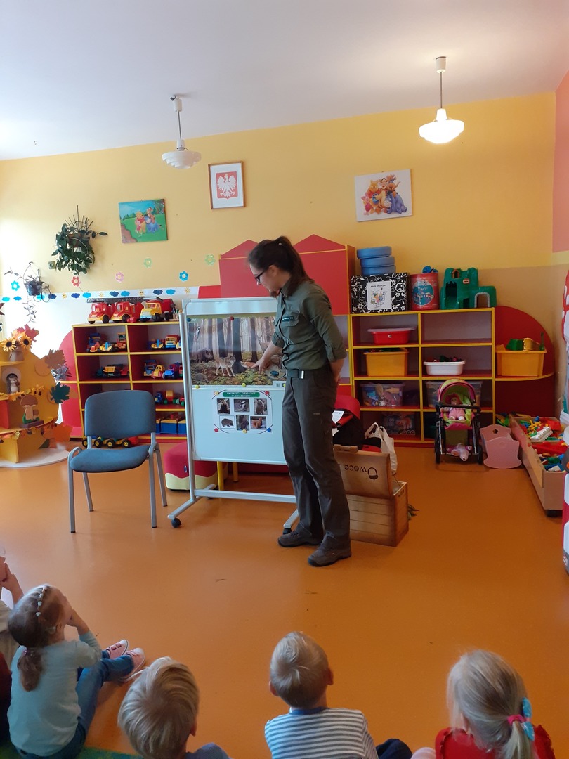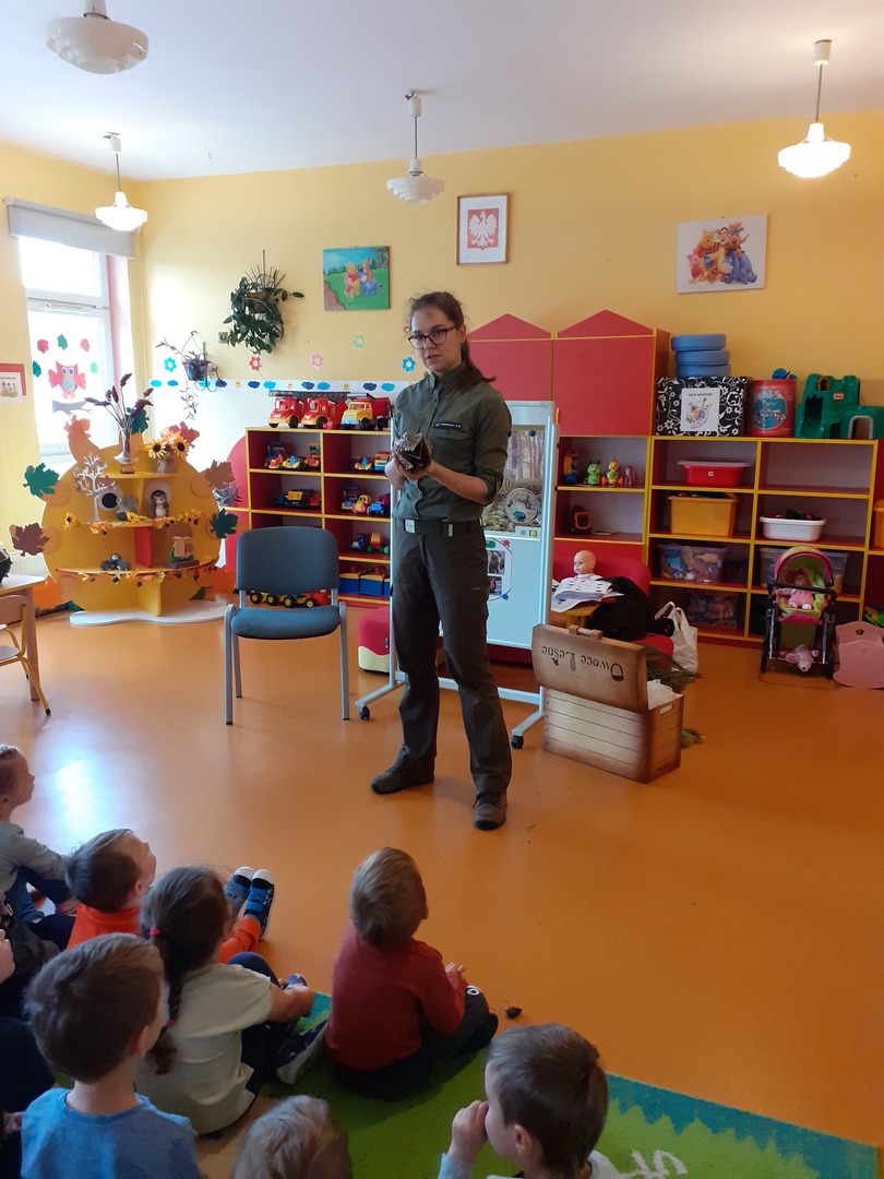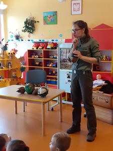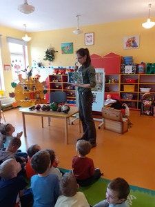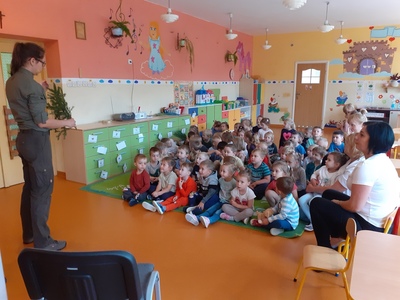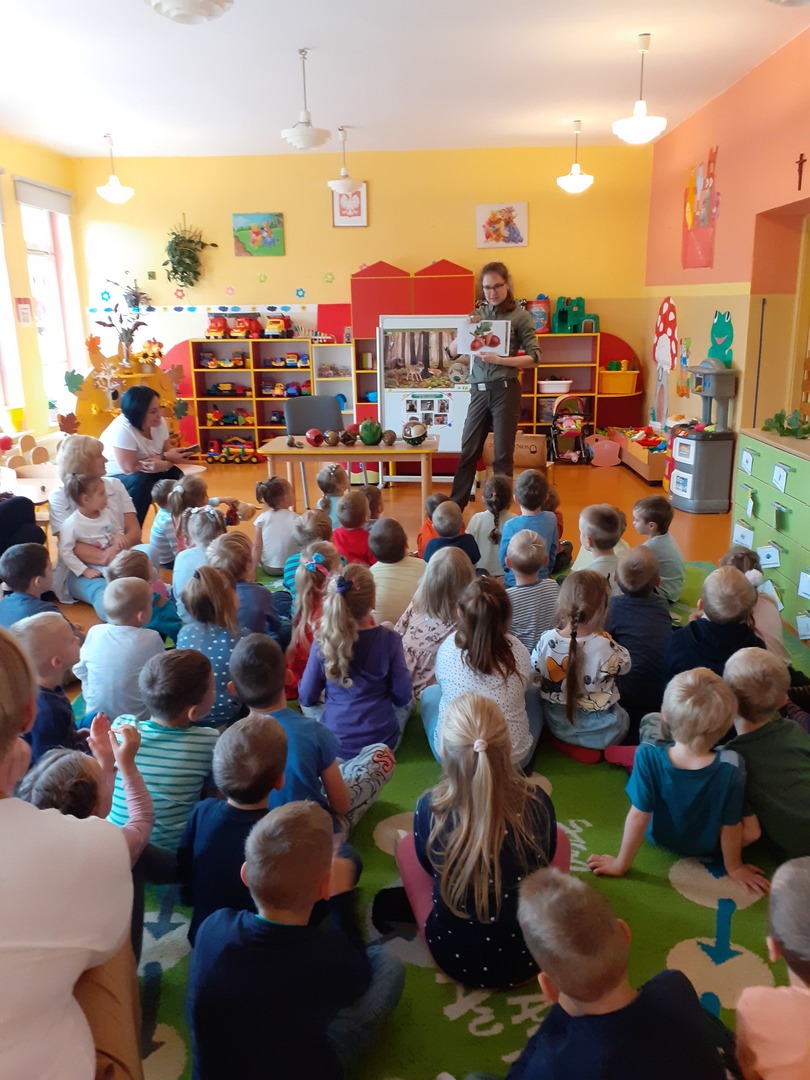 23 września do naszego przedszkola zawitał niezwykły gość – Pani Małgorzata Butkiewicz z Nadleśnictwa Mirosławiec. Opowiedziała dzieciom o swojej pracy, drzewach, o lesie i mieszkających w nim zwierzętach. Podkreśliła, że człowiek jest gościem w lesie i musi szanować zwyczaje gospodarzy, czyli zwierząt w nim mieszkających. Podczas spotkania dzieci miały okazję poznać zwyczaje wybranych zwierząt zamieszkujących lasy naszej okolicy, a także przypomnieć sobie jakie drzewa najczęściej występują w polskich lasach. Uczestnicy spotkania dowiedzieli się także, w jaki sposób pomóc zwierzętom przetrwać zimę i dlaczego niektóre zwierzęta gromadzą zapasy, a inne zapadają w sen zimowy. Na pamiątkę spotkania dzieci otrzymały piękne edukacyjne książeczki do kolorowania. Bardzo dziękujemy za ciekawą pogadankę o tajemnicach lasu.