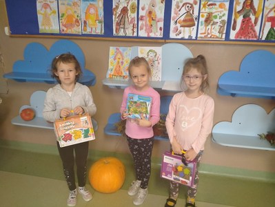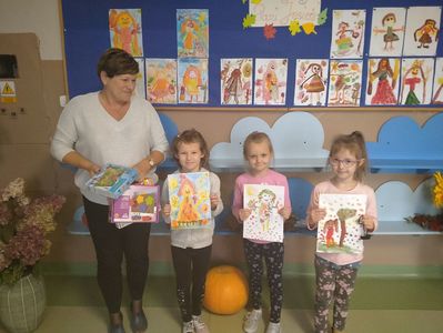 W poniedziałek, 18 października, w naszym przedszkolu został rozstrzygnięty konkurs plastyczny. Brały w nim udział dzieci z grupy „Biedronki”, „Deszczowe Kropelki” i „Tęczowe Nutki”. Wyłoniono trzech zwycięzców z każdej grupy. Pani dyrektor wręczyła nagrody i pogratulowała przedszkolakom.