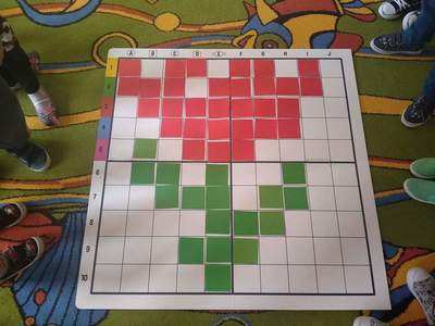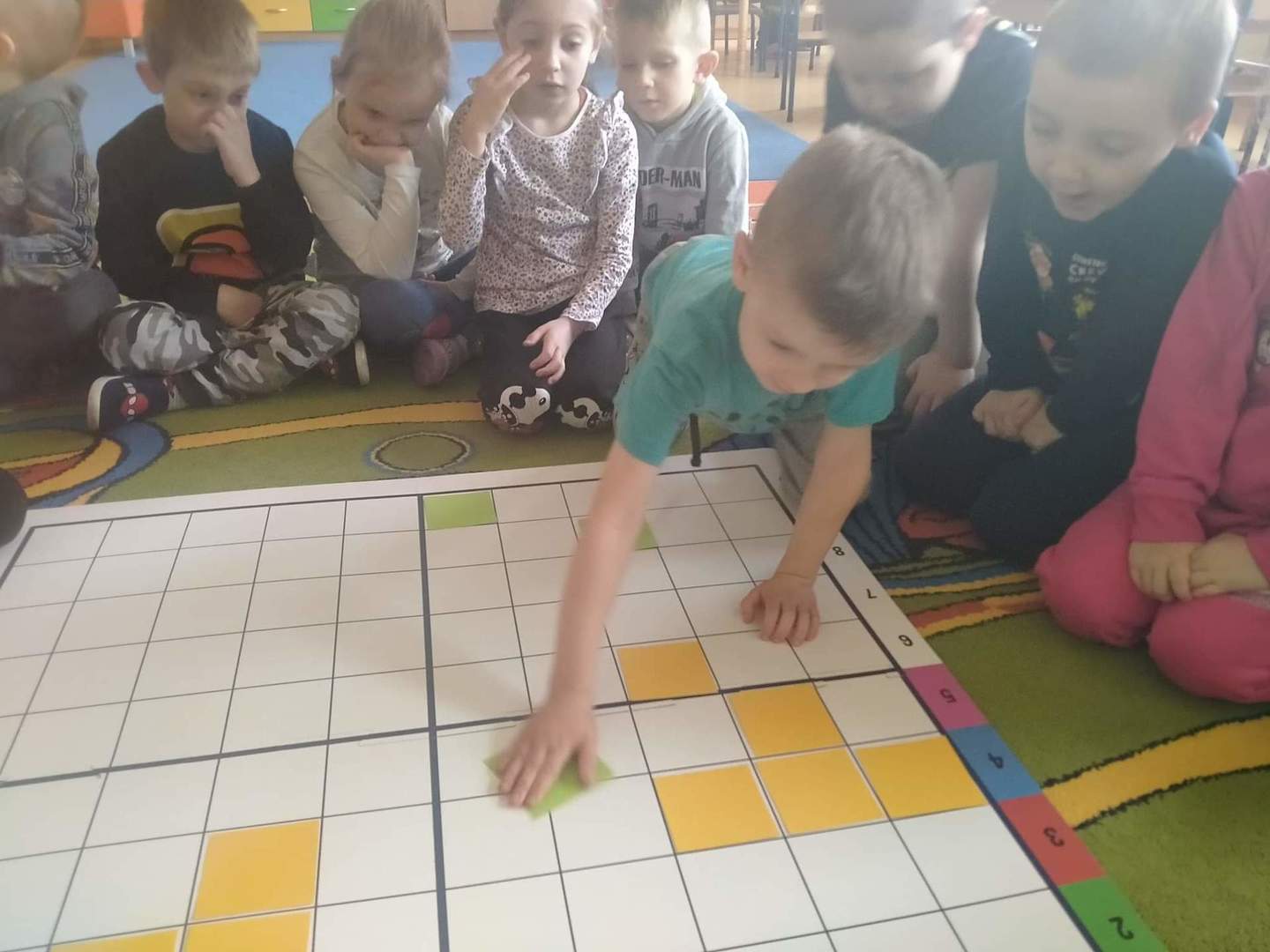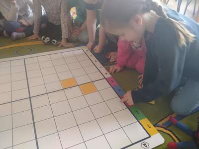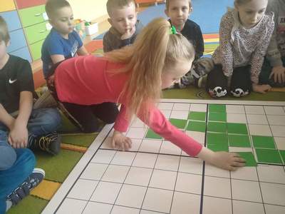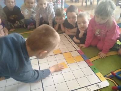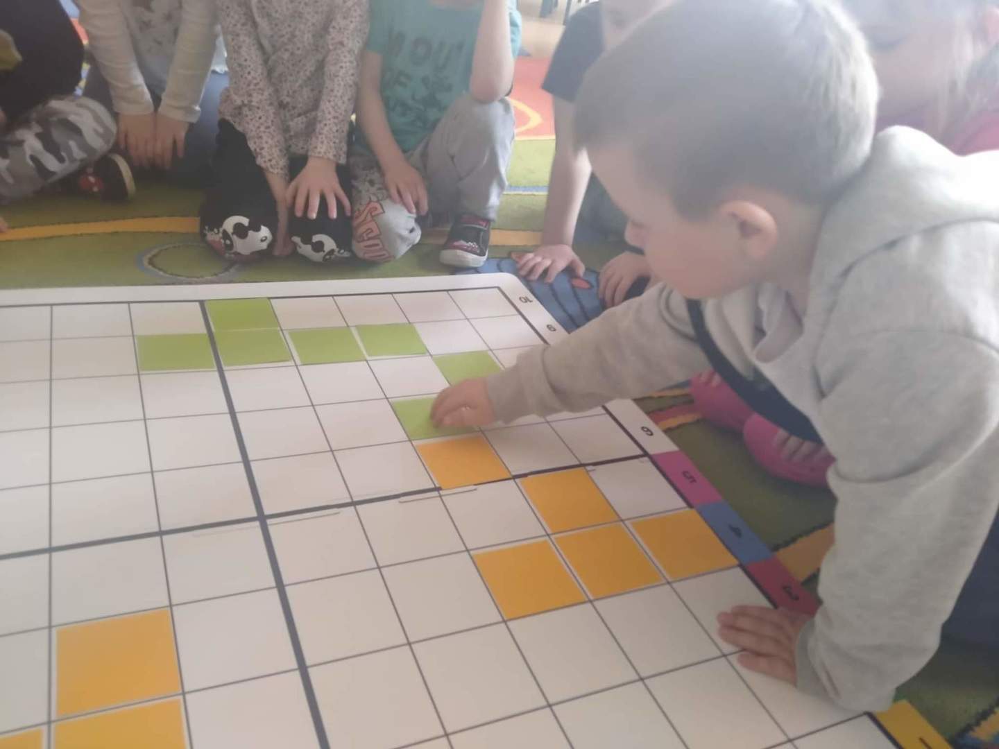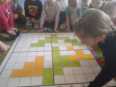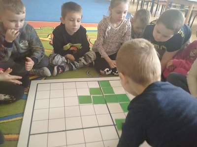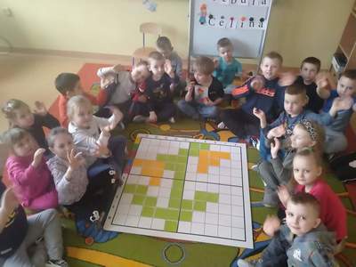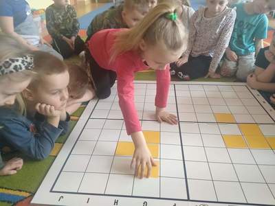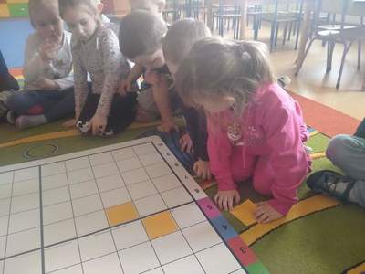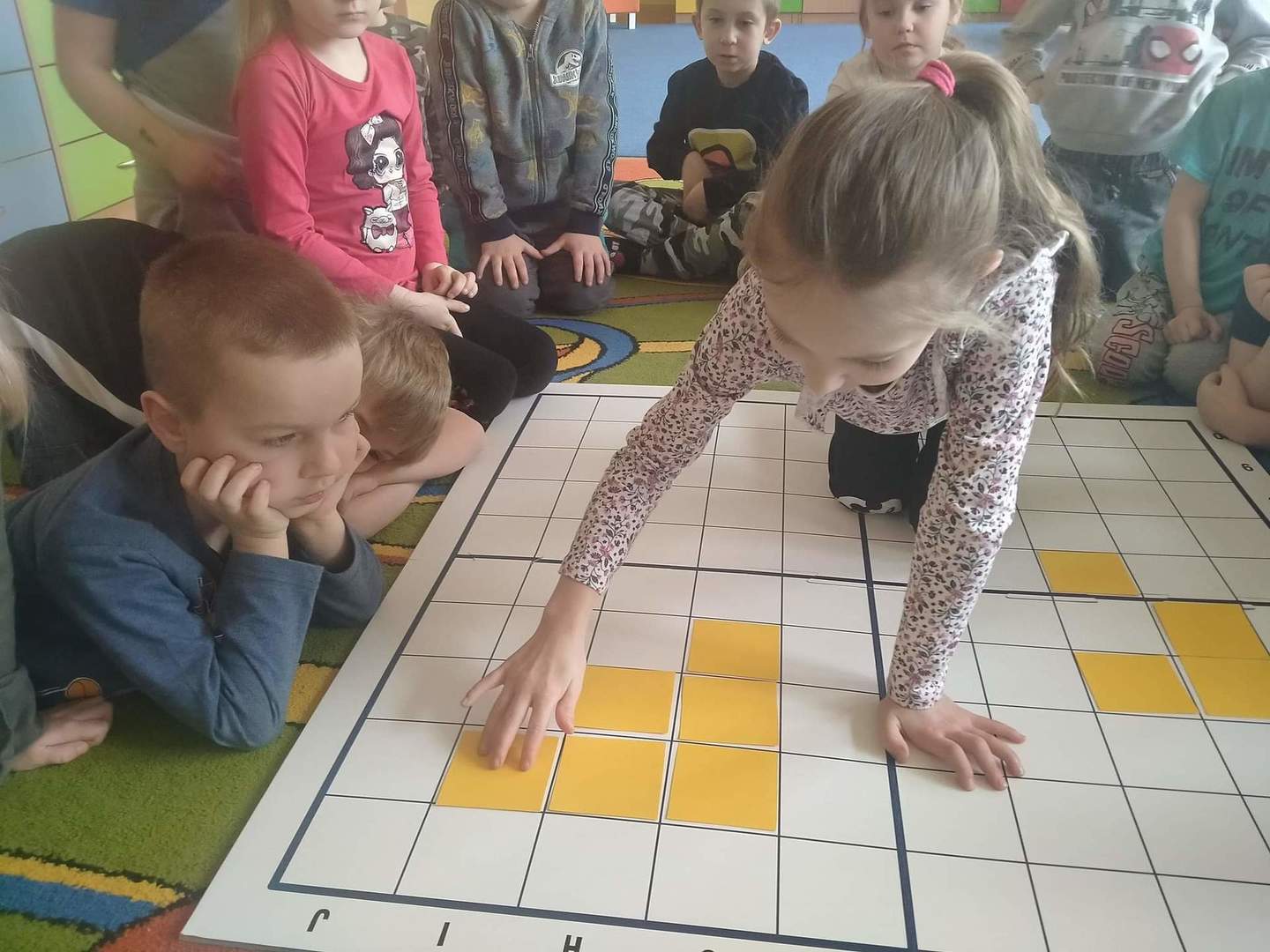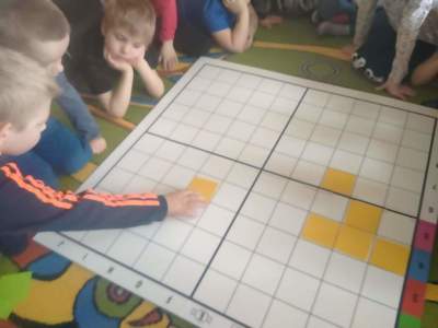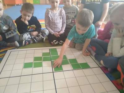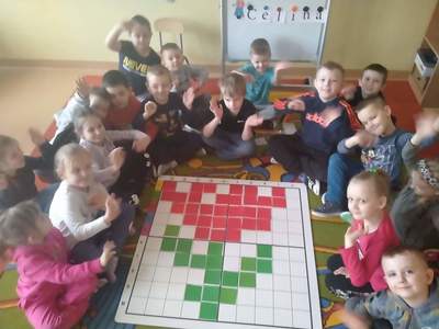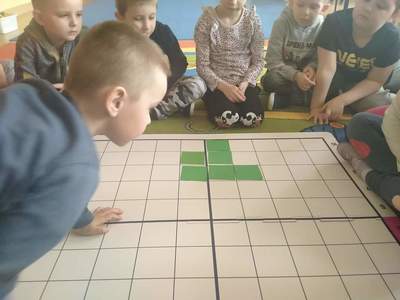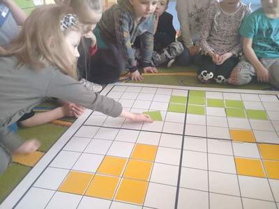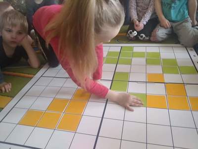 Zakodowany świat krasnala Hałabały - kolejne zadanie za nami. Tym razem przedszkolaki z grupy ,,Deszczowe Kropelki” wspólnie z Hałabałą bawiły się w kodowanie. Na macie układały wiosenne kwiaty z kolorowych kartonowych kwadratów. Był to pierwiosnek i tulipan. Dzieciom bardzo podobała się zabawa w kodowanie. Były zadowolone i szczęśliwe.