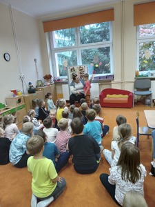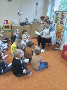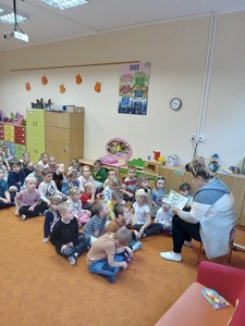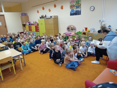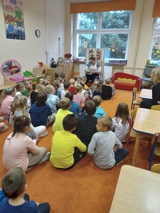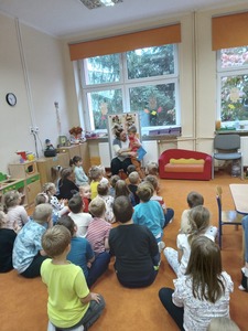 26 września odbyło się w przedszkolu pierwsze spotkanie z cyklu "Rodzic czyta - dziecko słucha" w ramach realizacji Narodowego Programu Rozwoju Czytelnictwa, w którym uczestniczyły grupy "Deszczowe Kropelki", "Tęczowe Nutki" i "Biedronki". Z tej okazji zaproszona została Pani Agata - mama Huberta z "Deszczowych Kropelek", która przeczytała dzieciom książeczkę "101 dalmatyńczyków". Przedszkolakom bardzo podobała się historia o pieskach. Z zainteresowaniem słuchały o ich przygodach i czekały na ilustracje do każdej z nich. Dziękujemy Pani Agacie za mile spędzony czas z dziećmi.