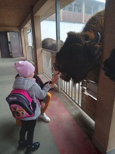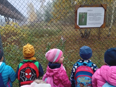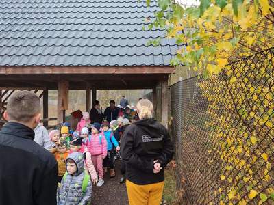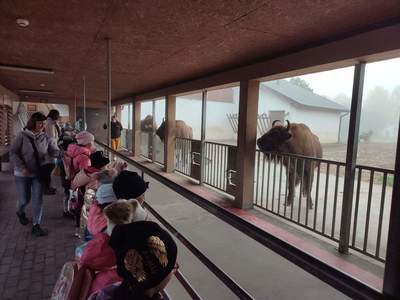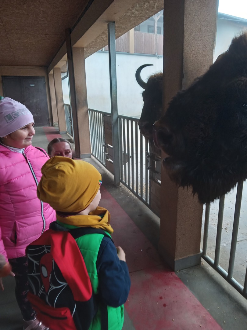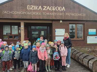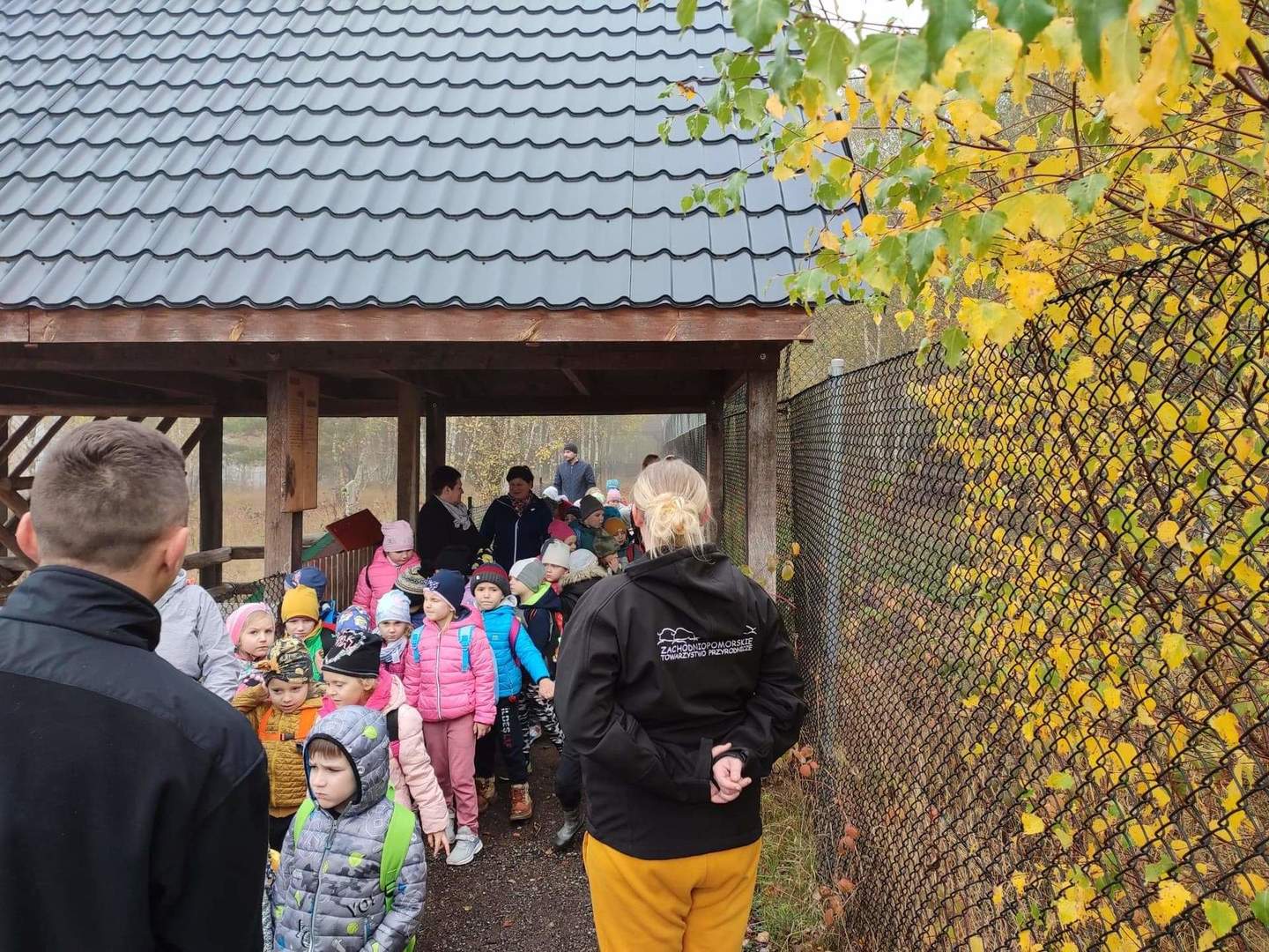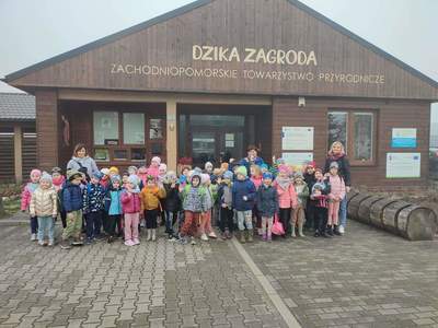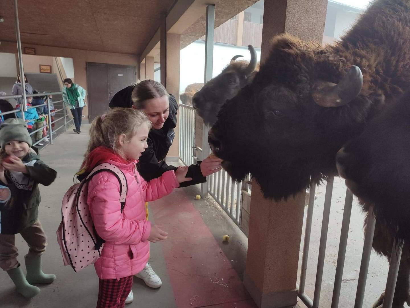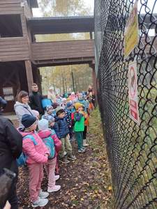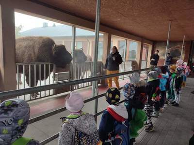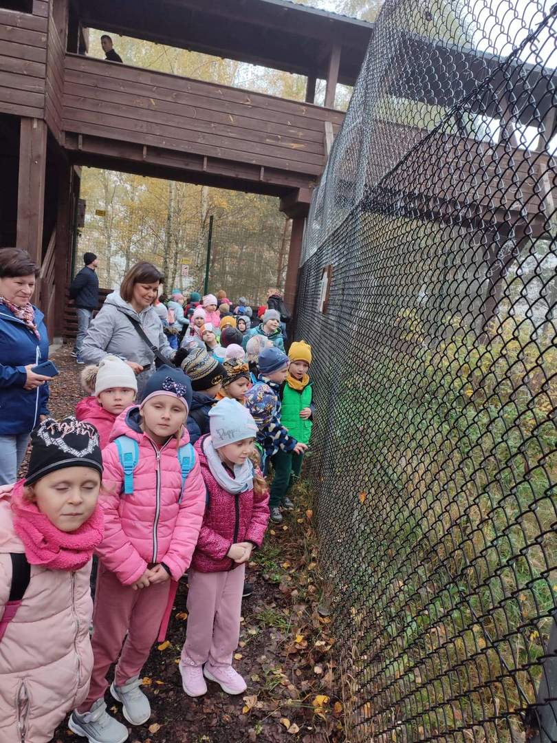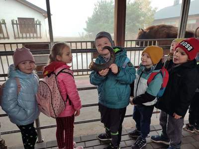 Edukacja w terenie niezwykle pobudza chęć zdobywania wiedzy, ale rozwija też szacunek do przyrody, ukazując jej niesamowite piękno i potrzebę pielęgnacji zwłaszcza zagrożonych gatunków. Dlatego też, 26 października Tęczowe Nutki i Biedronki uczestniczyły w wycieczce do Dzikiej Zagrody w Jabłonowie, której celem było zapoznanie dzieci z zagrodą i jej podopiecznymi. Już po wyjściu z autokaru dzieci wyraziły swój zachwyt i wielkie podekscytowanie. A czekało na nas wiele atrakcji…rozpoczęliśmy od spotkania z "prawdziwymi" żubrami. Dzieci mogły z bliska obserwować ich wygląd, dowiedziały się jakie mają imiona, poznały tajniki ich życia, a także co lubią jeść i jak się je karmi. Z pomocą Pani przewodniczki przedszkolaki z radością karmiły żubry jabłkami. Kolejnym punktem naszej wycieczki był spacer ścieżką edukacyjną i spotkanie z rysiem. Dzieci nie kryły emocji, kiedy zobaczyły piękne "koty" z pędzelkami na uszach. Z wielkim zainteresowaniem słuchały kolejnych ciekawostek o drapieżnikach. Wycieczkę zakończyliśmy przy ognisku. Dzieci ze smakiem zjadły upieczone kiełbaski i aktywnie spędziły czas na świeżym powietrzu. Zmęczeni, ale pełni wrażeń pożegnaliśmy pracowników zagrody oraz zwierzaki i wróciliśmy bezpiecznie do przedszkola.