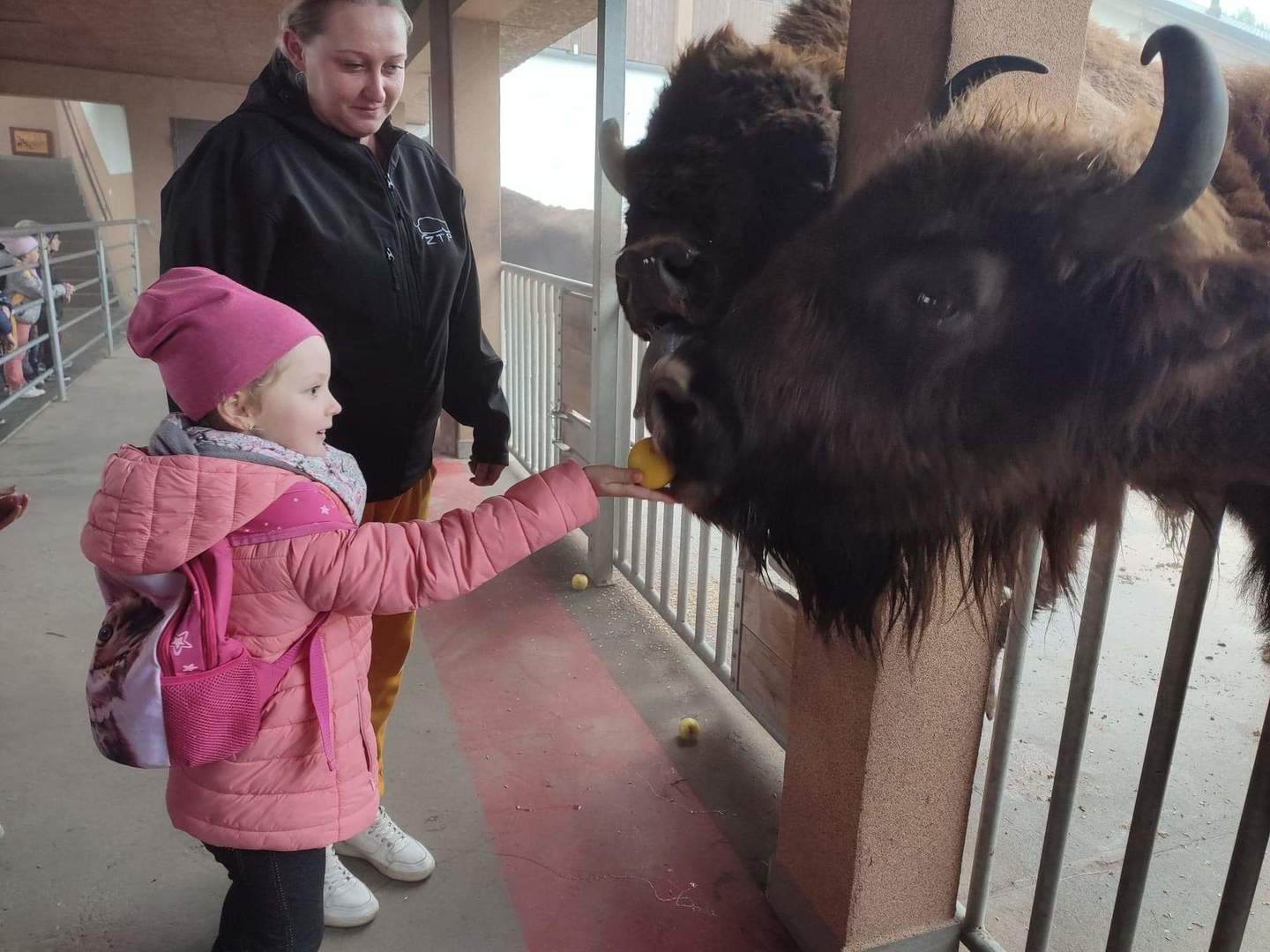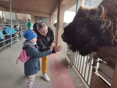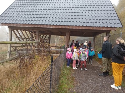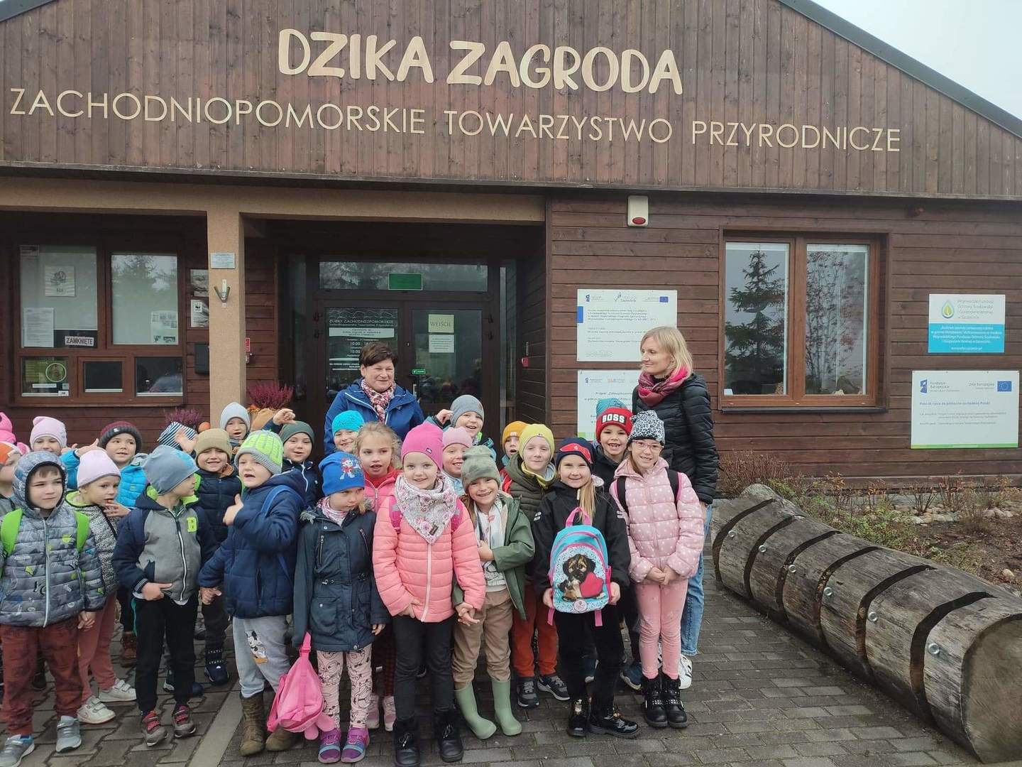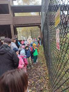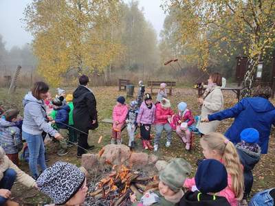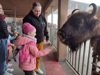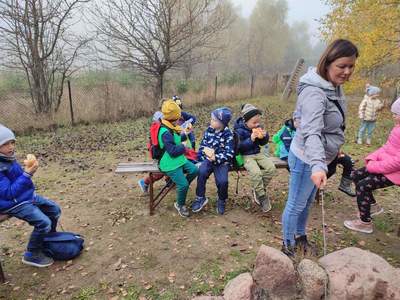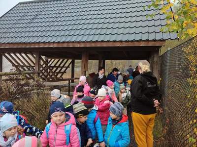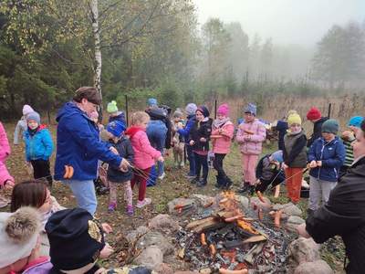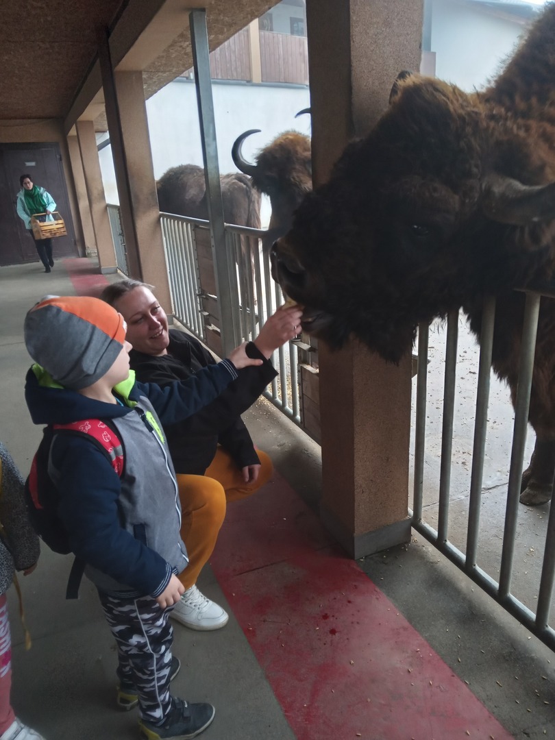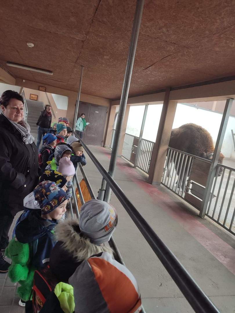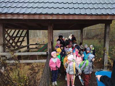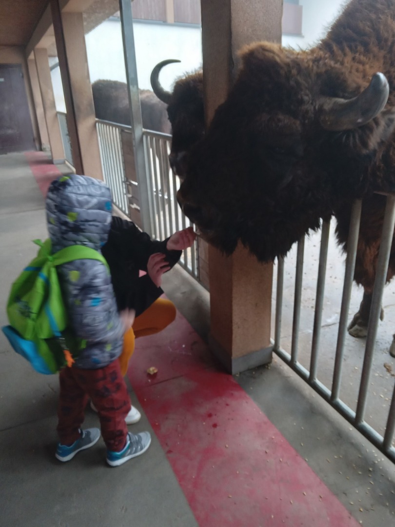 Edukacja w terenie niezwykle pobudza chęć zdobywania wiedzy, ale rozwija też szacunek do przyrody, ukazując jej niesamowite piękno i potrzebę pielęgnacji zwłaszcza zagrożonych gatunków. Dlatego też, 26 października Tęczowe Nutki i Biedronki uczestniczyły w wycieczce do Dzikiej Zagrody w Jabłonowie, której celem było zapoznanie dzieci z zagrodą i jej podopiecznymi. Już po wyjściu z autokaru dzieci wyraziły swój zachwyt i wielkie podekscytowanie. A czekało na nas wiele atrakcji…rozpoczęliśmy od spotkania z "prawdziwymi" żubrami. Dzieci mogły z bliska obserwować ich wygląd, dowiedziały się jakie mają imiona, poznały tajniki ich życia, a także co lubią jeść i jak się je karmi. Z pomocą Pani przewodniczki przedszkolaki z radością karmiły żubry jabłkami. Kolejnym punktem naszej wycieczki był spacer ścieżką edukacyjną i spotkanie z rysiem. Dzieci nie kryły emocji, kiedy zobaczyły piękne "koty" z pędzelkami na uszach. Z wielkim zainteresowaniem słuchały kolejnych ciekawostek o drapieżnikach. Wycieczkę zakończyliśmy przy ognisku. Dzieci ze smakiem zjadły upieczone kiełbaski i aktywnie spędziły czas na świeżym powietrzu. Zmęczeni, ale pełni wrażeń pożegnaliśmy pracowników zagrody oraz zwierzaki i wróciliśmy bezpiecznie do przedszkola.