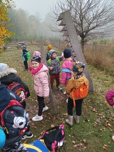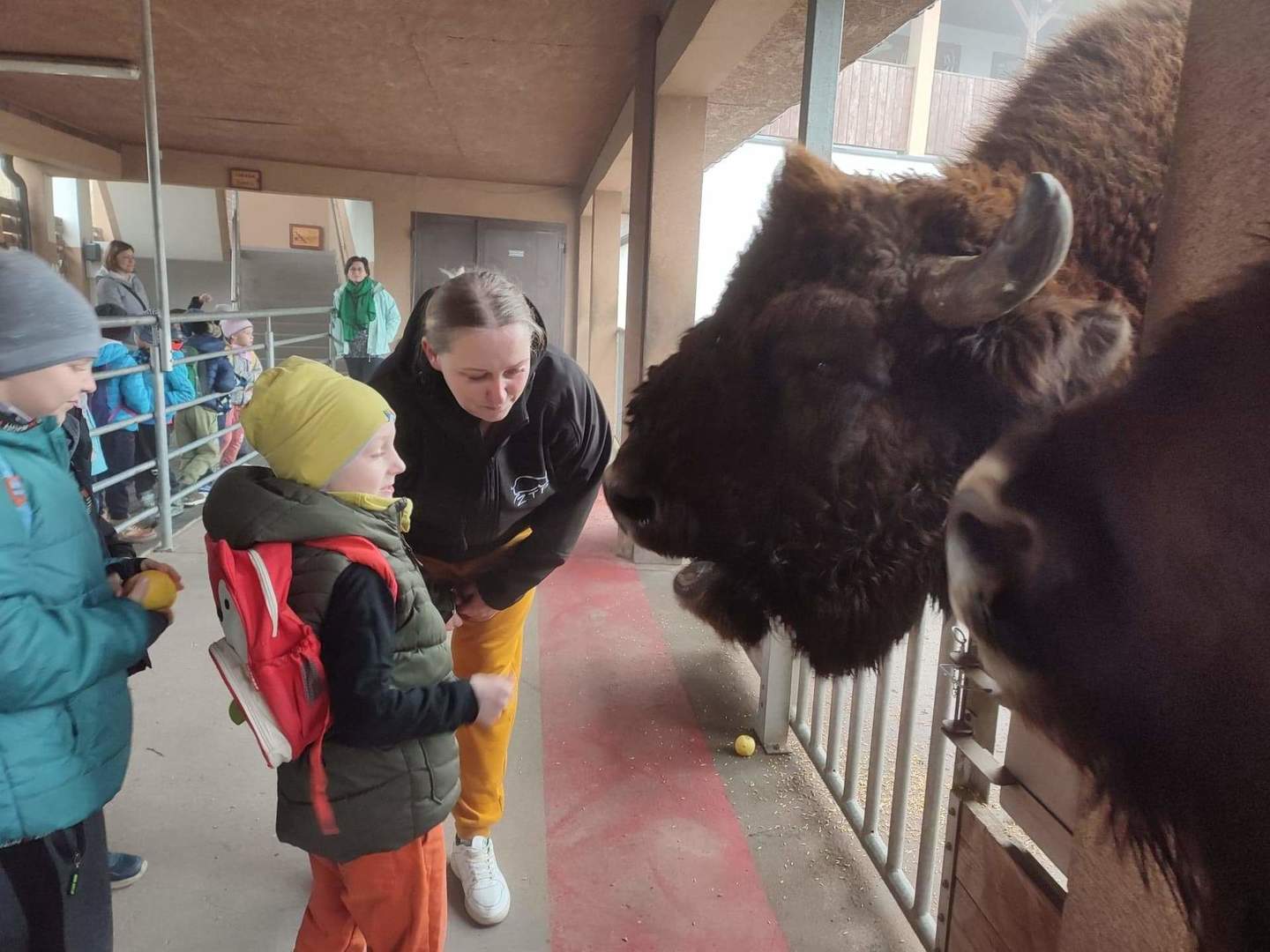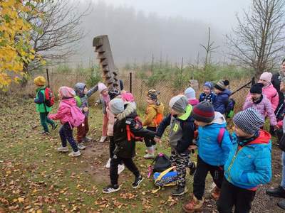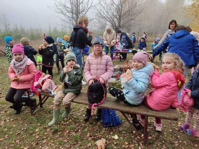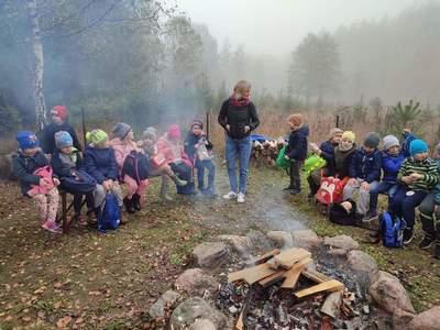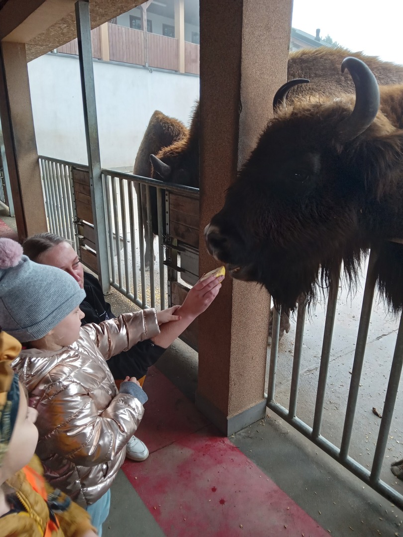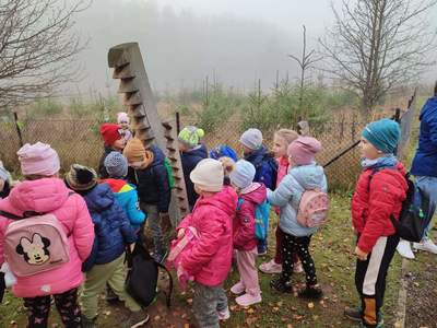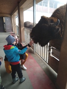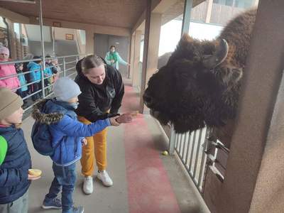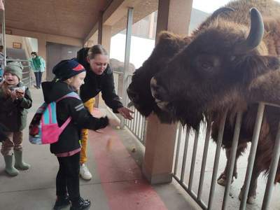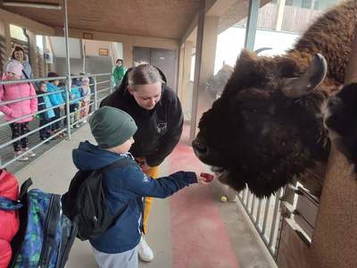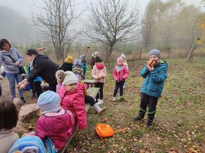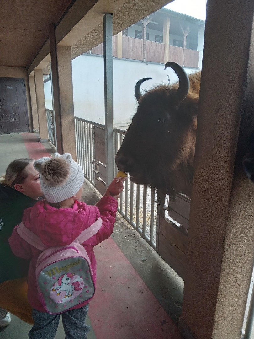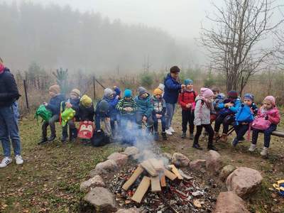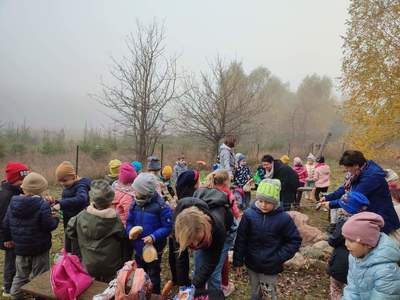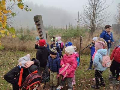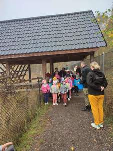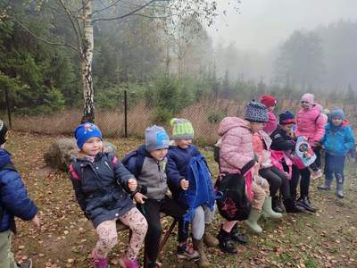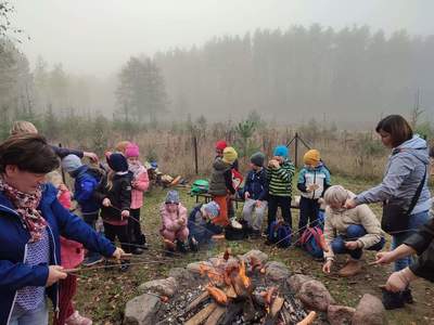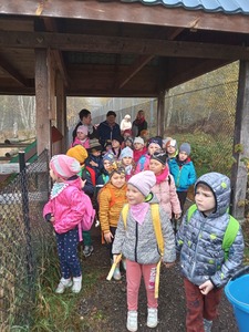 Edukacja w terenie niezwykle pobudza chęć zdobywania wiedzy, ale rozwija też szacunek do przyrody, ukazując jej niesamowite piękno i potrzebę pielęgnacji zwłaszcza zagrożonych gatunków. Dlatego też, 26 października Tęczowe Nutki i Biedronki uczestniczyły w wycieczce do Dzikiej Zagrody w Jabłonowie, której celem było zapoznanie dzieci z zagrodą i jej podopiecznymi. Już po wyjściu z autokaru dzieci wyraziły swój zachwyt i wielkie podekscytowanie. A czekało na nas wiele atrakcji…rozpoczęliśmy od spotkania z "prawdziwymi" żubrami. Dzieci mogły z bliska obserwować ich wygląd, dowiedziały się jakie mają imiona, poznały tajniki ich życia, a także co lubią jeść i jak się je karmi. Z pomocą Pani przewodniczki przedszkolaki z radością karmiły żubry jabłkami. Kolejnym punktem naszej wycieczki był spacer ścieżką edukacyjną i spotkanie z rysiem. Dzieci nie kryły emocji, kiedy zobaczyły piękne "koty" z pędzelkami na uszach. Z wielkim zainteresowaniem słuchały kolejnych ciekawostek o drapieżnikach. Wycieczkę zakończyliśmy przy ognisku. Dzieci ze smakiem zjadły upieczone kiełbaski i aktywnie spędziły czas na świeżym powietrzu. Zmęczeni, ale pełni wrażeń pożegnaliśmy pracowników zagrody oraz zwierzaki i wróciliśmy bezpiecznie do przedszkola.