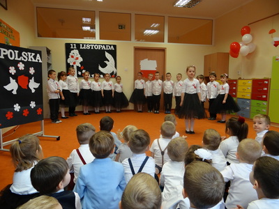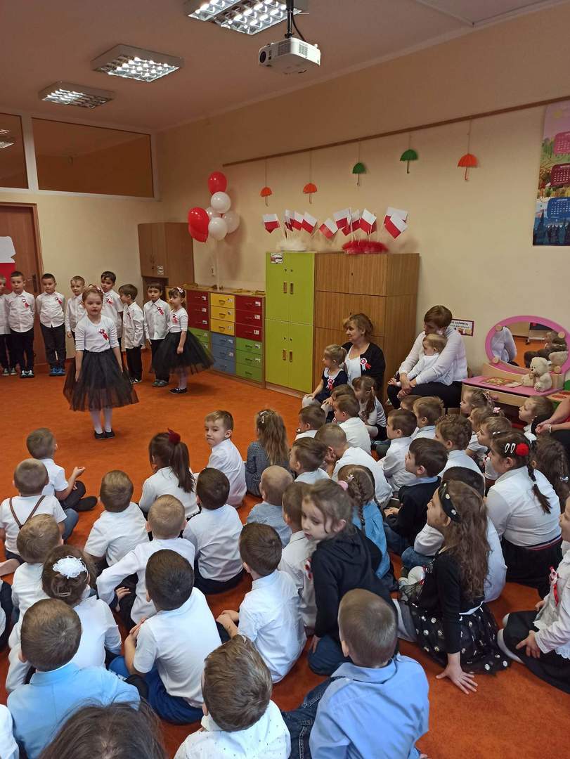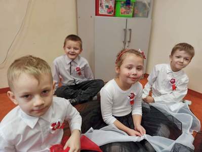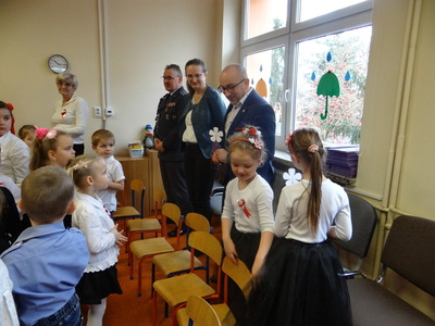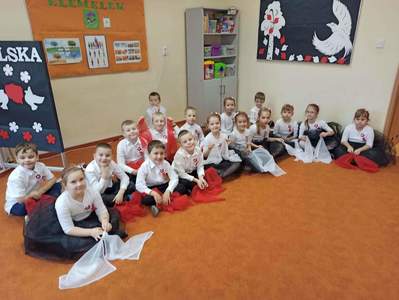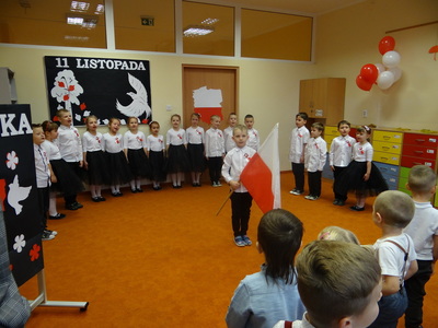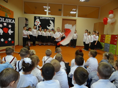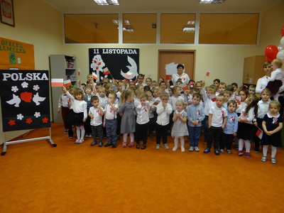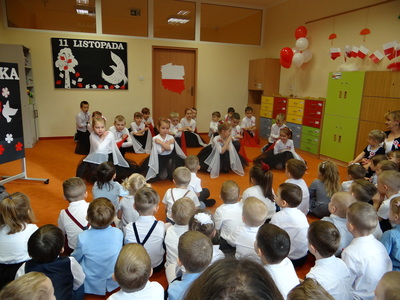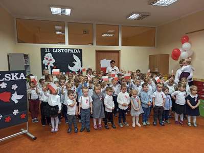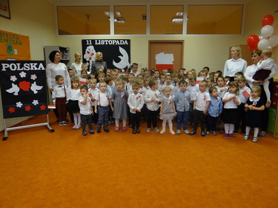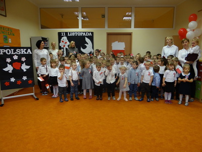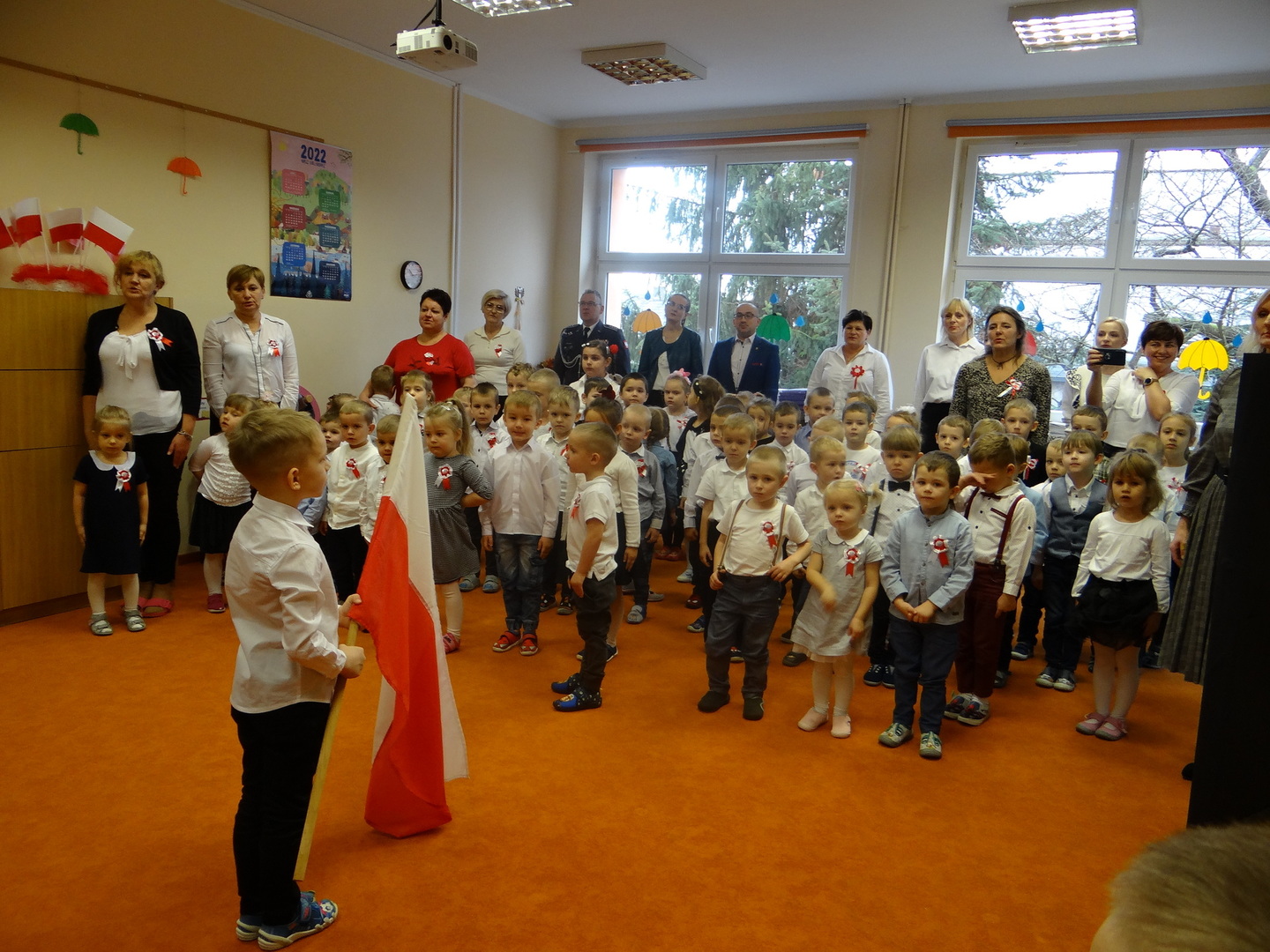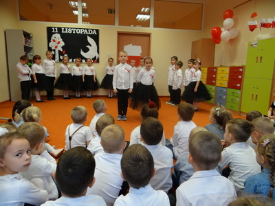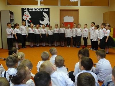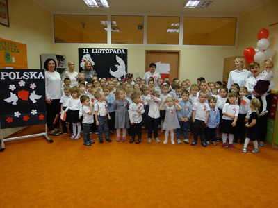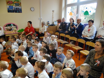Z okazji Święta Niepodległości "Tęczowe Nutki" z pomocą wychowawczyni - Pani Marty Maternowskiej - Połujańskiej, przygotowały występ artystyczny, którego głównym celem było kształtowanie miłości i przywiązania do kraju ojczystego, jego kultury, tradycji oraz kształtowanie znajomości symboli narodowych naszego kraju. Dzieci dumnie recytowały wiersze i śpiewały piosenki o charakterze patriotycznym. W uroczystości wzięli udział zaproszeni goście: Dariusz Bartosik - zastępca Burmistrza Mirosławca, Monika Stąporek - Sekretarz Gminy i Miasta Mirosławiec, st. chor. szt. Robert Kozłowski z 12 BBSP w Mirosławcu, Halina Rogowska - dyrektor Przedszkola "Słoneczko" w Mirosławcu, dzieci z każdej grupy przedszkolnej, wychowawczynie oraz pracownicy przedszkola. Występ dzieci wprowadził wszystkich w wyjątkowy, wzruszający i podniosły nastrój, który można było odczytać z twarzy zaproszonych gości. Udział w uroczystości przybliżył dzieciom nie tylko historię Polski, ale także wzbudził w małych serduszkach miłość do Ojczyzny i pokazał piękno naszego kraju, które małe przedszkolaki dopiero odkrywają. Na zakończenie spotkania, o godzinie 11.11, wszyscy obecni na uroczystości dumnie odśpiewali hymn Polski "Mazurka Dąbrowskiego".