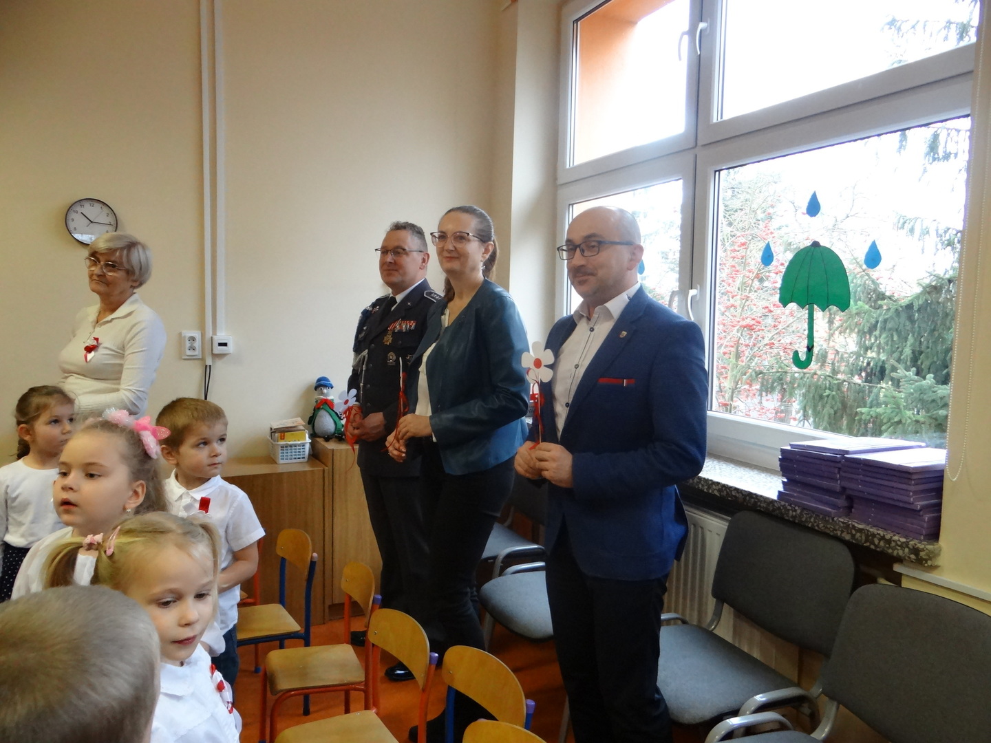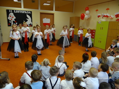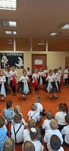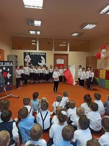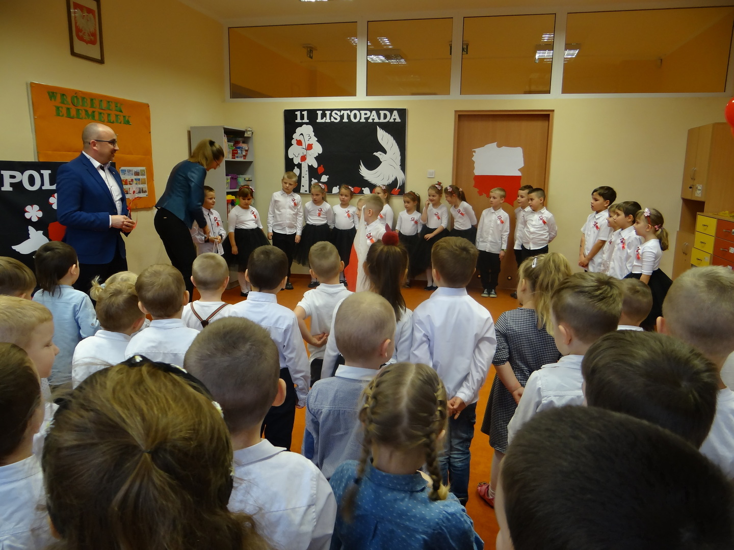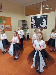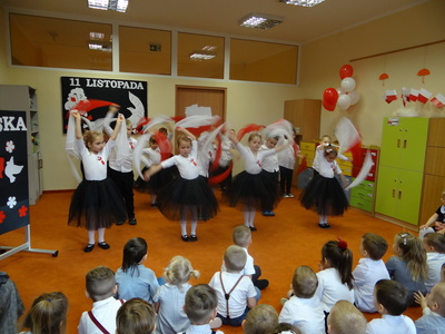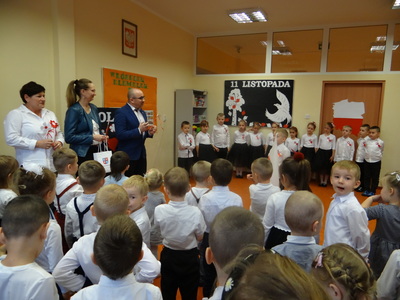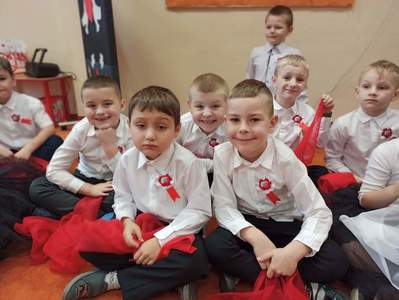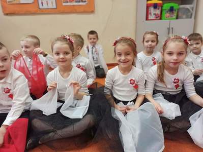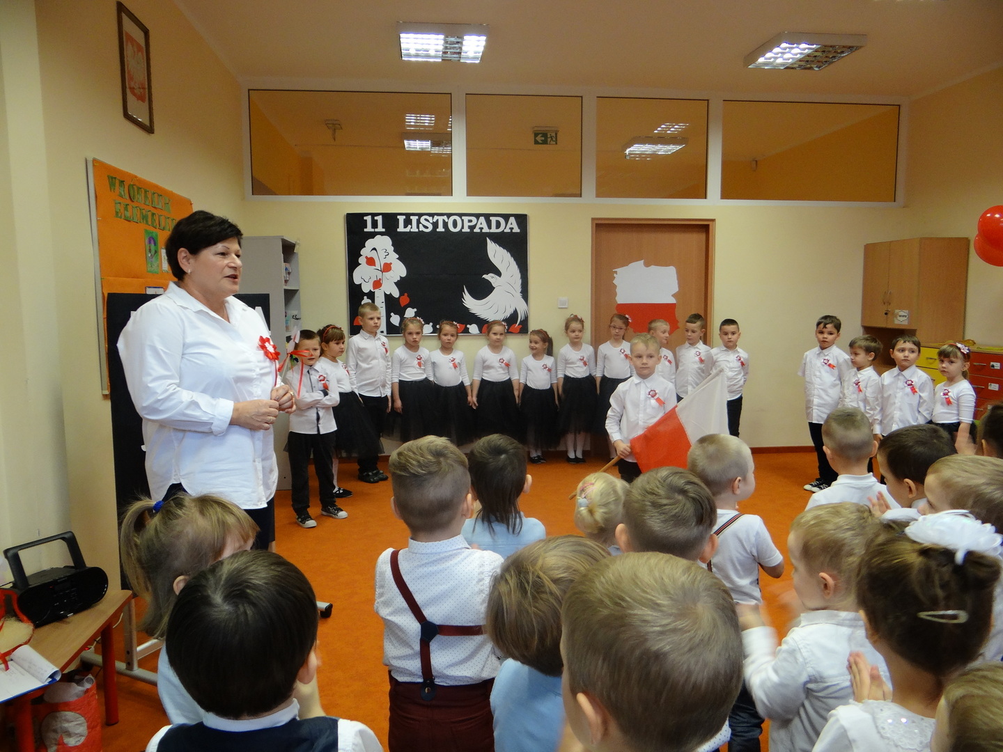 Z okazji Święta Niepodległości "Tęczowe Nutki" z pomocą wychowawczyni - Pani Marty Maternowskiej - Połujańskiej, przygotowały występ artystyczny, którego głównym celem było kształtowanie miłości i przywiązania do kraju ojczystego, jego kultury, tradycji oraz kształtowanie znajomości symboli narodowych naszego kraju. Dzieci dumnie recytowały wiersze i śpiewały piosenki o charakterze patriotycznym. W uroczystości wzięli udział zaproszeni goście: Dariusz Bartosik - zastępca Burmistrza Mirosławca, Monika Stąporek - Sekretarz Gminy i Miasta Mirosławiec, st. chor. szt. Robert Kozłowski z 12 BBSP w Mirosławcu, Halina Rogowska - dyrektor Przedszkola "Słoneczko" w Mirosławcu, dzieci z każdej grupy przedszkolnej, wychowawczynie oraz pracownicy przedszkola. Występ dzieci wprowadził wszystkich w wyjątkowy, wzruszający i podniosły nastrój, który można było odczytać z twarzy zaproszonych gości. Udział w uroczystości przybliżył dzieciom nie tylko historię Polski, ale także wzbudził w małych serduszkach miłość do Ojczyzny i pokazał piękno naszego kraju, które małe przedszkolaki dopiero odkrywają. Na zakończenie spotkania, o godzinie 11.11, wszyscy obecni na uroczystości dumnie odśpiewali hymn Polski "Mazurka Dąbrowskiego".