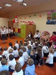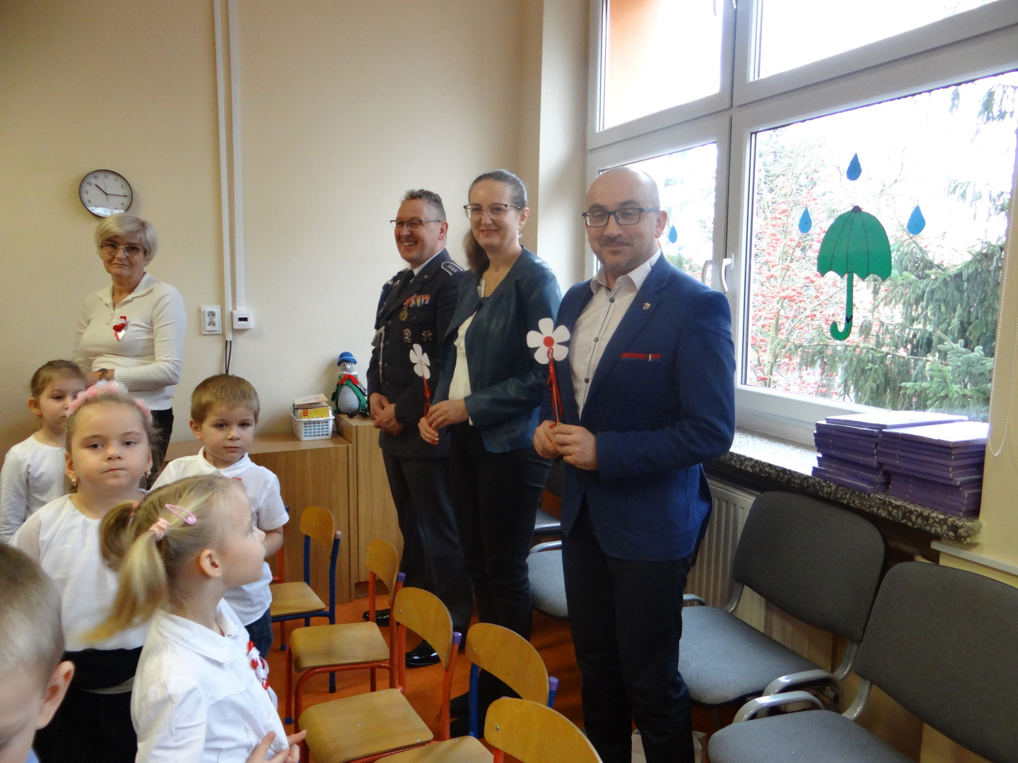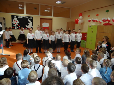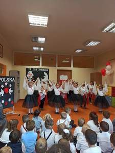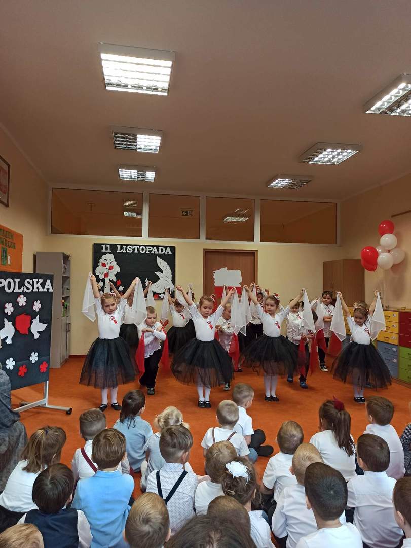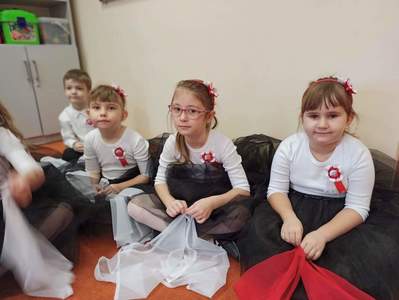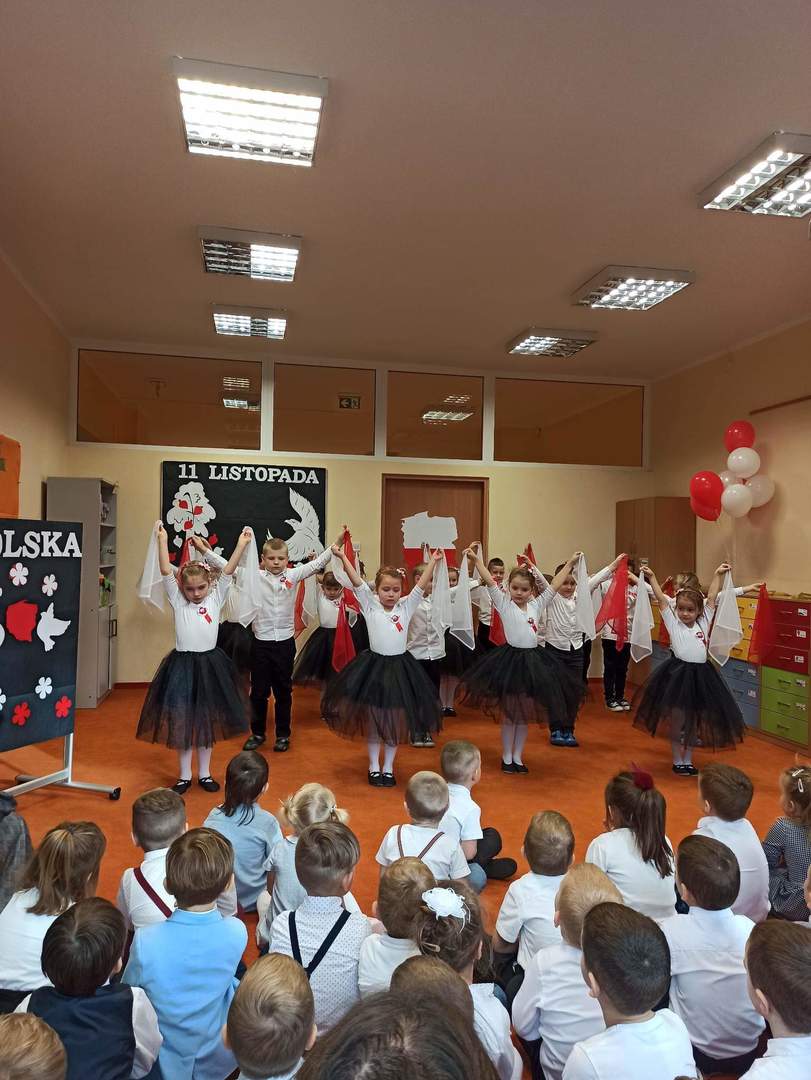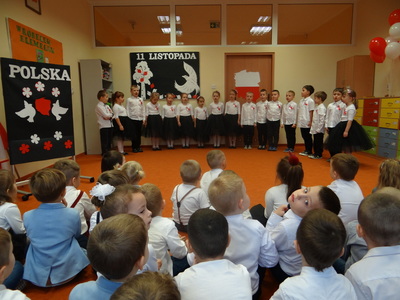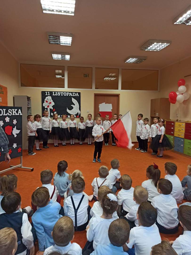 Z okazji Święta Niepodległości "Tęczowe Nutki" z pomocą wychowawczyni - Pani Marty Maternowskiej - Połujańskiej, przygotowały występ artystyczny, którego głównym celem było kształtowanie miłości i przywiązania do kraju ojczystego, jego kultury, tradycji oraz kształtowanie znajomości symboli narodowych naszego kraju. Dzieci dumnie recytowały wiersze i śpiewały piosenki o charakterze patriotycznym. W uroczystości wzięli udział zaproszeni goście: Dariusz Bartosik - zastępca Burmistrza Mirosławca, Monika Stąporek - Sekretarz Gminy i Miasta Mirosławiec, st. chor. szt. Robert Kozłowski z 12 BBSP w Mirosławcu, Halina Rogowska - dyrektor Przedszkola "Słoneczko" w Mirosławcu, dzieci z każdej grupy przedszkolnej, wychowawczynie oraz pracownicy przedszkola. Występ dzieci wprowadził wszystkich w wyjątkowy, wzruszający i podniosły nastrój, który można było odczytać z twarzy zaproszonych gości. Udział w uroczystości przybliżył dzieciom nie tylko historię Polski, ale także wzbudził w małych serduszkach miłość do Ojczyzny i pokazał piękno naszego kraju, które małe przedszkolaki dopiero odkrywają. Na zakończenie spotkania, o godzinie 11.11, wszyscy obecni na uroczystości dumnie odśpiewali hymn Polski "Mazurka Dąbrowskiego".