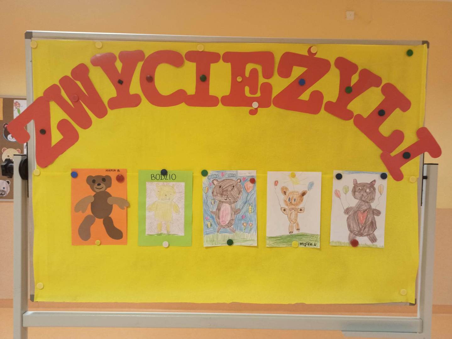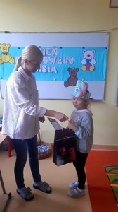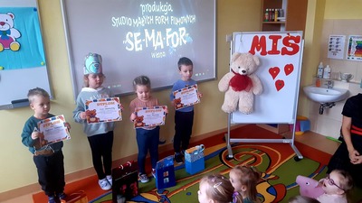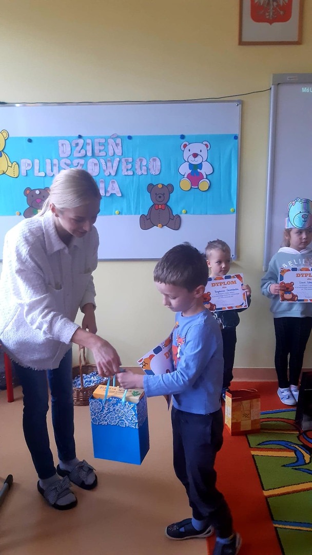 25 listopada przy okazji obchodów Dnia Pluszowego Misia w naszym przedszkolu został rozstrzygnięty konkurs plastyczny pt. "Mój pluszowy miś". Wszystkie grupy wykonały prace konkursowe, spośród których komisja wybrała pięć prac, których autorzy zostali nagrodzeni. Wybór był bardzo trudny, ponieważ każdy miś był piękny, a dzieci włożyły w wykonanie swojej pracy wiele serca. Wszystkie grupy spotkały się w sali grupy "Muchomorki", aby poznać zwycięzców. Z każdej grupy został wybrany jeden przedszkolak, którego praca została uznana za najciekawszą. Laureaci otrzymali dyplomy oraz nagrody rzeczowe a pozostałe dzieci - słodki poczęstunek za udział. Każda grupa biła gromkie brawa dla wyróżnionych kolegów i koleżanek.