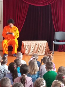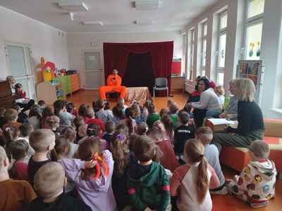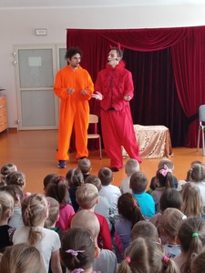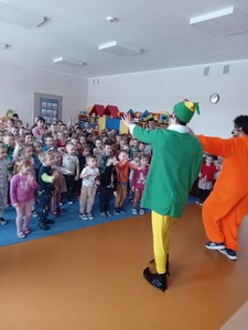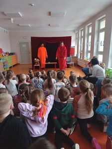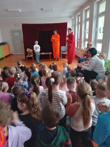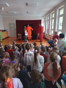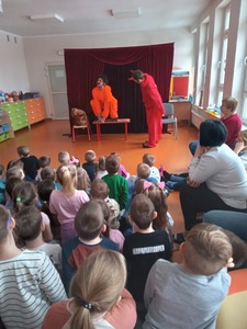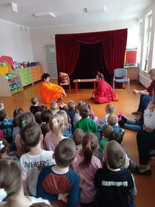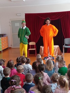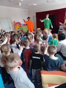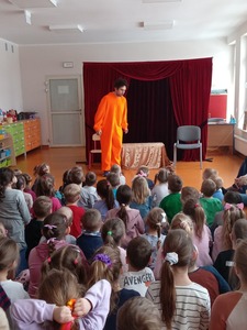 13 marca przedszkole odwiedzili aktorzy Teatru Kurtyna z Krakowa, którzy przedstawili dzieciom bajkę profilaktyczną pt.: „Tajemniczy skrzat”. Spektakl sfinansowany był przez Miejsko - Gminną Komisję Rozwiązywania Problemów Alkoholowych w Mirosławcu. Opowiadała ona o chłopcu - Piotrusiu, który był nadpobudliwy ruchowo i miał problem z rozładowaniem swojej ogromnej energii a zapracowani rodzice nie zawsze mieli czas zabierać chłopca na plac zabaw. Nudząc się popołudniami uwielbiał grać w gry w taty telefonie a wieczorami wykorzystywał swój wolny czas bawiąc się gamepadem, który dostał na urodziny. Ponieważ wbrew prośbom rodziców robił to stosunkowo za długo to często bolały go oczy i głowa. Pewnego wieczoru podstępnie i wbrew woli rodziców, chcąc przejść kolejny etap ulubionej gry, przemycił do swojego pokoju gamepad. Kiedy pochłonięty pokonywaniem kolejnych przeszkód bawił się w najlepsze, niespodziewanie odwiedził go tajemniczy gość. Był to Skrzat Franek, który zamiast przez swoją szafę trafić do baśniowego świata Narnii, przypadkiem znalazł się w szafie i pokoju Piotrka. Po zabawnym i emocjonalnym zapoznaniu się z chłopcem, Franek poprosił Piotrka o pomoc w zaopiekowaniu się tajemniczym pudełkiem. Dla Skrzatów było ono niezwykle ważne a dodatkowo nikomu nie wolno go otworzyć. Powierzone zadanie spowodowało interesujący i zabawny splot zdarzeń a Piotrek musiał się zmierzyć ze swoimi słabościami a także z pokusami kolejnego nieproszonego gościa. Bajka „Tajemniczy Skrzat” zwraca uwagę na problemy współczesnych, przebodźcowanych dzieci, których często jedyną rozrywką jest oglądanie filmików w telefonie lub granie na konsolach. Dzieci cierpiących na brak wspólnej zabawy z rówieśnikami i brak przebywania na świeżym powietrzu. Była to niezwykle pouczająca lekcja dla przedszkolaków. Dziękujemy.
