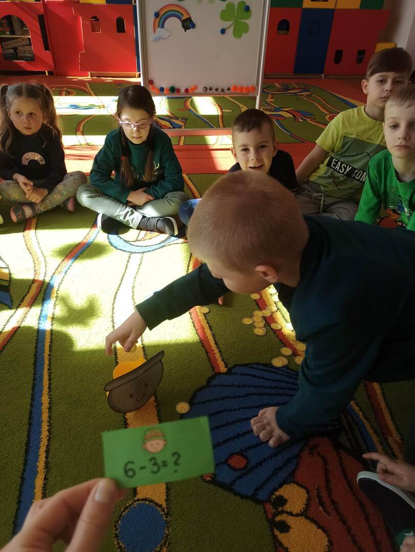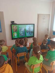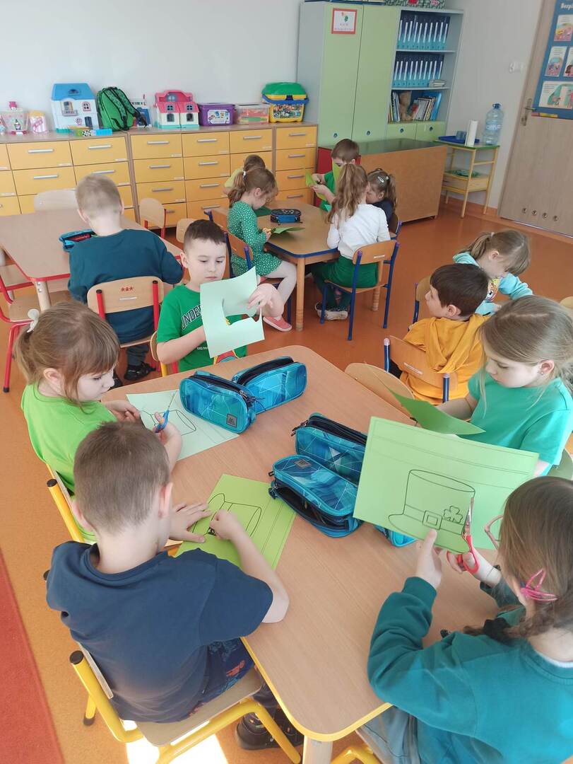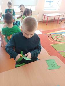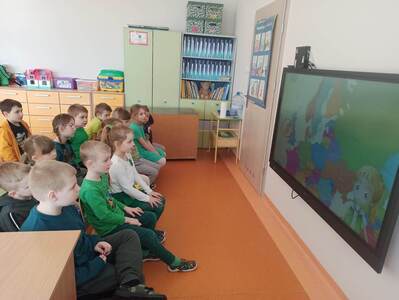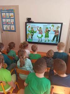 Starszaki obejrzały na nowej tablicy multimedialnej film edukacyjny dotyczący genezy a także tradycji związanych z obchodami tego święta. Dzieci poznały znaczenie wiele charakterytycznych dla tego święta symboli - koloru zielonego,konicznki, tęczy, skrzata Leprechauna a także dowiedziały się jak wygląda flaga Irlandii. Dzieci świetnie bawiły się przy dźwiękach irlandzkiej muzyki a na koniec wykonały swoje własne opaski-kapelusze.