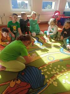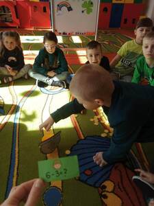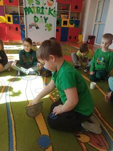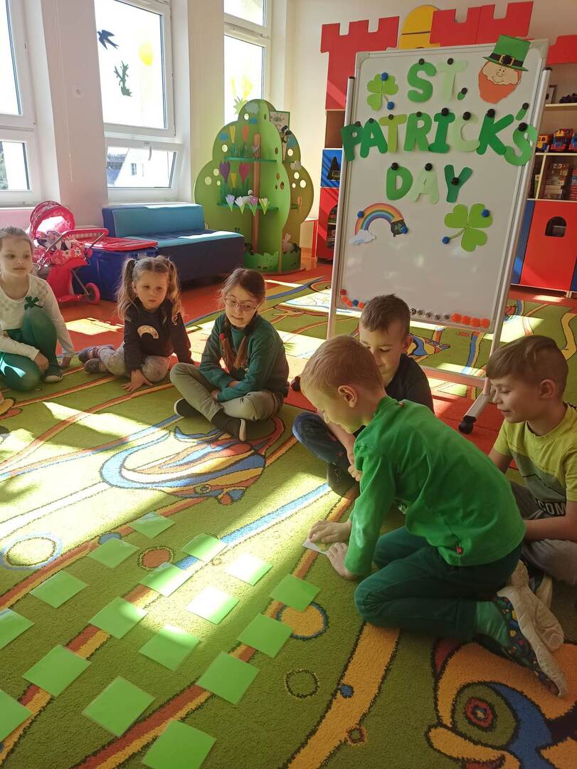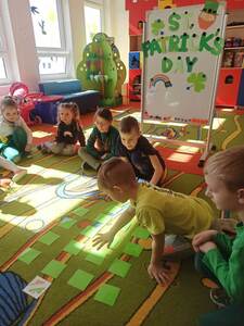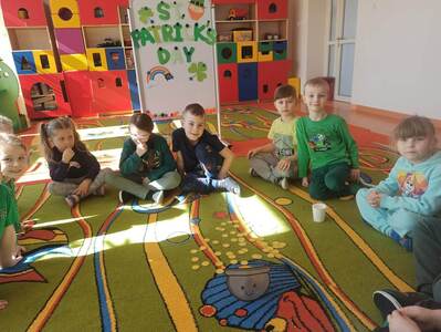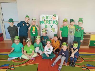 17 marca dzieci z grupy "Tęczowe Nutki" uczestniczyły w zajęciach języka angielskiego, których celem było poznanie tradycji i zwyczajów związanych z obchodami Dnia Świętego Patryka (irlandzkie święto narodowe i religijne).  Obowiązującym kolorem tego dnia była zieleń, nawiązująca do trawiastego krajobrazu Irlandii i symbolizująca koniczynę.