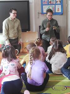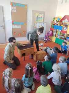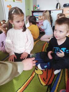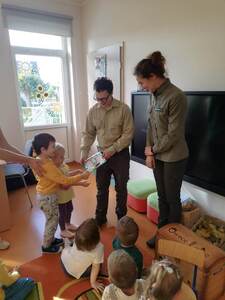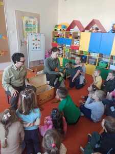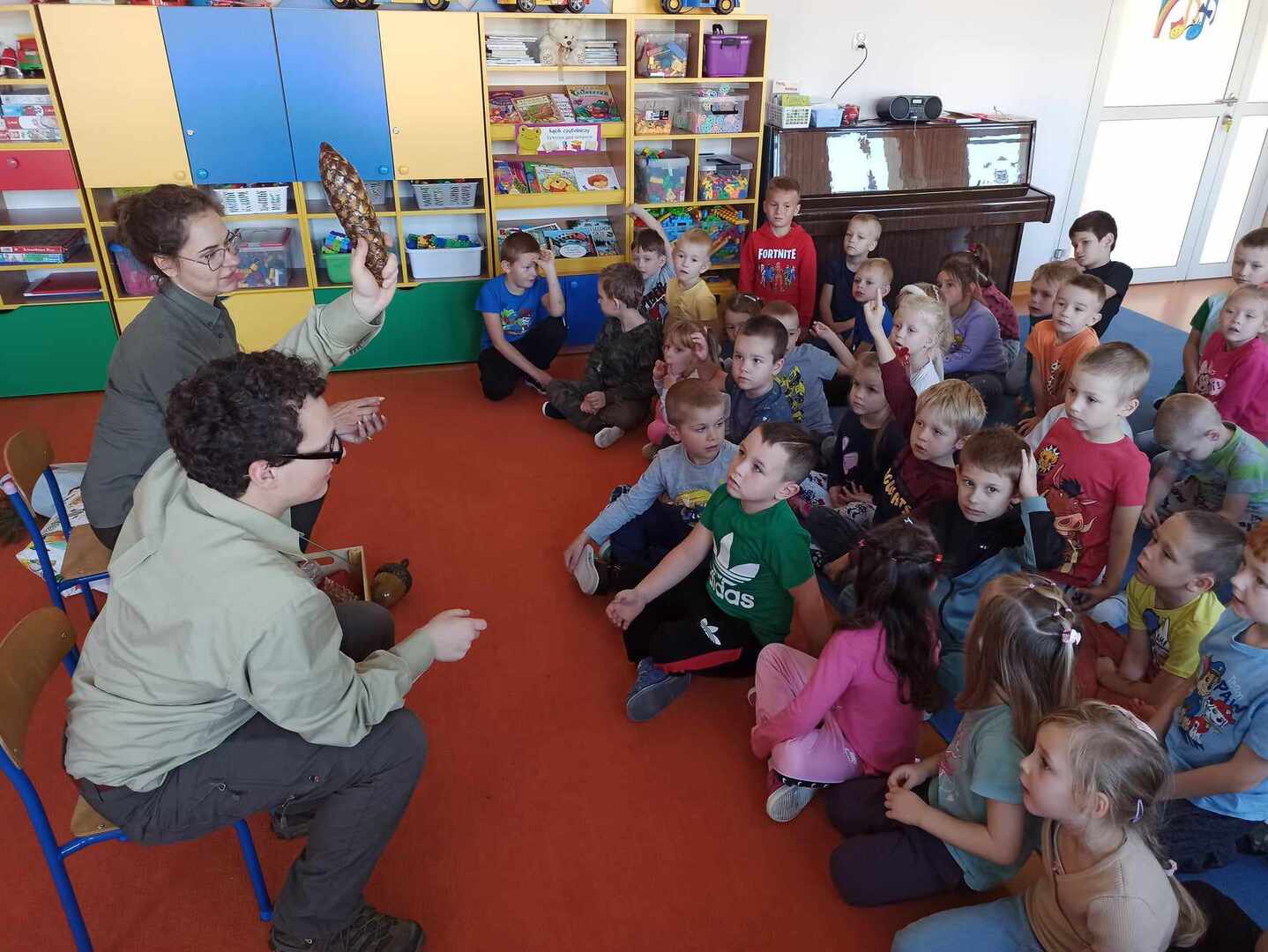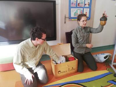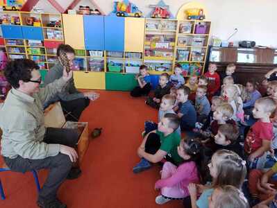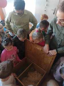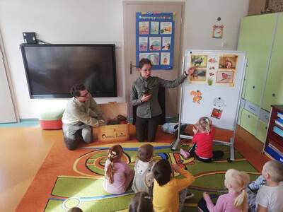 10. października przedszkolaków odwiedzili niezwykli goście - leśnicy pracujący na co dzień w Nadleśnictwie Mirosławiec. Na początku spotkania nasi goście  opowiedzieli dzieciom  o swojej pracy, o lesie i mieszkających w nim zwierzętach. Podkreślili, że człowiek jest gościem w lesie i musi szanować zwyczaje gospodarzy, czyli zwierząt w nim mieszkających. Podczas spotkania dzieci miały okazję poznać zwyczaje wybranych zwierząt zamieszkujących lasy naszej okolicy. Uczestnicy spotkania dowiedzieli się także, w jaki sposób pomóc zwierzętom przetrwać zimę i dlaczego niektóre zwierzęta gromadzą zapasy, a inne zapadają w sen zimowy. Leśnicy poruszyli również temat bezpieczeństwa podczas spacerów po lesie. Dzieci z olbrzymim zainteresowaniem  wysłuchały wielu ciekawostek o ptakach, drzewach, a także o jeżach, dla których goście przynieśli specjalny domek, który został postawiony na placu przedszkolnym. Podczas spotkania leśnicy zadawali  przedszkolakom wiele pytań i zagadek, z którymi dzieciaki świetnie sobie poradziły. W nagrodę otrzymały kolorowanki i kredki.