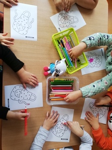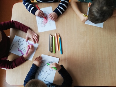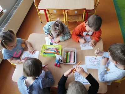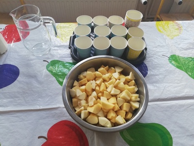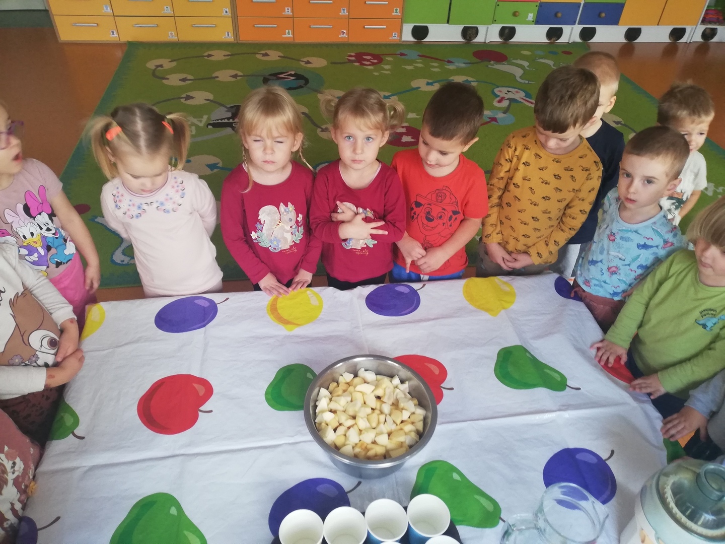 Dnia 23 i 24 października w grupie "Krasnoludki" został zrealizowany kolejny temat programu edukacyjnego " Z Kicią Kocią maluchy zmieniają się w zuchy". W pierwszej kolejności dzieci wysłuchały opowiadania pt. " Kicia Kocia gotuje", z którego dowiedziały się jakie zasady bezpieczeństwa obowiązują podczas gotowania i jakie higieniczne czynności należy wykonać aby do przygotowywanych posiłków nie trafiły zarazki. Następnie przedszkolaki pokolorowały fatuch kuchenny, który odziewa każdego dobrego kucharza. W dniu kolejnym dzieci wraz z wychowawczynią przygotowały przepyszny sok z jabłek i marchewki.