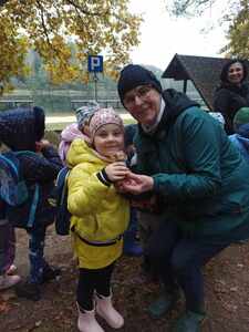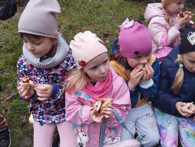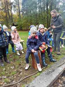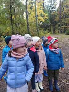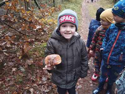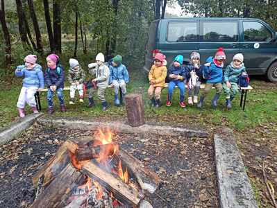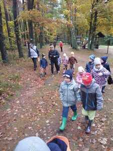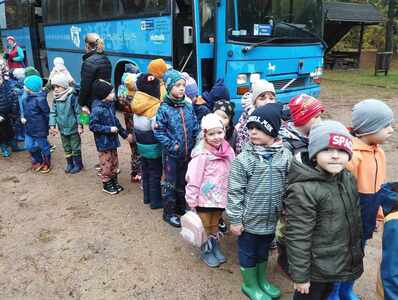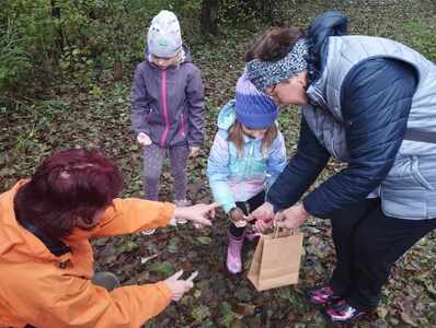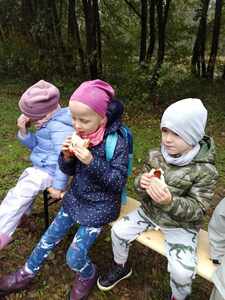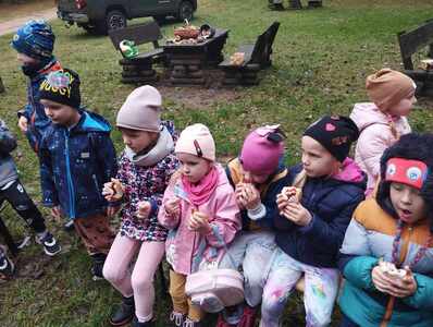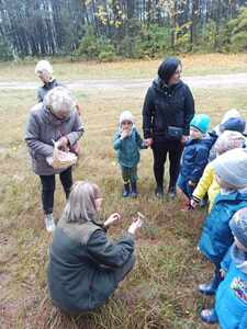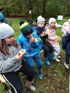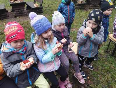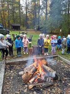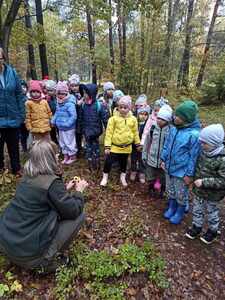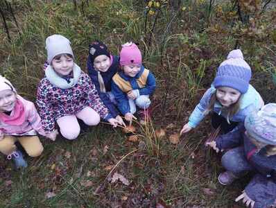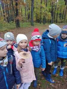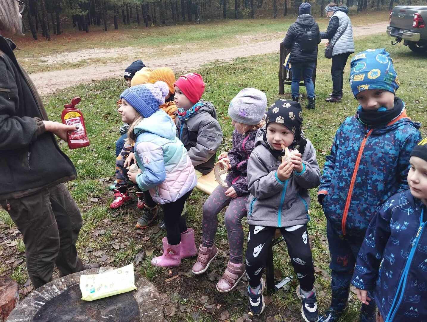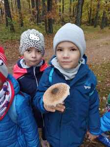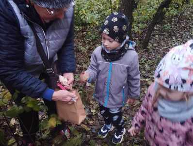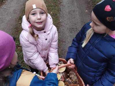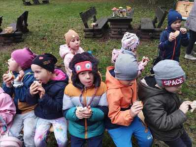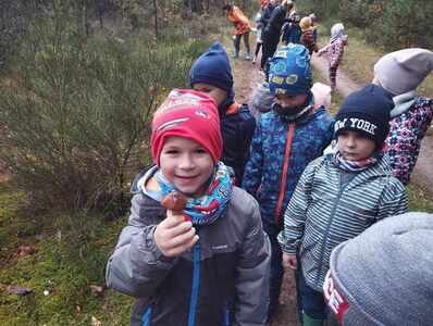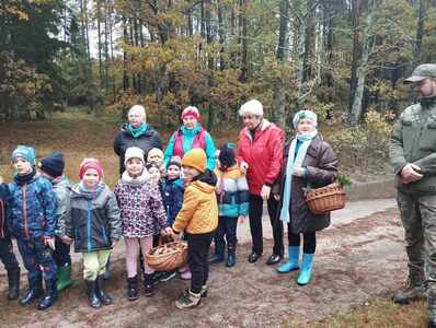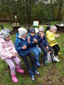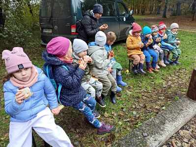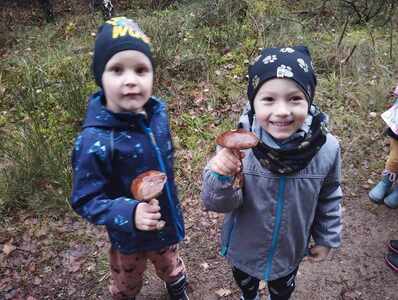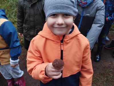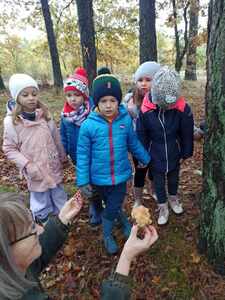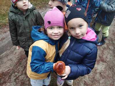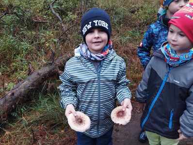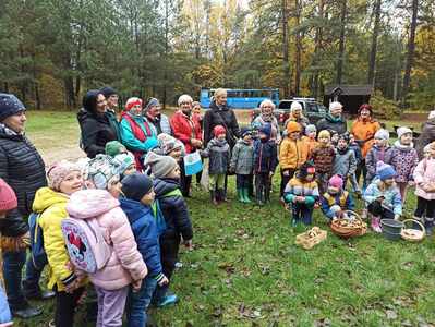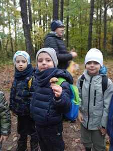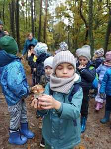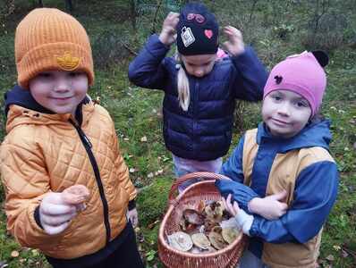 26 października 2023r. "Tęczowe Nutki" i "Deszczowe Kropelki", na zaproszenie Nadleśnictwa z Mirosławca, udały się autobusem na wycieczkę do lasu przy Jeziorze Harcerskim w Mirosławcu. Na miejscu również czekali na dzieci członkowie Stowarzyszenia "Cztery Pory Roku" z Mirosławca. Głównym celem wycieczki było wspólne grzybobranie. Do koszyków trafiały maślaki, prawdziwki, koźlarze... Każdy znaleziony wspólnie okaz sprawiał dzieciom ogromną radość. Przy okazji grzybobrania dzieci mogły też obserwować las jesienią i podziwiać piękne jesienne kolory. Po wielkich poszukiwaniach i spacerze w lesie, na przedszkolaki czekały smaczne kiełbaski i ciepła herbata, które znikały w mgnieniu oka. Dzieci wspaniale się bawiły, utrwaliły sobie nazwy jadalnych grzybów i dowiedziały się jak należy prawidłowo zbierać grzyby, a także aktywnie spędziły czas na świeżym powietrzu. To wszystko sprawiło, że wycieczka była bardzo udana. Na pamiątkę wspólnego grzybobrania dzieci dostały piękne upominki. Dziękujemy.