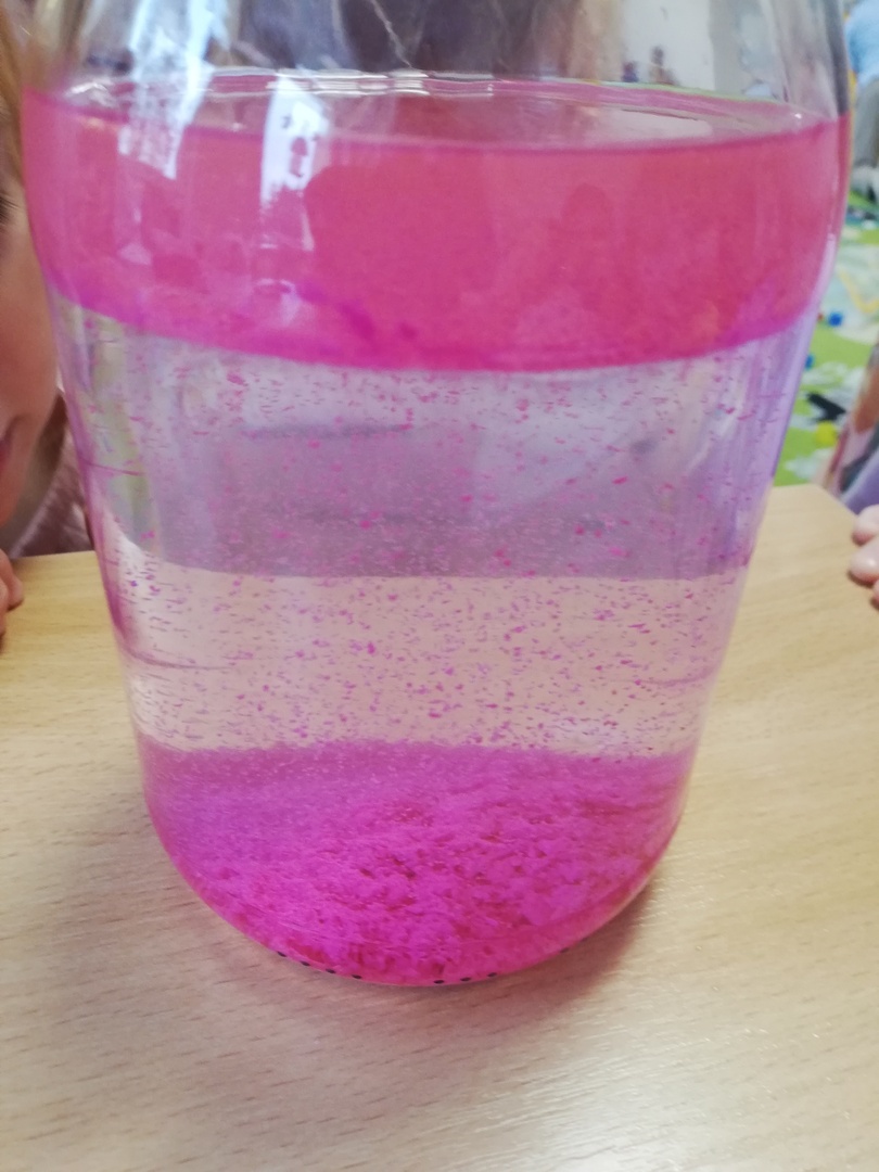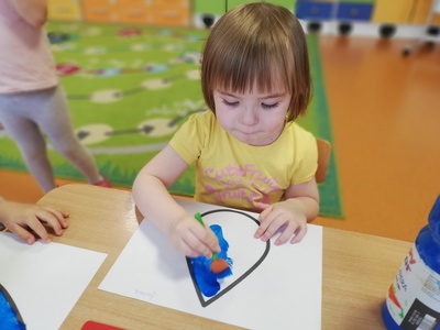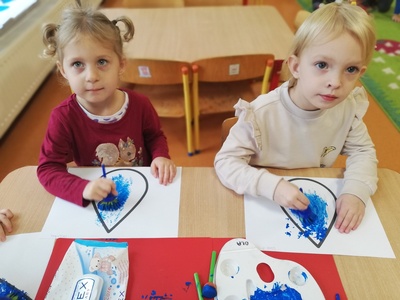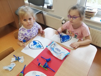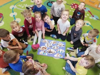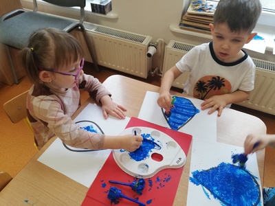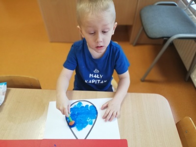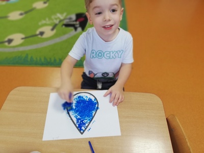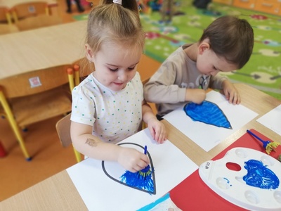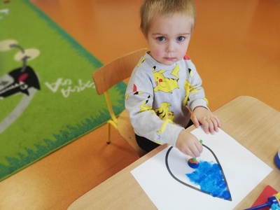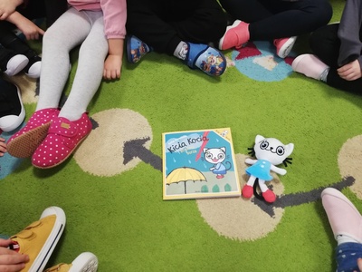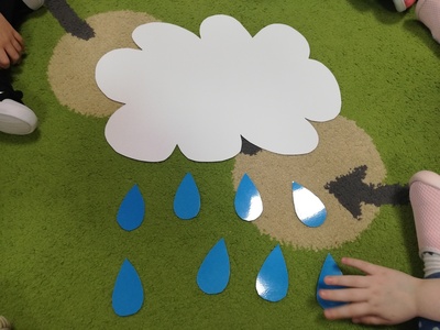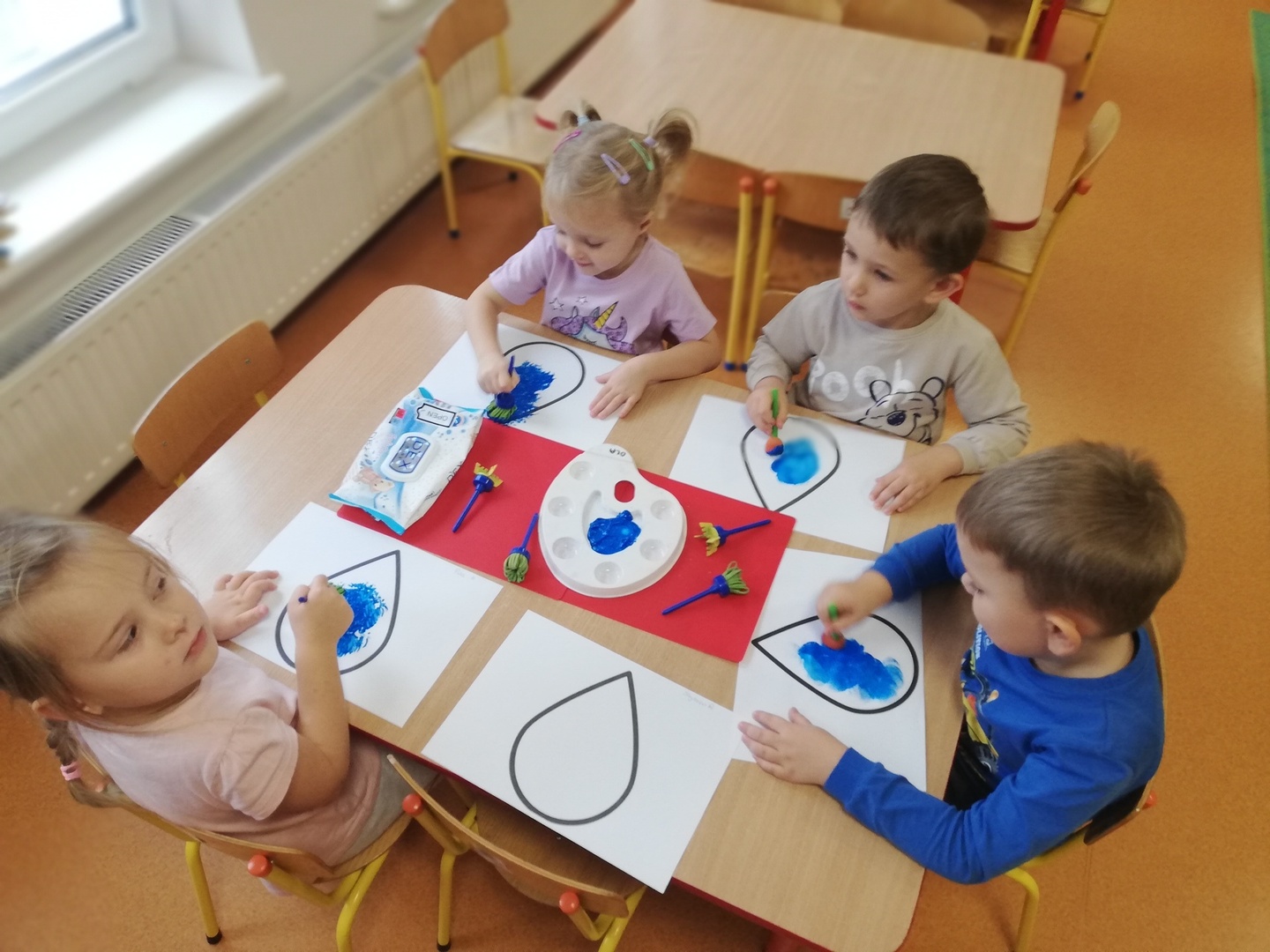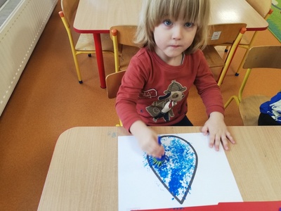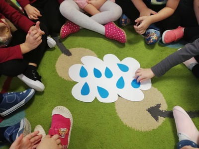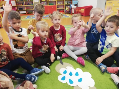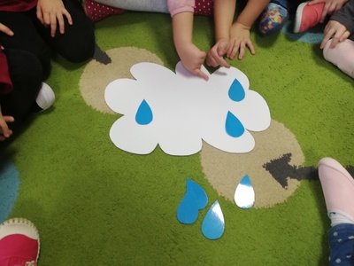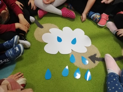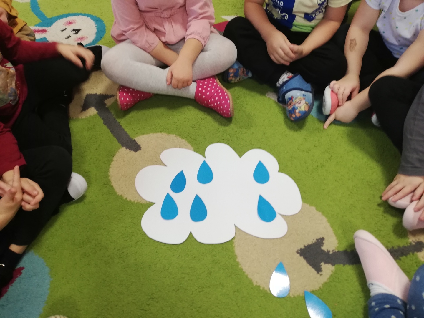 Dnia 13 listopada w grupie "Krasnoludki" został zrealizowany kolejny temat z projektu " Z Kicią Kocią maluchy zmieniają się w zuchy". Na początku pani wychowawczyni przeczytała krótkie opowiadanie pt. "Kicia Kocia i straszna burza", z której dzieci dowiedziały sie jak trzeba zachowywać się podczas burzy. Następnie przedszkolaki zapoznały się ze sposobami spędzania czasu kiedy na dworze pada deszcz. Kolejno dzieci przeliczały deszczowe kropeli, podziwiały powstający deszcz w słoiku oraz pomalowały dużą kroplę farbą plakatową.