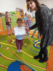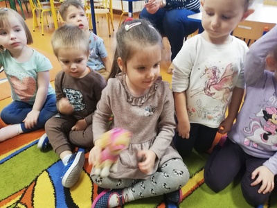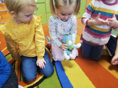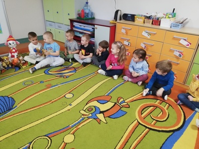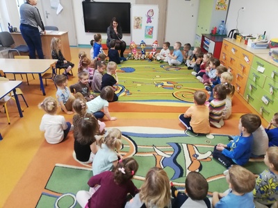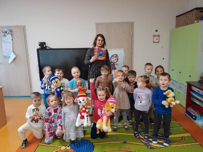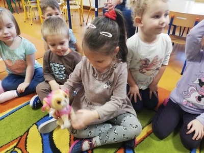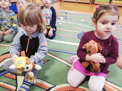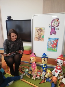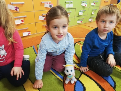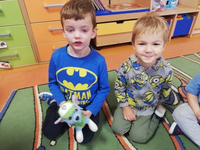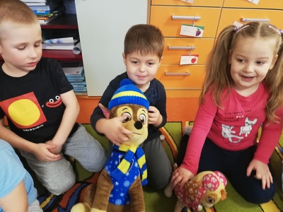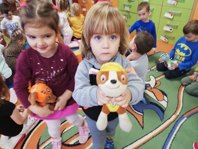 Dnia 14 listopada w grupach "Krasnoludki" i "Muchomorki" zostało zrealizowane spotkanie z cyklu "Rodzic czyta - dziecko słucha". Nasze przedszkole odwiedziła Pani Patrycja, mam Ariany, która przeczytała książkę pt. "Psi Patrol pomaga na farmie". Dzieci z uwagą wysłuchały opowiadania a następnie odpowiadały na zadawane pytania. Pani Patrycja przyniosła ze sobą maskotki Chase, Marshalla, Rubbla, Zumy i Sky, wzbudzając tym zachwyt naszych przedszkolaków. Każde dziecko chciało pobawić się wybraną przez siebie maskotką.