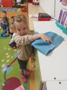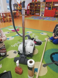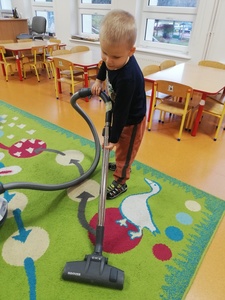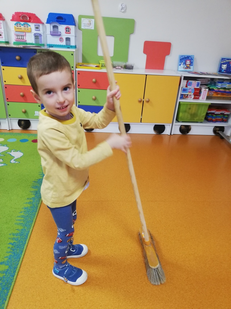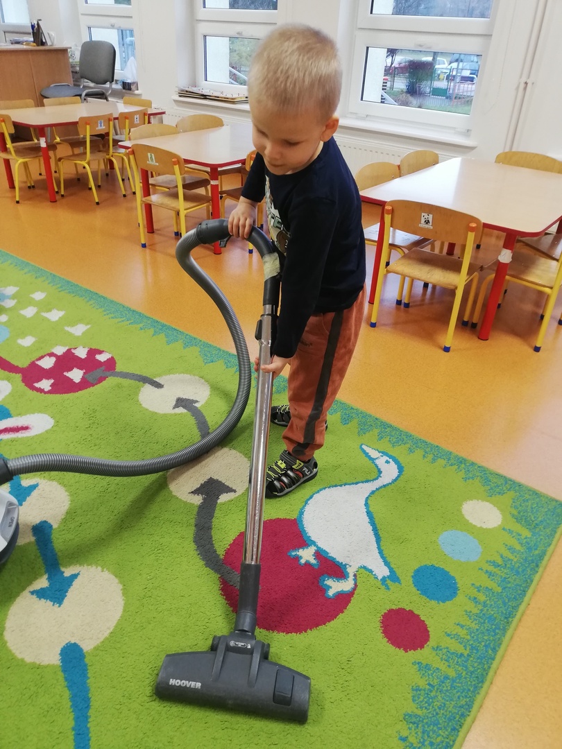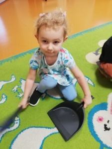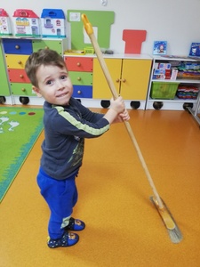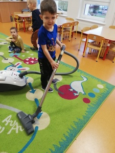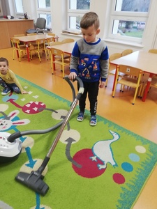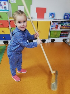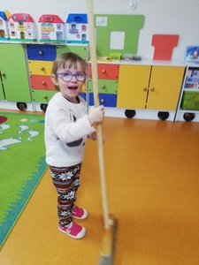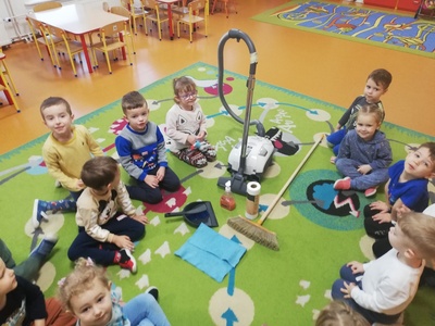 Dnia 23 listopada w grupie "Krasnoludki" został zrealizowany kolejny temat pt. "Kicia Kocia sprząta" z projektu "Z Kicią Kocią maluchy zmieniają się w zuchy". Dzieci wysłuchały opowiadania z którego dowiedziały się kiedy i dlaczego powinny sprzątać. Następnie przedszkolaki zapoznały się z urządzeniami służącymi do porządkowania pomieszczeń, które mogły wypróbować.