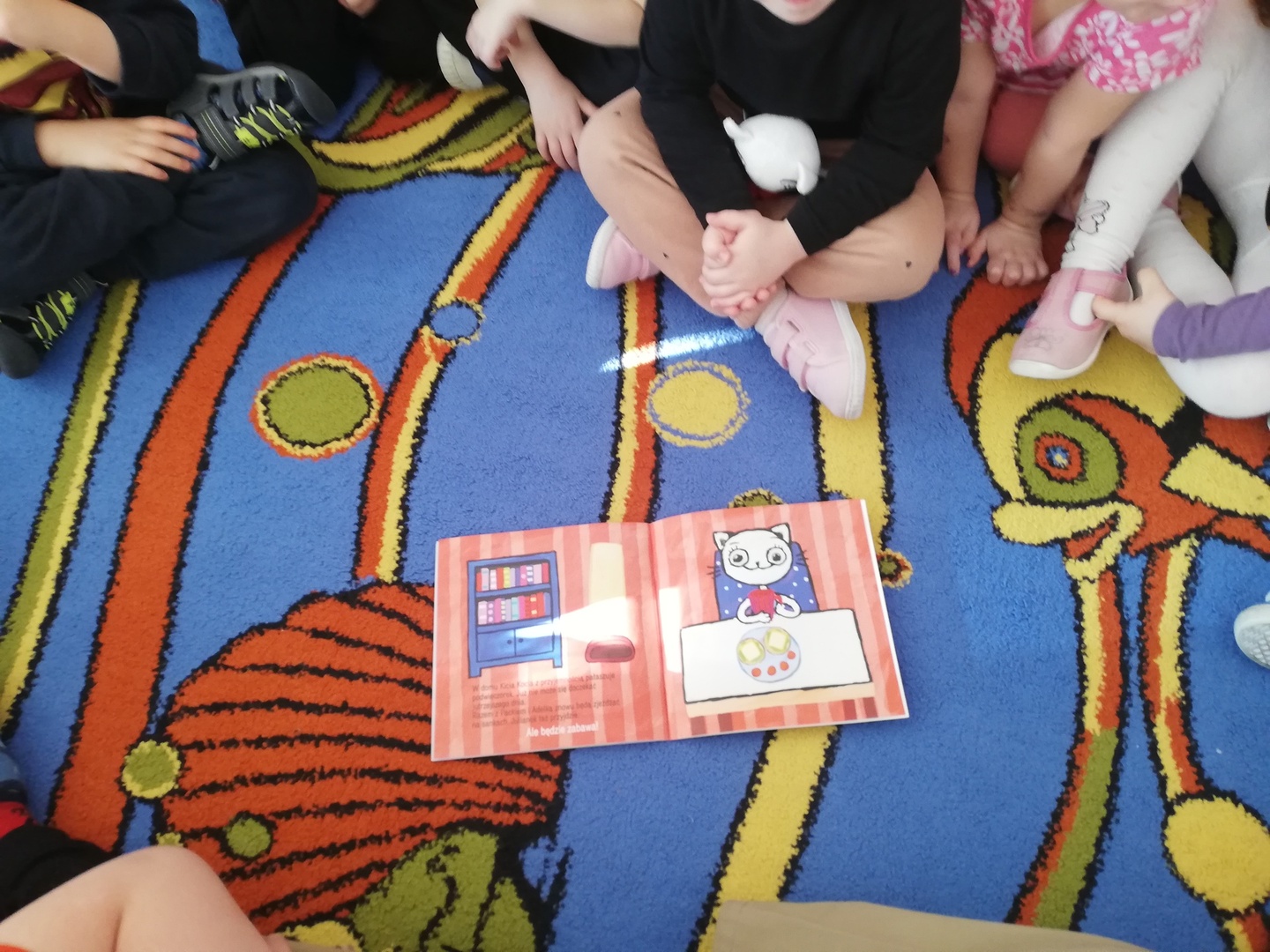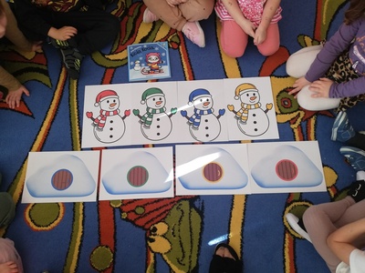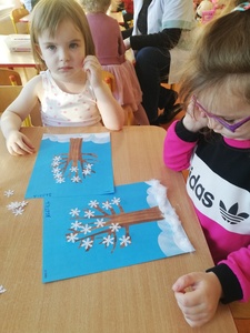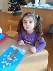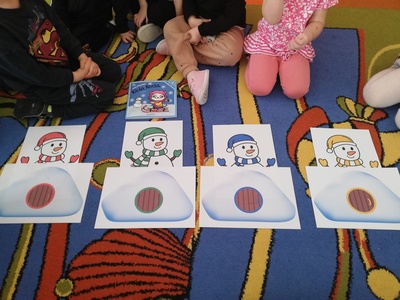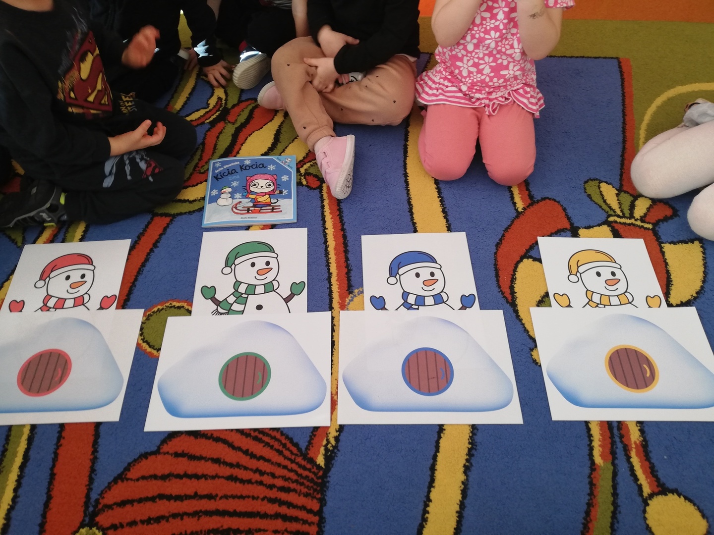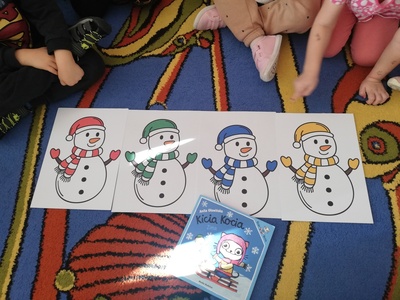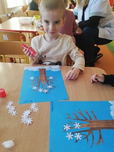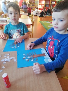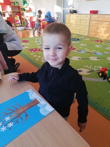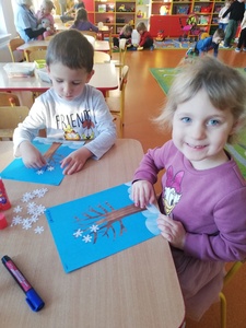 Dnia 8 stycznia grupa "Krasnoludki" zrealizowała kolejny temat z programu edukacyjnego "Z Kicią Kocią maluchy zmieniają się w zuchy" pt. "Zima". W pierwszej kolejności pani wychowawczyni przeczytała dzieiciom krótkie opowiadanie na temat którego odbyła się pogadanka. Następnie przedszkolaki przeliczały, grupowały i uczyły się kolorów. Na zakończenie tematu Krasnoludki wykonały pracę plastyczną "Zimowe drzewko".