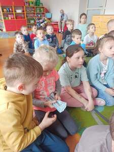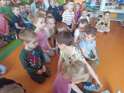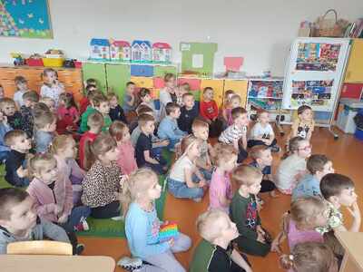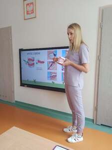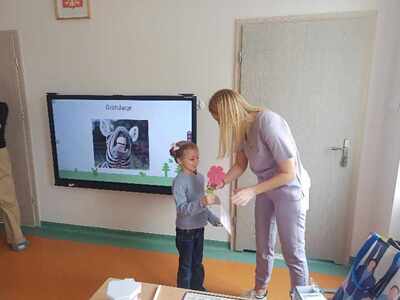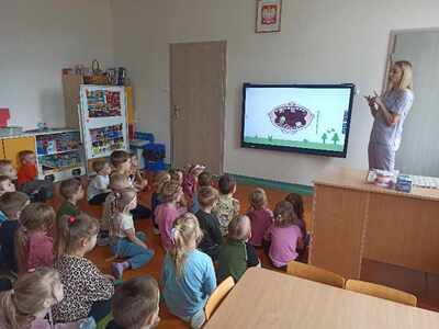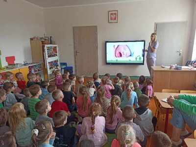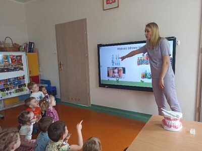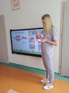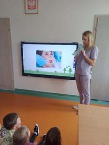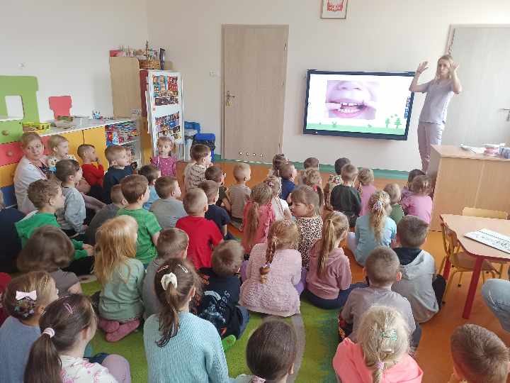 Dnia 12.04.2024r. do naszego przedszkola przyszła pani stomatolog Joanna Mikołajczyk, która w ciekawy sposób opowiedziała przedszkolakom o profiklaktyce i higienie jamy ustnej. Dzieci dowiedziały się w jaki sposób i jak długo prawidłowo czyścić zęby. Pani Asia zaciekawiła dzieci modelem szczęki, na którym zaprezentowała prawidłowe mycię zębów. Przedszkolaki z zainteresowaniem wysłuchały pani doktor i aktywnie odpowiadały na zadawane pytania. Serdecznie dziękujemy Pani Joannie za profesjonalne przeprowadzenie zajęć oraz wręczenie dzieciom upominków w postaci naklejek.