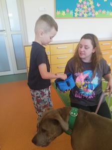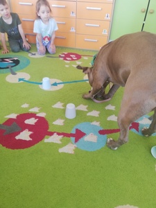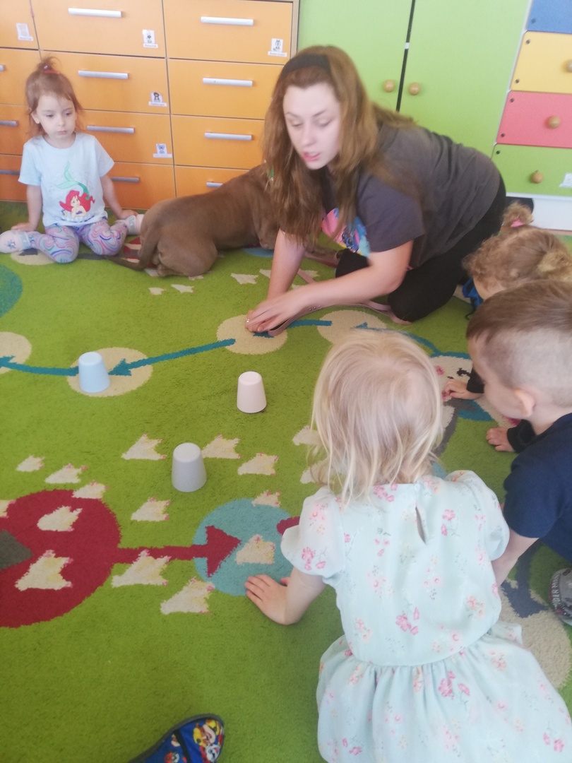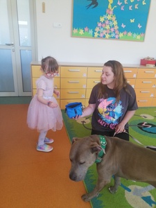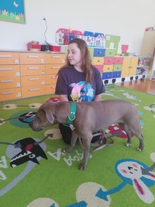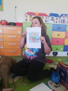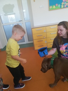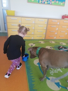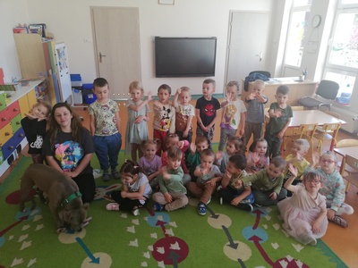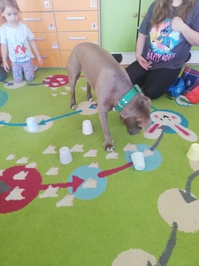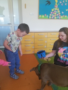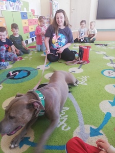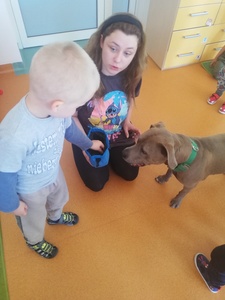 Dnia 14 maja grupę Krasnoludki odwiedziała Pani Marika Kopeć, mama Oktawii. Pani Marika jest psim behawiorystą czyli osobą , która pomaga znaleźć wspólny język opiekunowi jak i jego pupilowi. W czasie spotkania dzieci dowiedziały się jaką rolę odgrywa pies w społeczeńtwie, na czym polega praca psiego behawiorysty oraz jakich zasad trzeba przestrzegać w trakcie zabaw ze swoim ulubionym zwierzaczkiem. Podczas zajęć przedszkolaki mogły doświadczyć łagodności pieska oraz jego cierpliwości. Dzieci dowiedziały się również czym jest mowa ciała psa czyli najważniejsze sygnały: chęć zabawy, strach i agresja. Wizyta wniosła wiele radości w zycie grupy. Z całego serca dziękujemy Pani Marice za piękną lekcję.