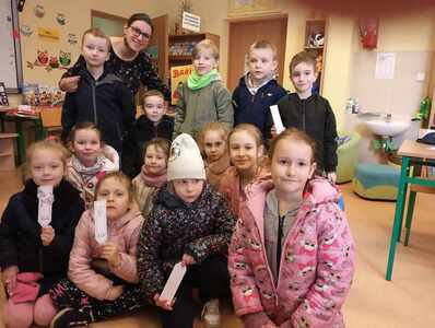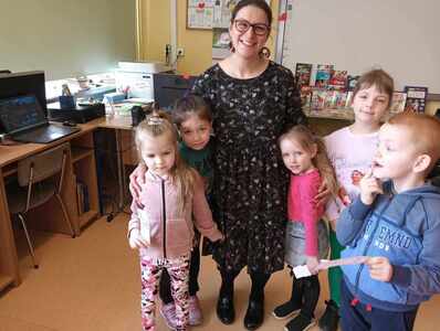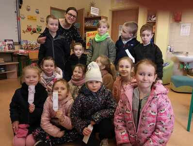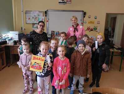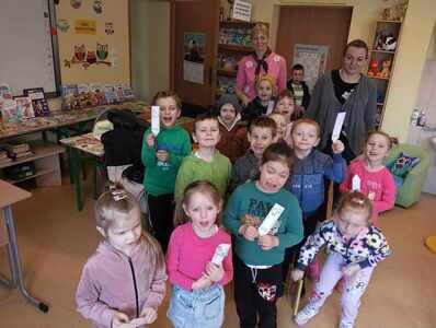 25 kwietnia 2024r. dzieci z grupy "Biedronki" i "Deszczowe Kropelki" odwiedziły bibliotekę w Szkole Podstawowej im. Lotników Polskich w Mirosławcu. Przedszkolaki dowiedziały się jak należy się w niej zachować oraz poznały zasady wypożyczania książek. Pani Basia pokazała dzieciom, gdzie znajduje się przeznaczony specjalnie dla nich regał z książkami. Następnie zaprezentowała i dała do obejrzenia przedszkolakom wybrane dla nich propozycje. Dzieciom bardzo spodobały się kolorowe i bogato ilustrowane książeczki, które z chęcią oglądały. Spotkanie odbywało się w miłej, pełnej uśmiechów i wrażeń atmosferze.