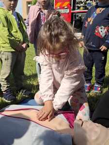 Dzieci uczyły sie udzielania pierwszej pomocy i oczywiście miały możliwość "gaszenia pożaru". Wszyscy byli pod dużym wrażeniem. Z pewnością wielu chłopców marzy, by w przyszłości zostać strażakiem. Spotkanie zakończyło się pamiątkowym zdjęciem i wręczeniem podziękowań.