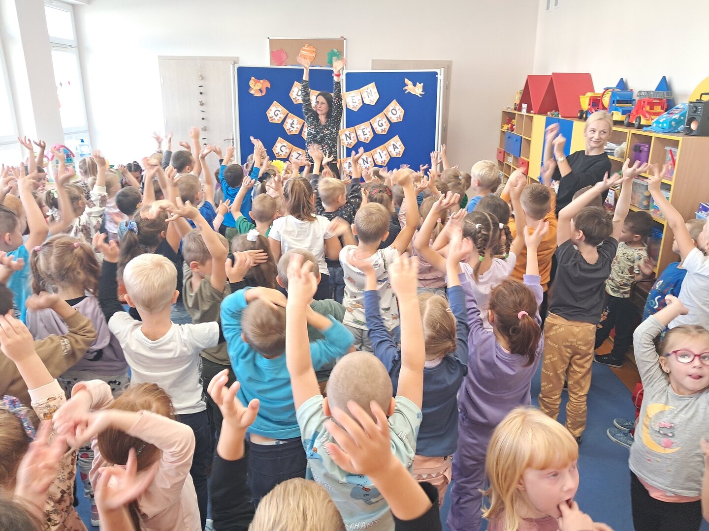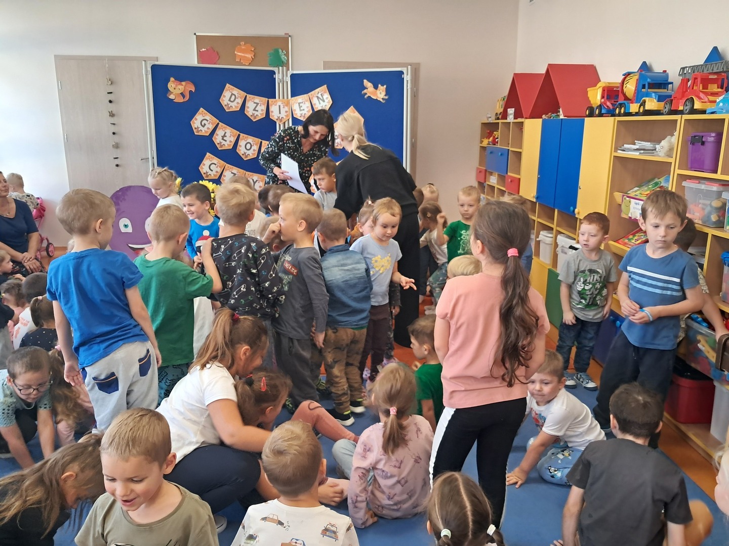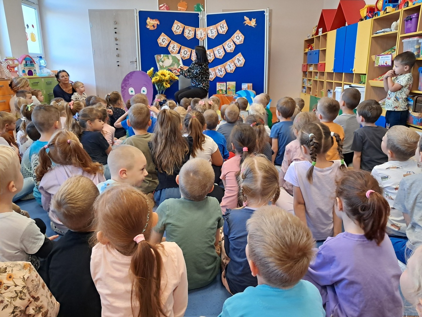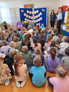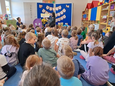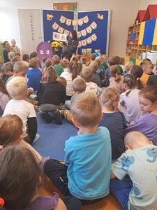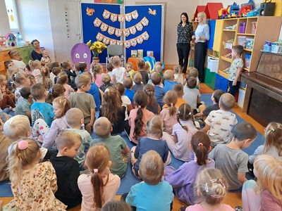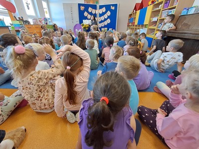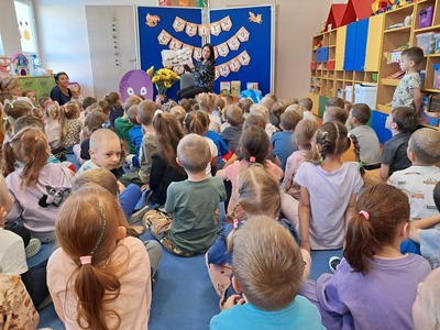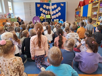 27 września, w ramach realizacji Narodowego Programu Rozwoju Czytelnictwa, obchodziliśmy Dzień Głośnego Czytania. Z tej okazji zaprosiliśmy do przedszkola Panią Monikę pracującą w Bibliotece Miejskiej w Mirosławcu, która przeczytała dzieciom piękne bajki pt.: "Poczwarka" oraz "Jak przepraszać". Nie zabrakło również wspólnej zabawy przy piosence o samogłoskach. Dzieciom bardzo podobało się spotkanie z Panią Moniką i obiecały, że będą przychodziły do biblioteki wypożyczać ciekawe książki.