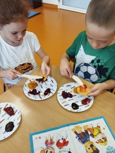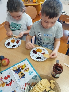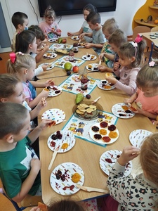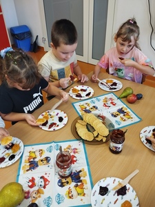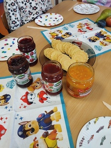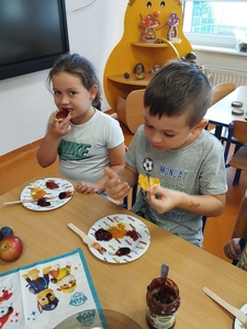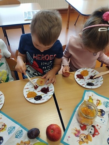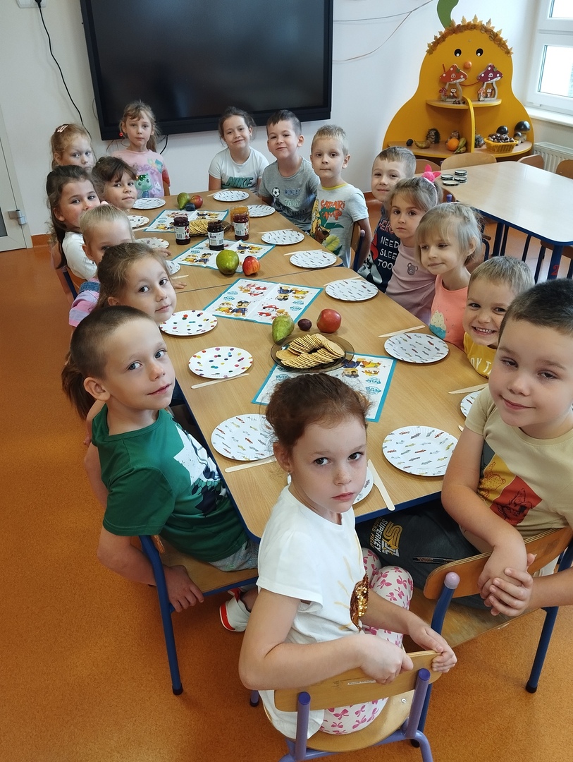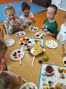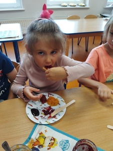 W czwartek tj 3 pażdziernika przedszkolaki z grupy Desczowe Kropelki poznawały przetwory owocowe takie jak: dżemy , konfitury i powidła.  Wsród nich znalazły się dżemy truskawkowe, wiśniowe , powidła śliwkowe i konfitura z brzoswiń. Dzieci rozpoznawały za pomocą zmysów smaki, kolry przetworów i ich zapachy. Następnie zrobiły pyszne przękąski owocowe, smarowały wafle wybranym przez siebie ulubionym dżemem owocowym.  To był smaczny dzień.