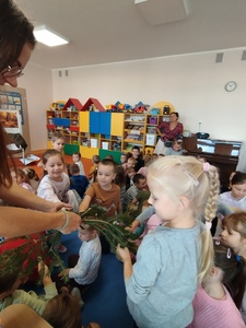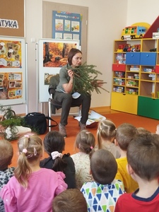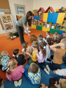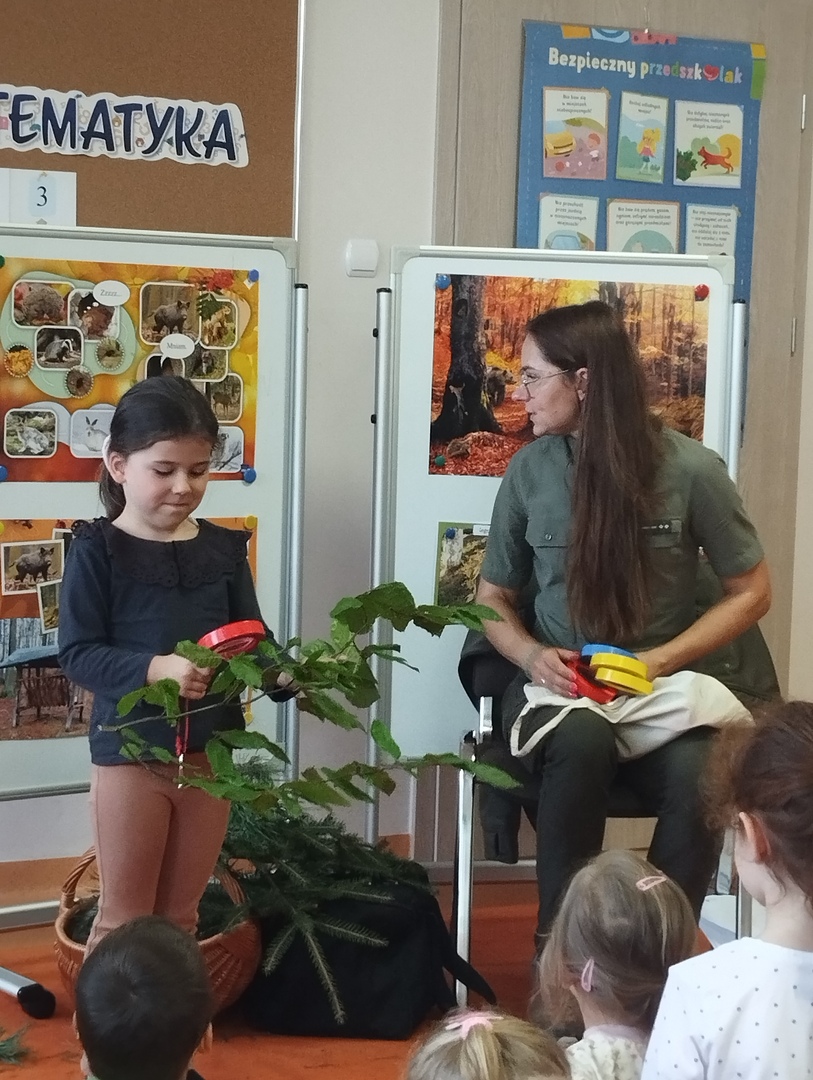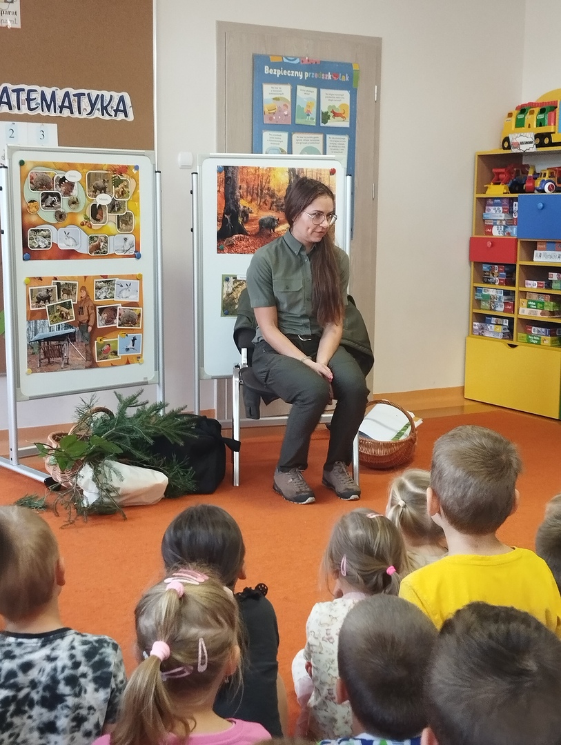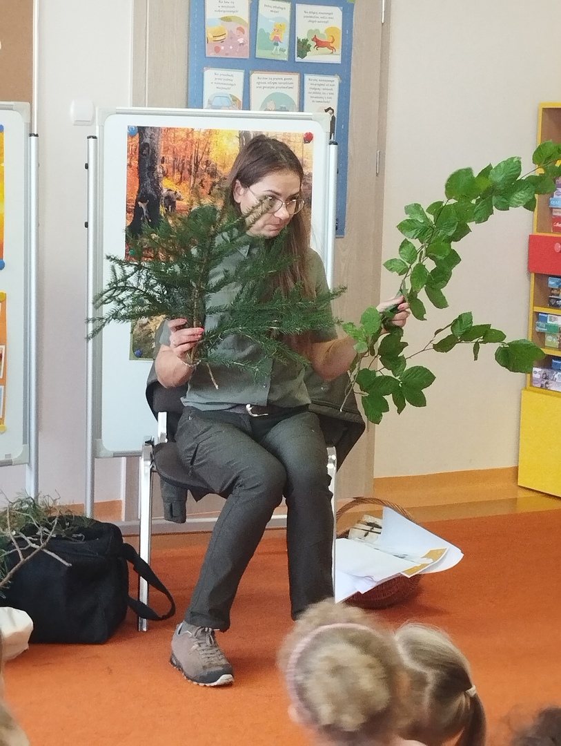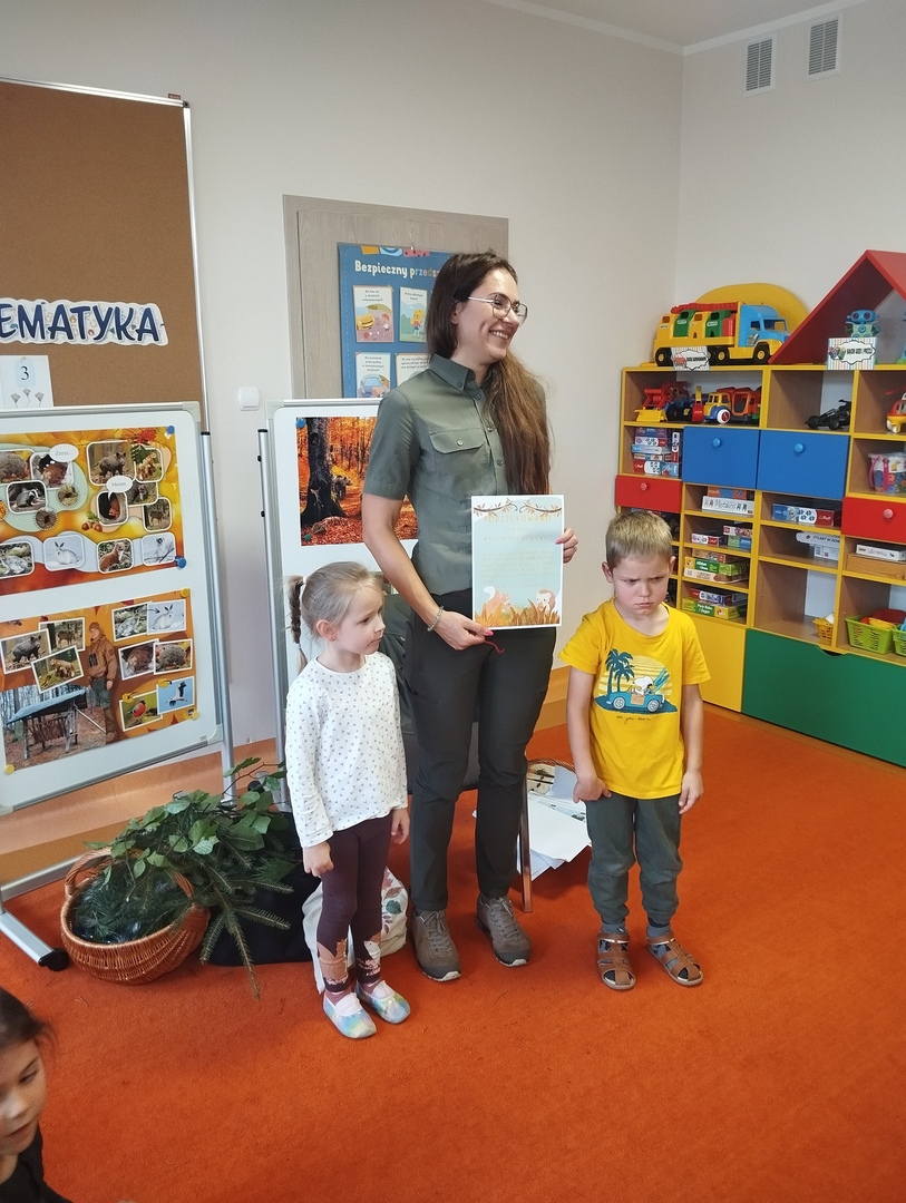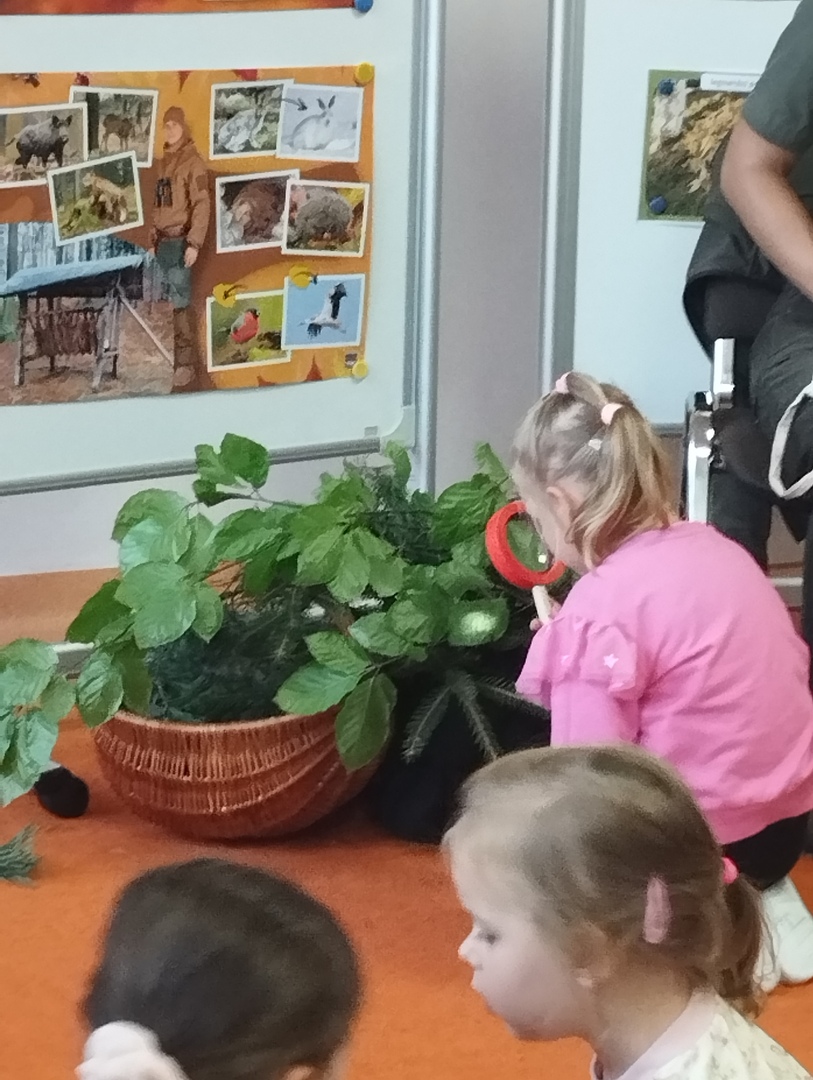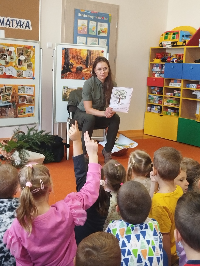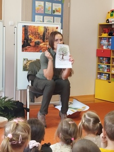 10 października z okazji ,,Święta Drzewa" nasze przedszkole odwiedziła pani Małgorzata Butkiewicz  , pracowanik z Nadleśnictwa Mirosławiec. Dzieci z zaciekawieniem słuchały róznych cikowostek na temat zwierząt  żyjących w lesie, pogłębiały swoją wiedzę o drzewach, rozpoznawały gatunki drzew i ich owoce. Dowiedziały się rownież,że człowiek jest gościem w lesie , musi uszanować zwyczaje zwierząt i ptaków i umie się odpowiednio zachować w lesie..  Przedszkolaki wykonały również pracę plastyczną na ,,Dzień Drzewa".
