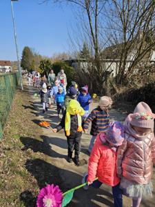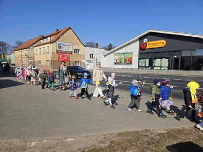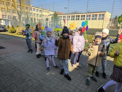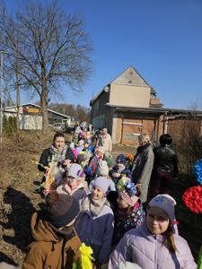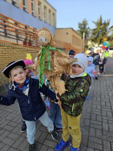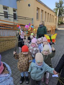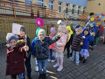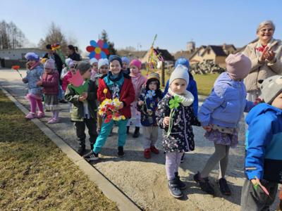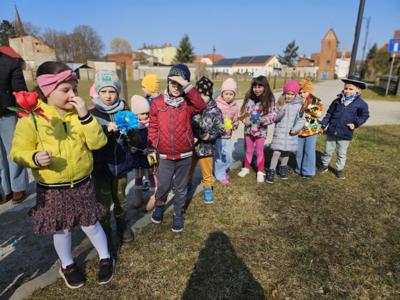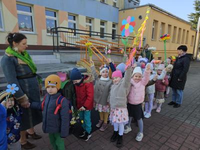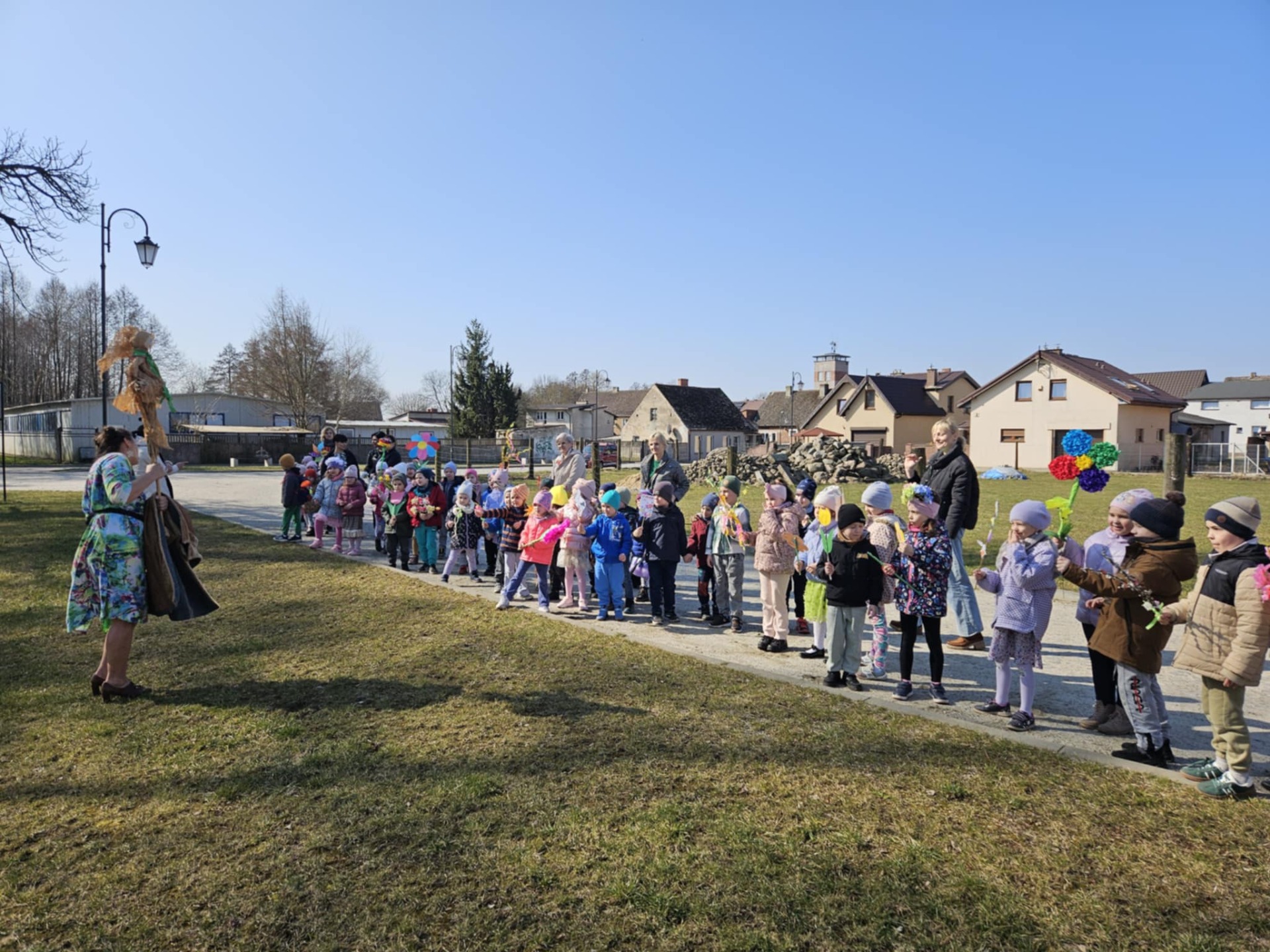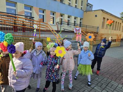 Następnie dzieci uczestniczyły w wiosennym korowodzie, podczas którego trzymały w rękach kolorowe kwiaty i własnoręcznie wykonane gałązki symbolizujące budzącą się do życia przyrodę. Przedszkolaki pożegnały Marzannę i powitały wiosnę.