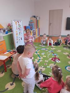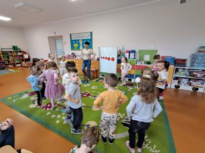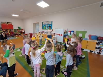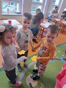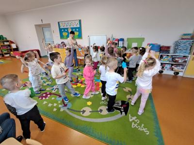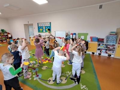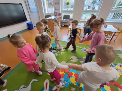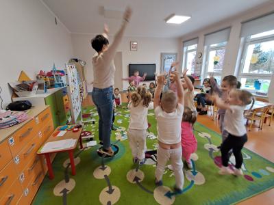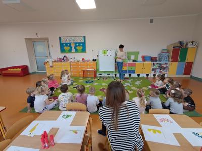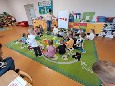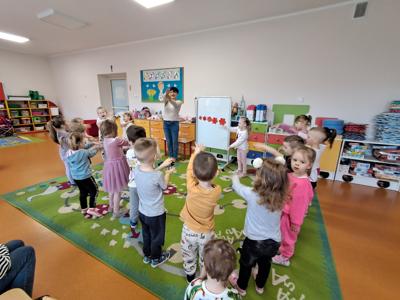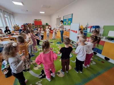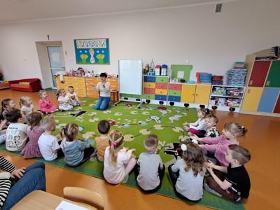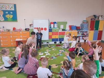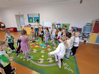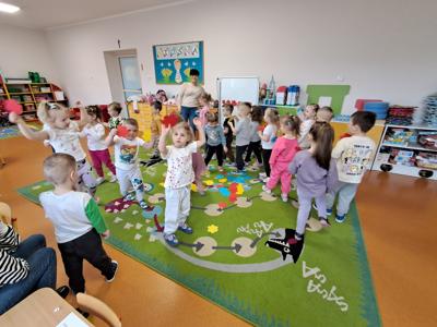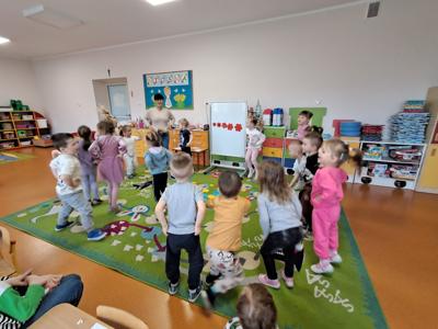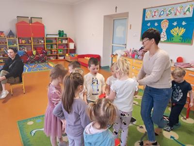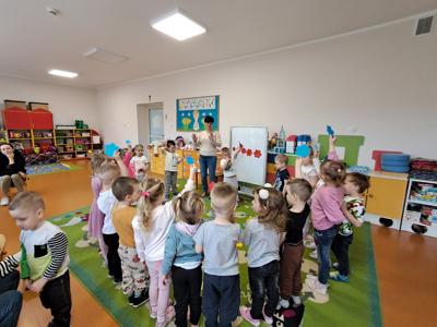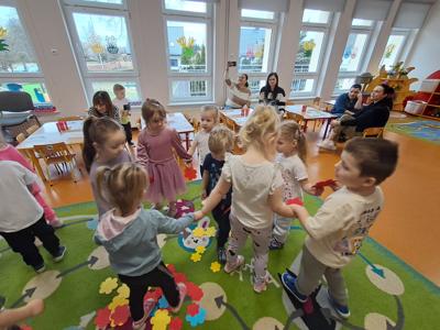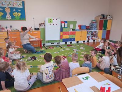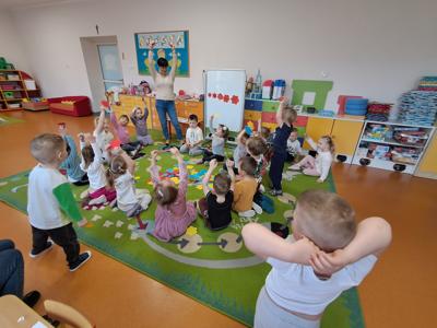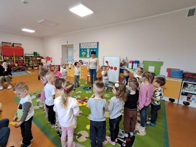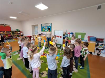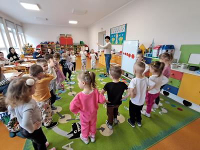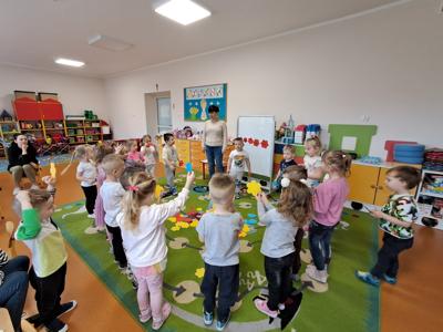 Nie zabrakło również aktywności muzyczno-ruchowej – dzieci zaśpiewały wiosenną piosenkę, ilustrując jej treść ruchem, co spotkało się z dużym entuzjazmem zarówno dzieci, jak i rodziców.