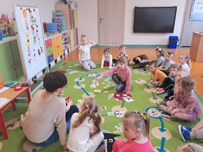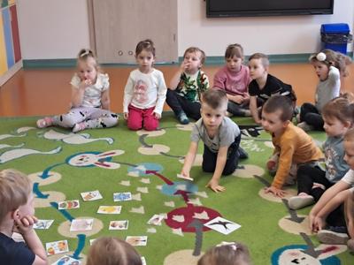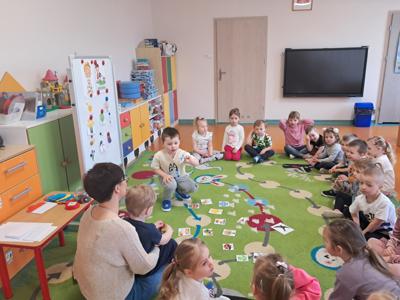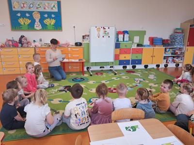 Zajęcia rozpoczęły się krótką rozmową kierowaną, podczas której dzieci miały okazję nazwać aktualną porę roku oraz opowiedzieć, jakie zmiany w przyrodzie zauważyły. Następnie przedszkolaki z dużym zaangażowaniem rozwiązywały wiosenne zagadki, ćwicząc logiczne myślenie i koncentrację.