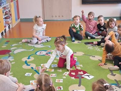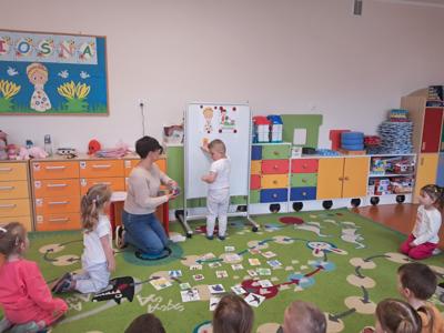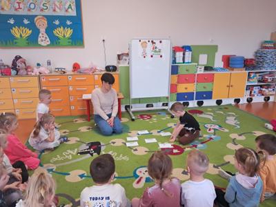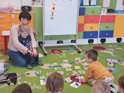 W kolejnej części zajęć dzieci dopasowywały ilustracje przedstawiające różne zjawiska i elementy przyrody do pory roku – wiosny. Zadanie to pozwoliło im na rozwijanie umiejętności analizy oraz klasyfikowania.
