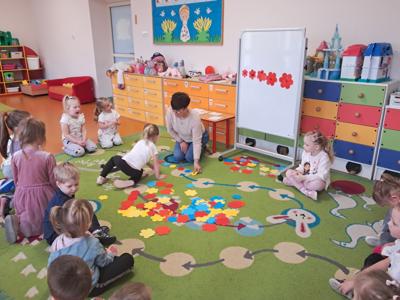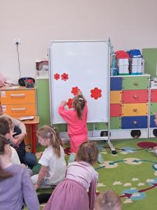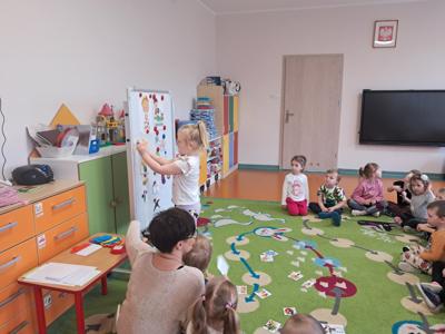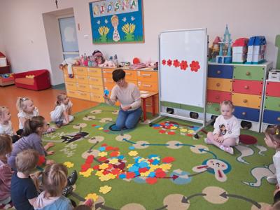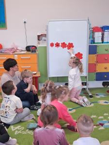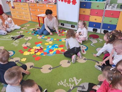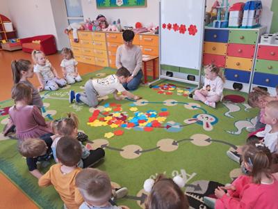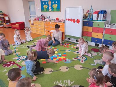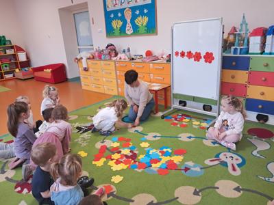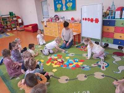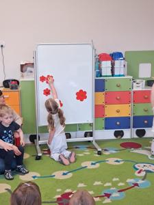 Krasnoludki miały również okazję wykazać się umiejętnościami matematycznymi – układały elementy (kwiaty, motylki) od najmniejszego do największego i odwrotnie, rozpoznawały kolory: żółty, czerwony, niebieski, a także tworzyły rytmy z wykorzystaniem kolorowych klocków.