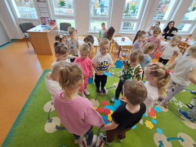 Na zakończenie zajęć dzieci układały obrazki z 3 lub 5 elementów, ćwicząc spostrzegawczość i koordynację wzrokowo-ruchową.
