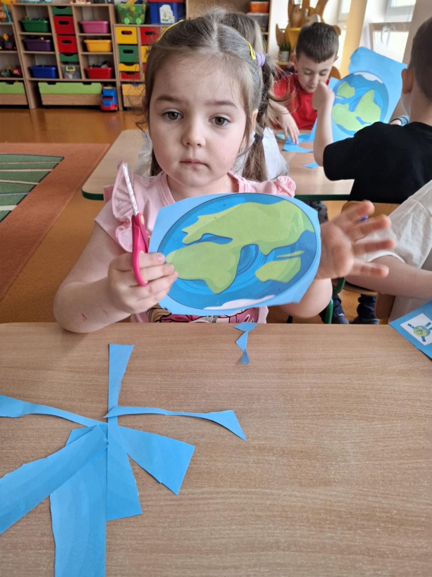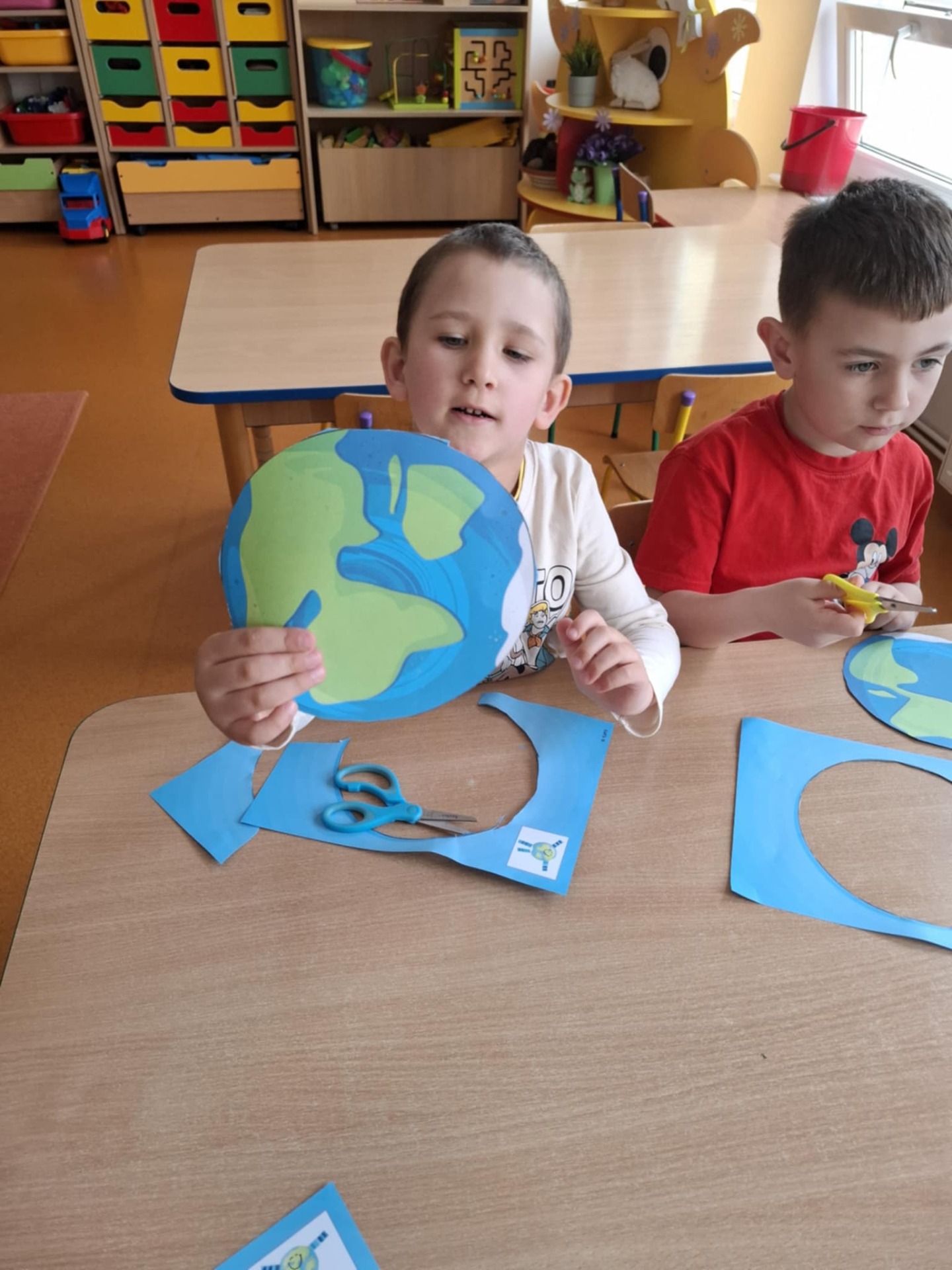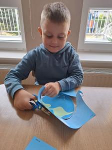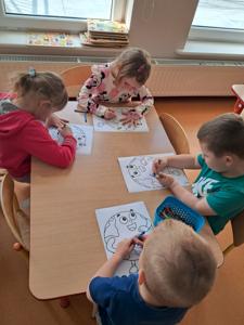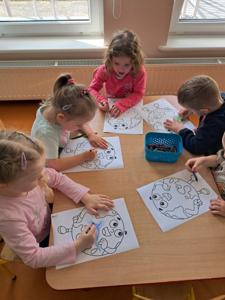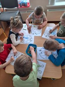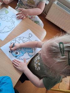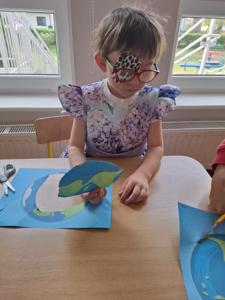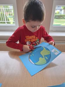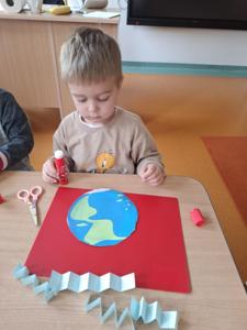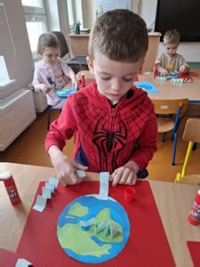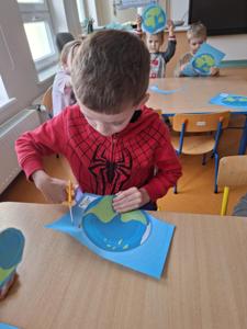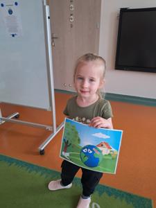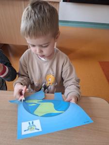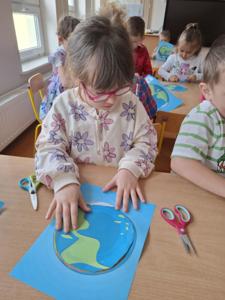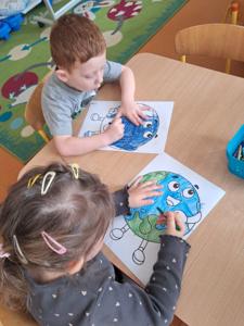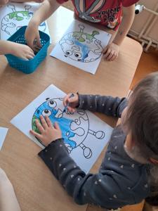Na zakończenie zajęć każdy przedszkolak pokolorował ilustrację przedstawiającą Ziemię – wesołą, uśmiechniętą planetę.
